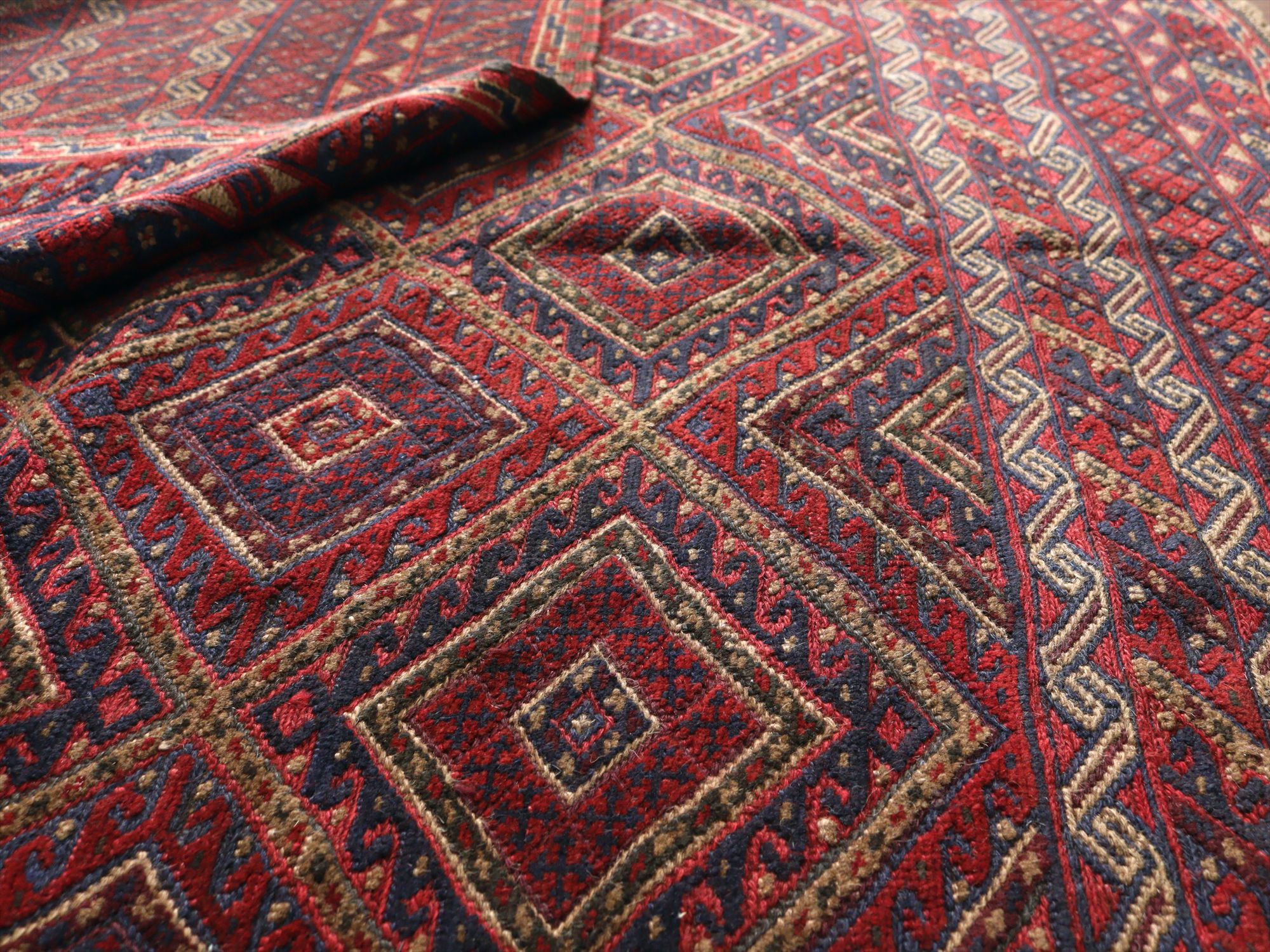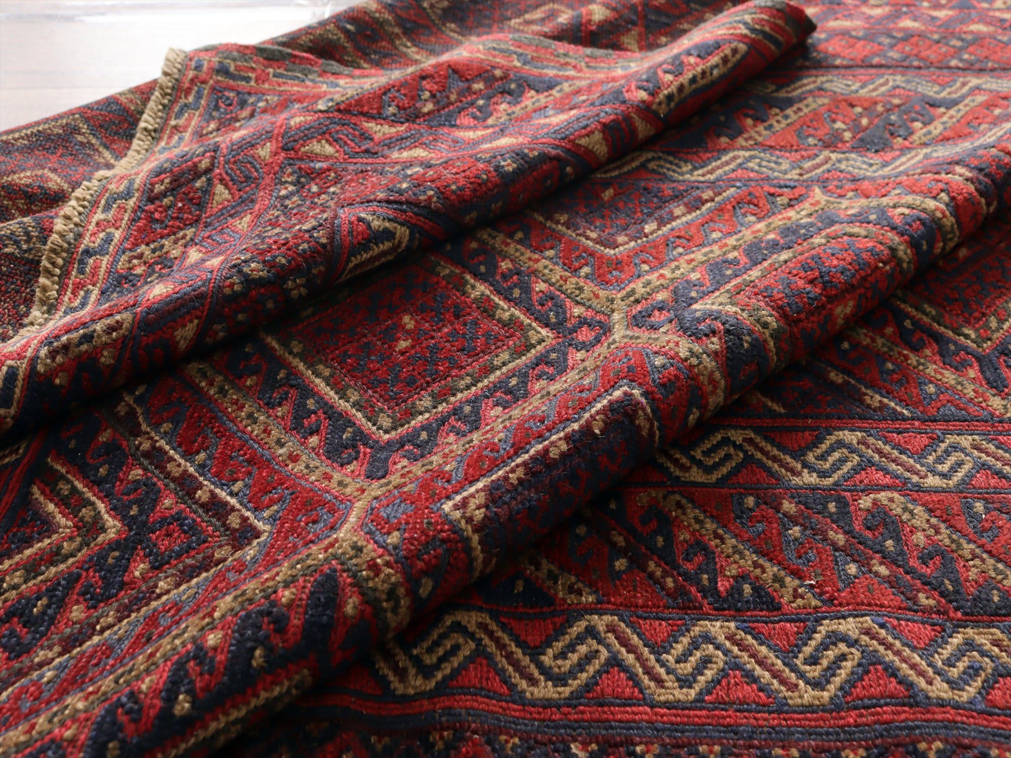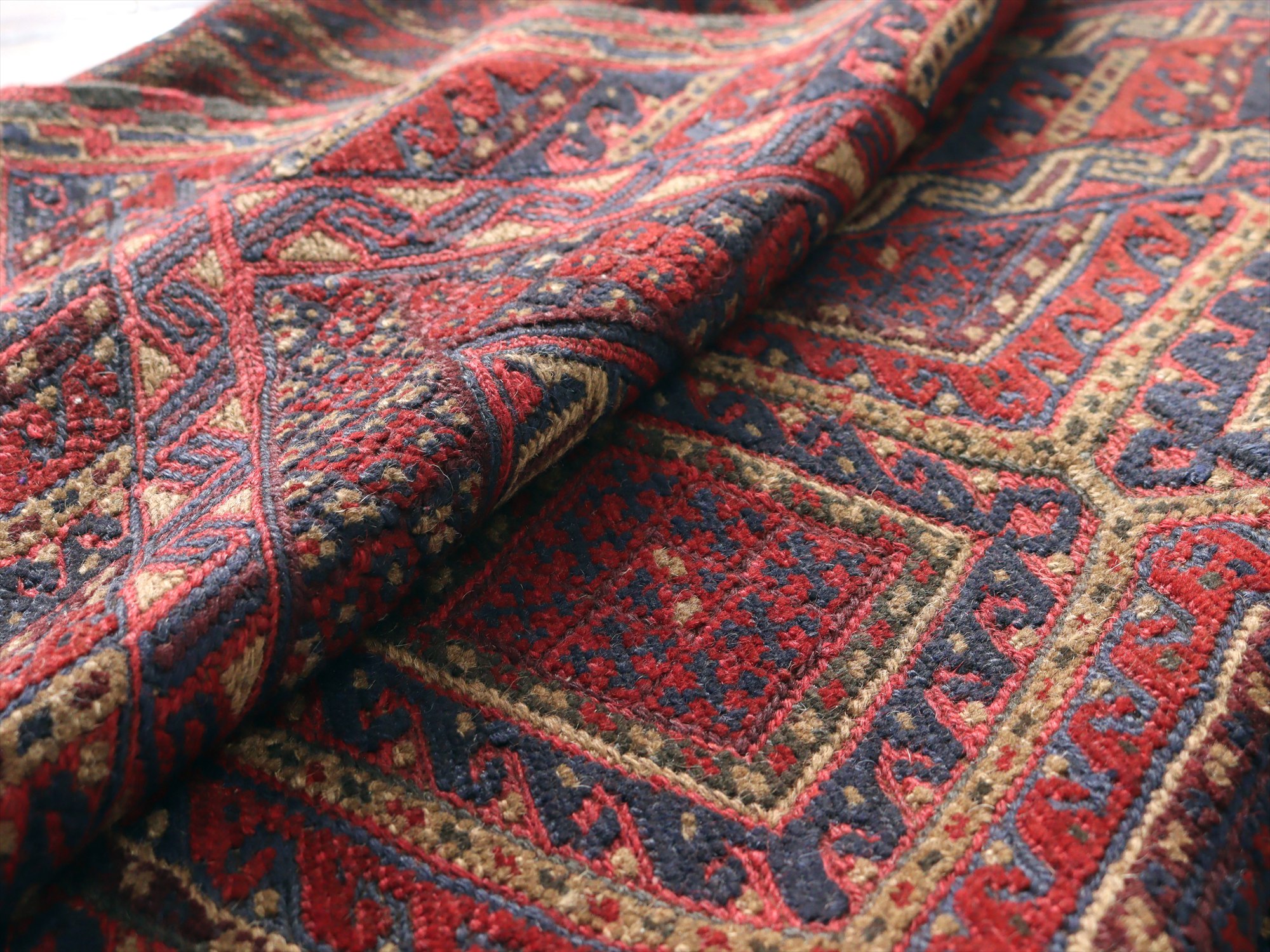 | アフガニスタン東部、イランと国境を接するエリアの緻密な織りのキリムです。細かい織り目のスマック織りをベースに、立体感のあるカーペット織りでモチーフをレリーフのように織り込んだ1枚。 |