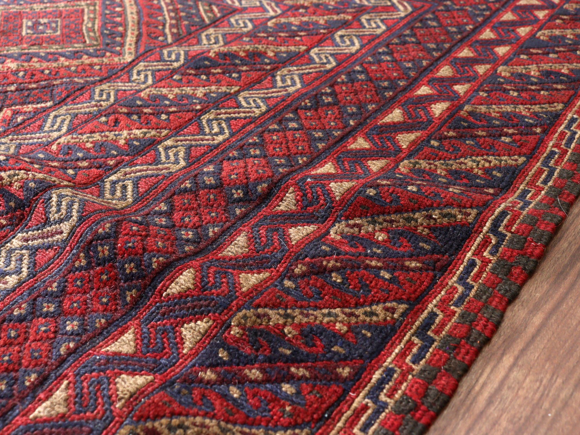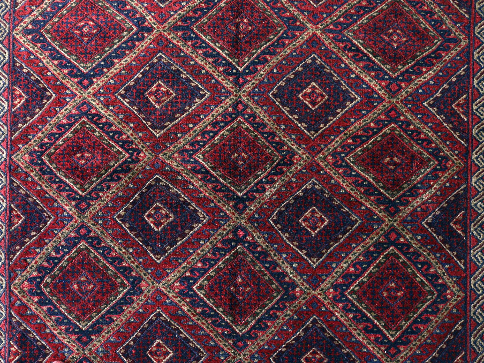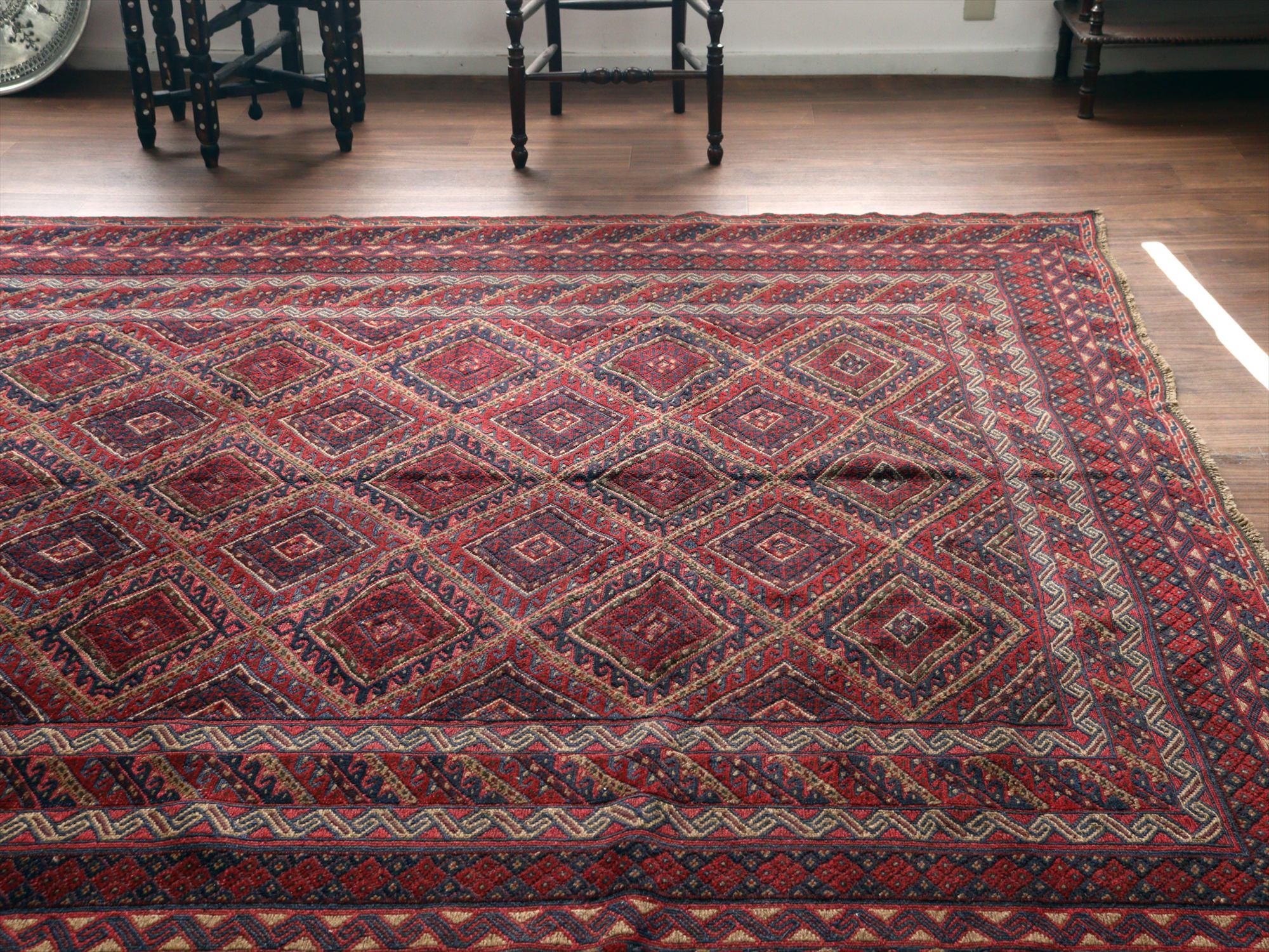| アフガニスタン東部、イランと国境を接するエリアの緻密な織りのキリムです。細かい織り目のスマック織りをベースに、立体感のあるカーペット織りでモチーフをレリーフのように織り込んだ1枚。 |