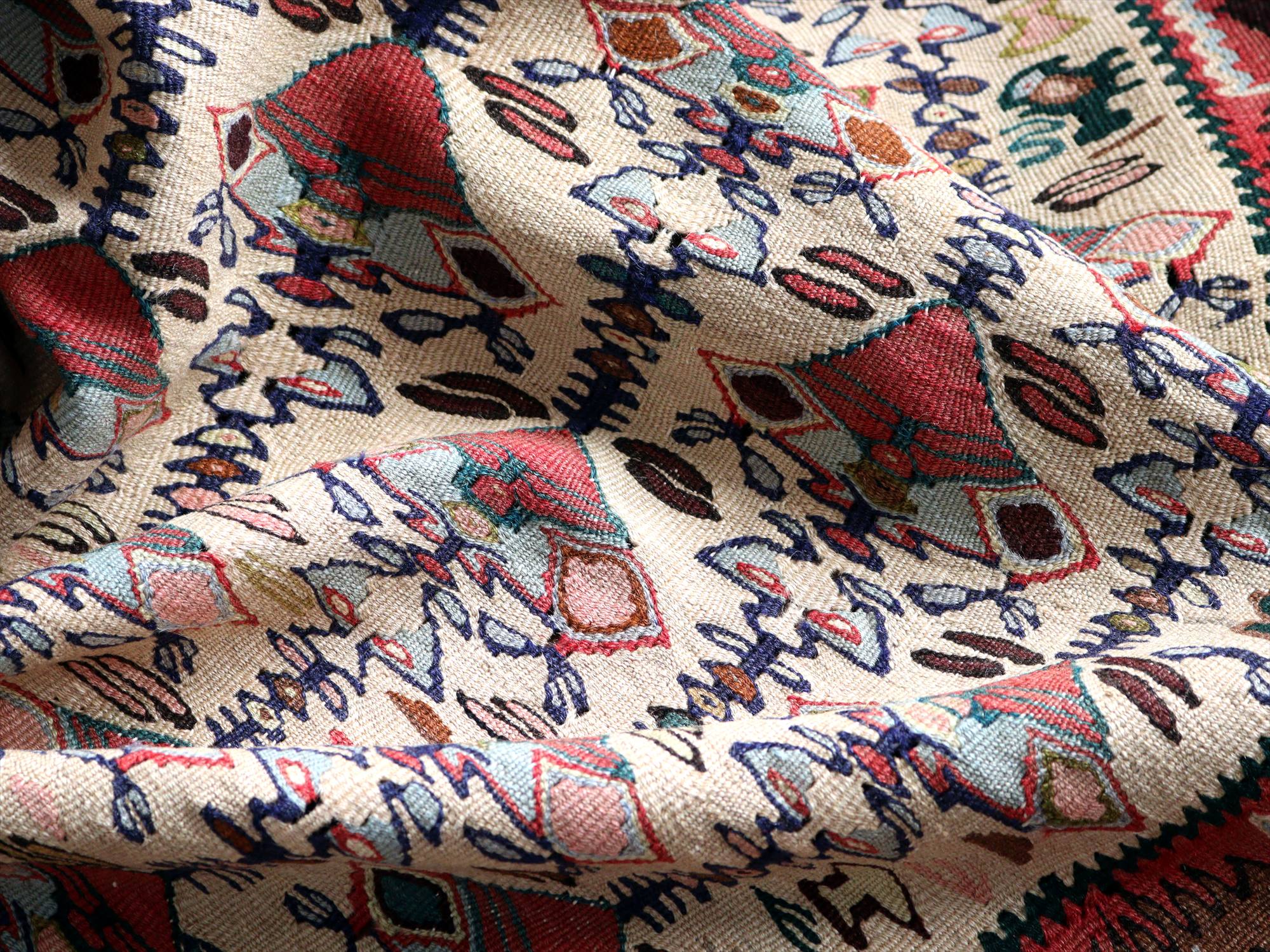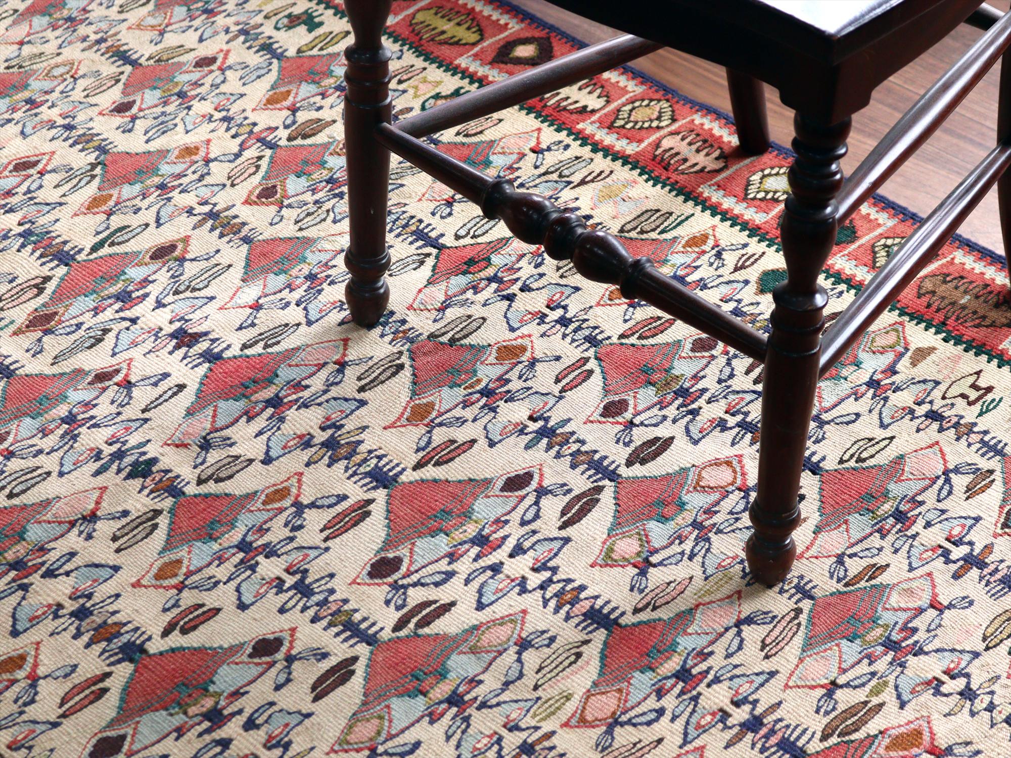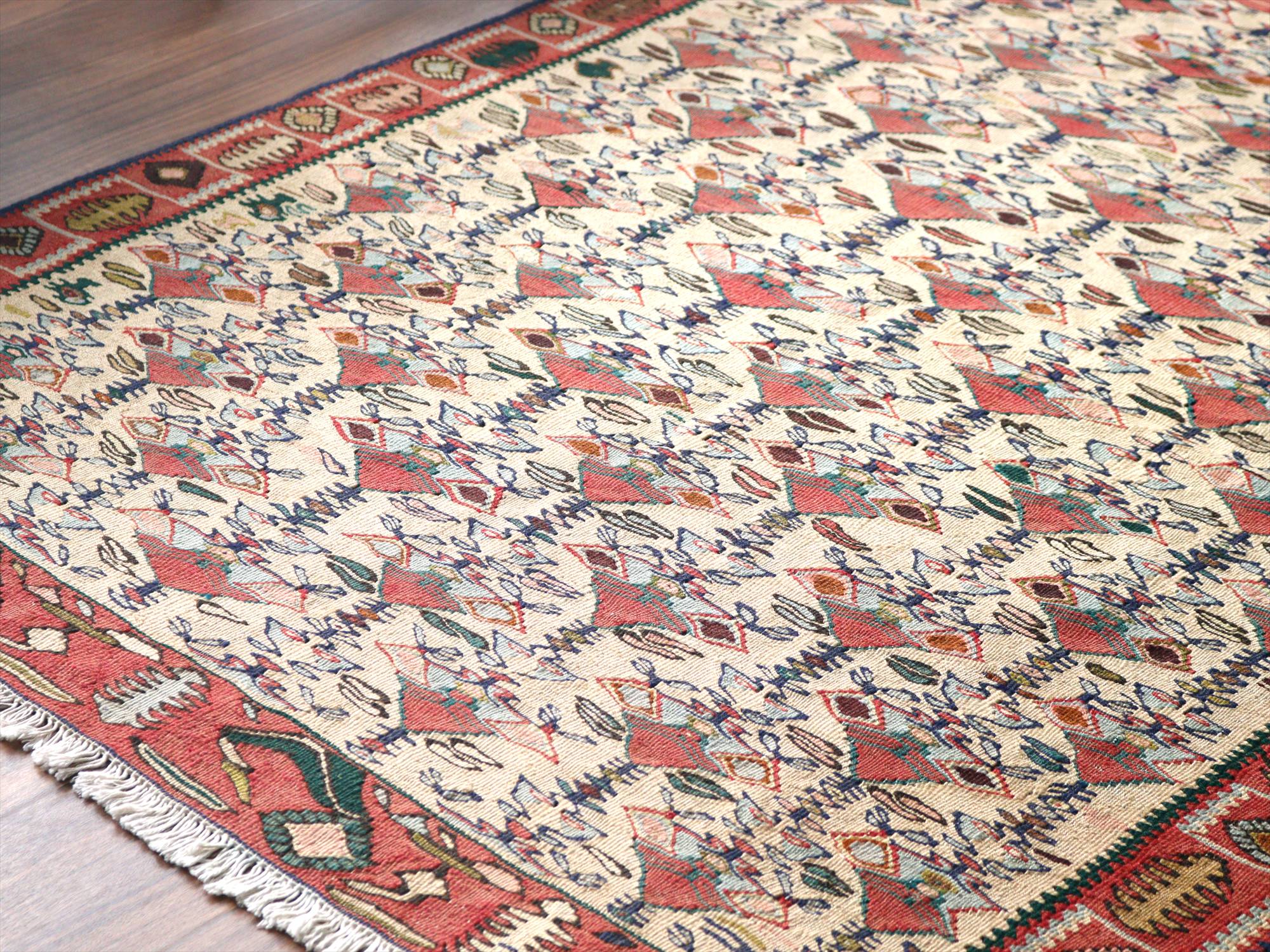 | アイボリーのベースに、花束のようなデザインが連なるように織られています。こちらは、イラン南西部、トルコとの国境に近いセネという町のキリムです。全面に隙間なく細かなモチーフが置かれているデザインはとても特徴的です。緻密で細かな織り、整ったモチーフ使いなど、交易品として織られたといわれる、セネ地方のキリムならではの特徴がよく出ています。 |