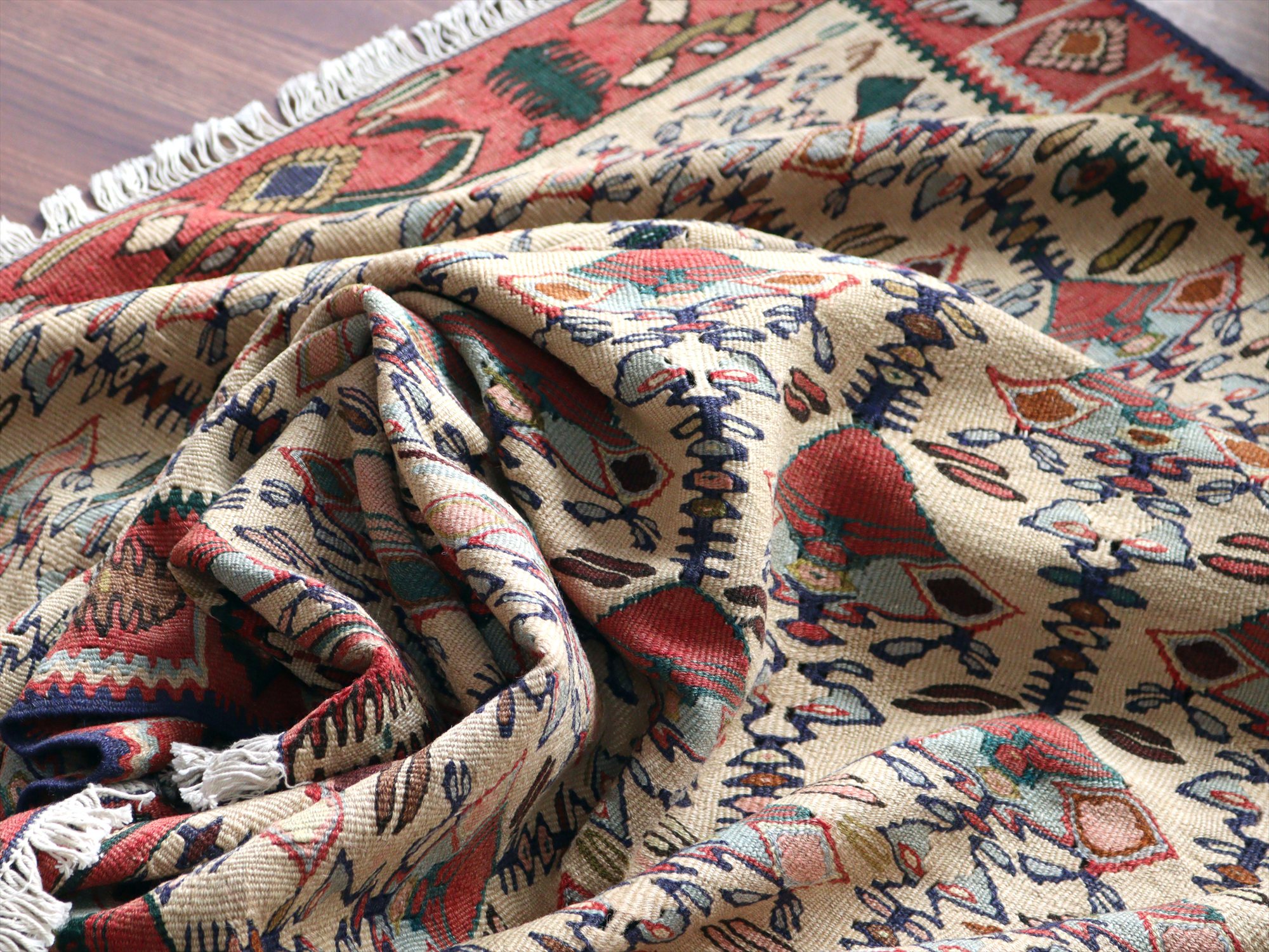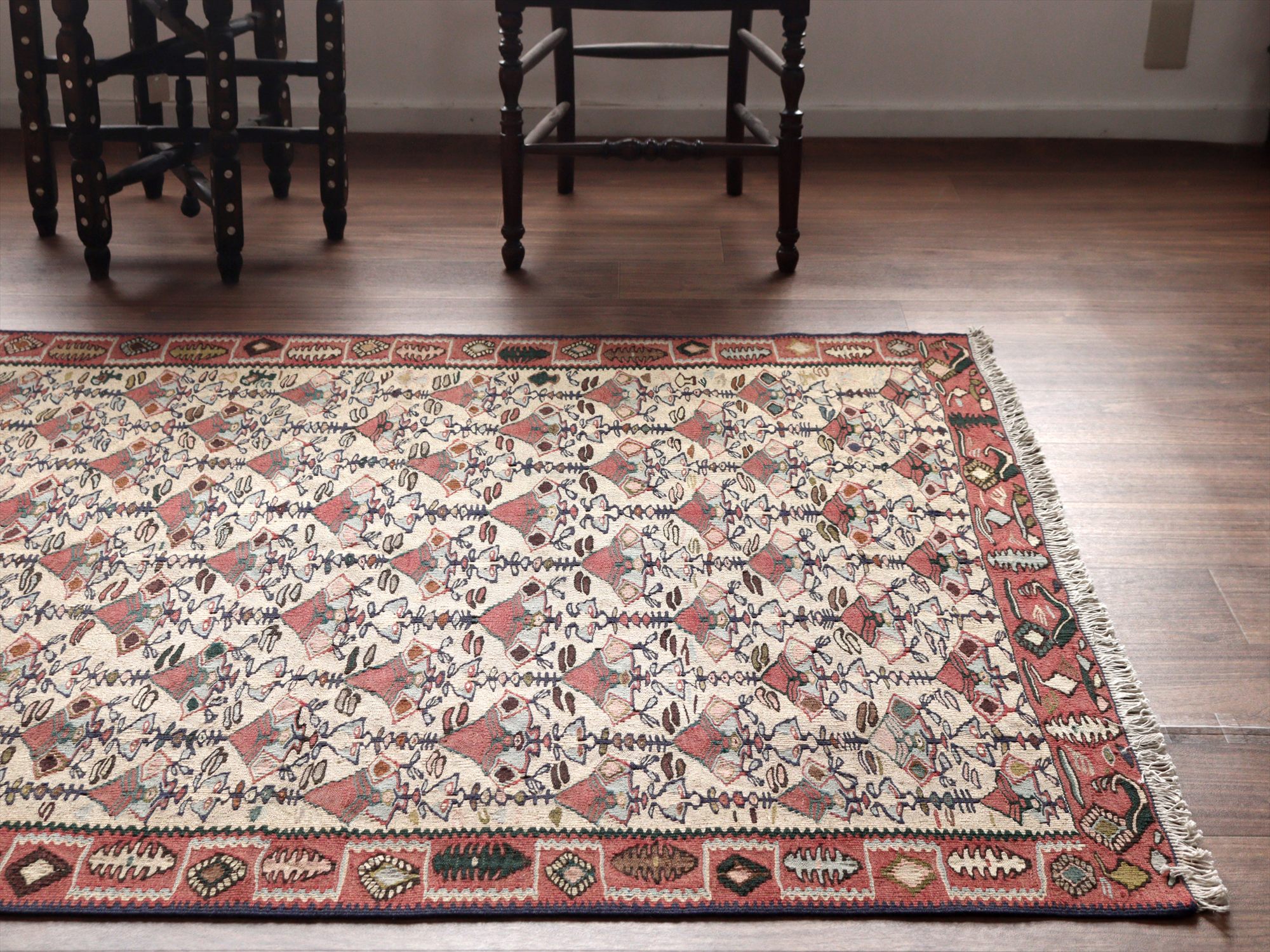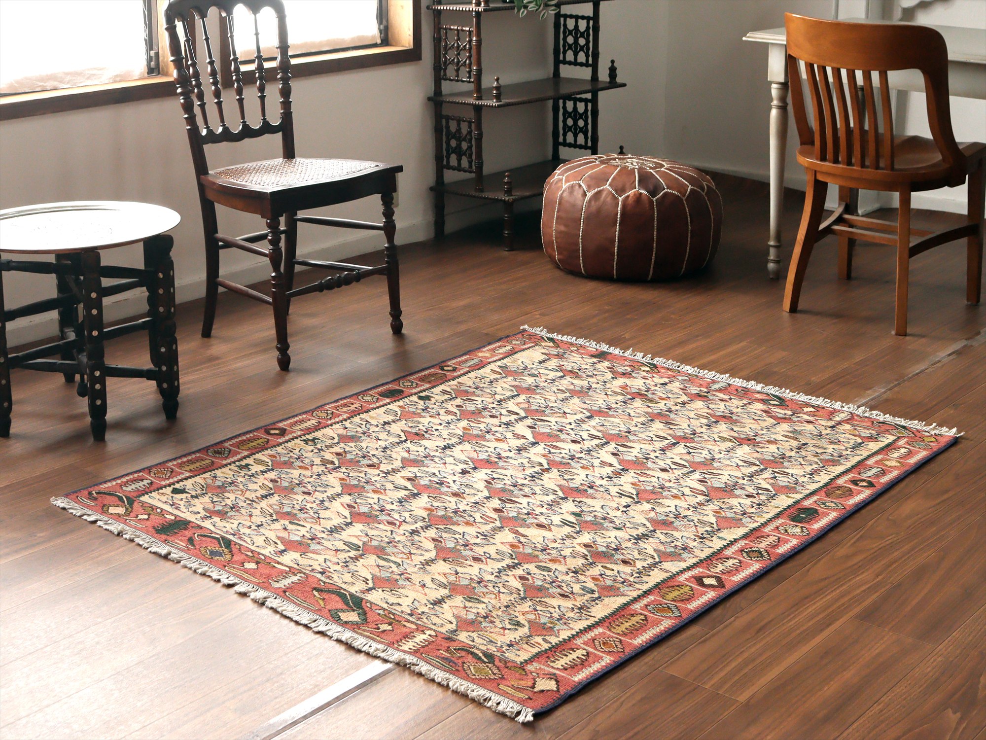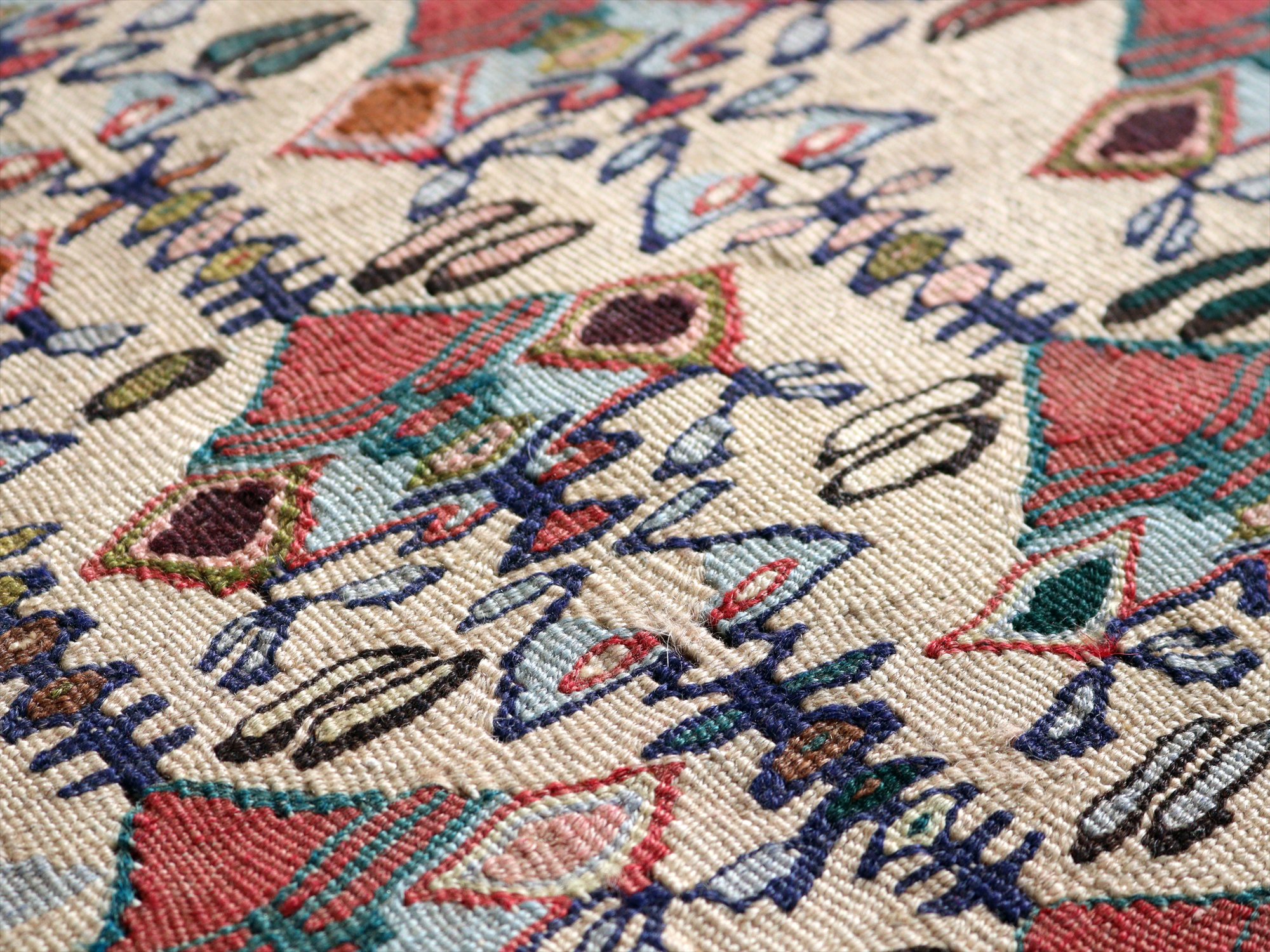 | アイボリーのベースに、花束のようなデザインが連なるように織られています。こちらは、イラン南西部、トルコとの国境に近いセネという町のキリムです。全面に隙間なく細かなモチーフが置かれているデザインはとても特徴的です。緻密で細かな織り、整ったモチーフ使いなど、交易品として織られたといわれる、セネ地方のキリムならではの特徴がよく出ています。 |