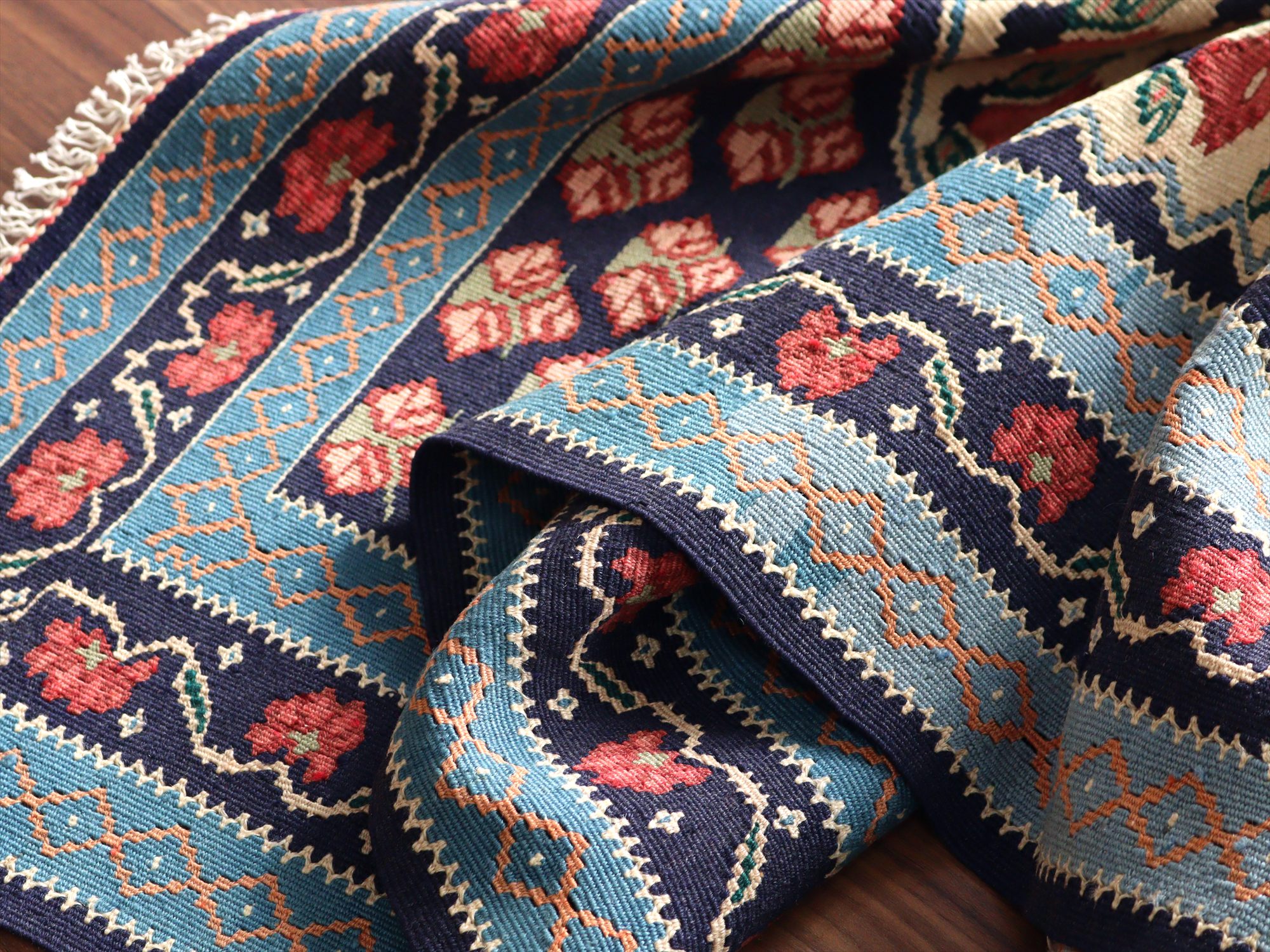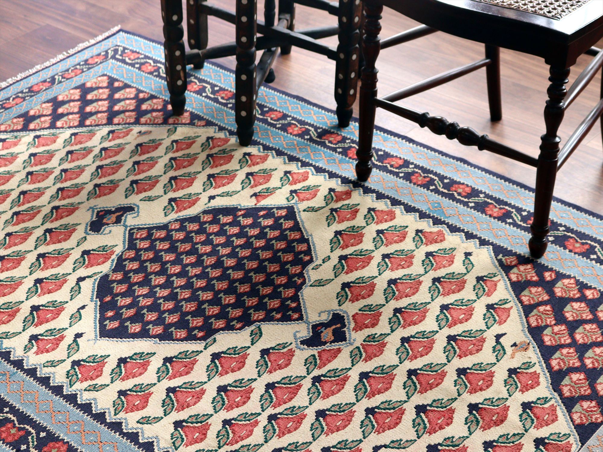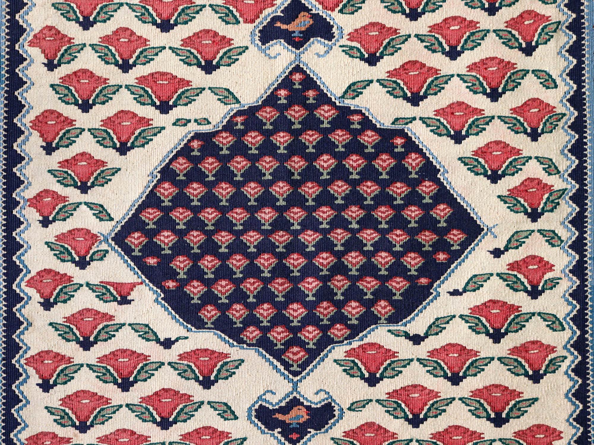 | 全体にに小さなピンクの花が並ぶ愛らしいモチーフ。イランの首都テヘランから、西に広がるビジャール地方の伝統柄です。メダリオンのかたちも特徴的です。 |