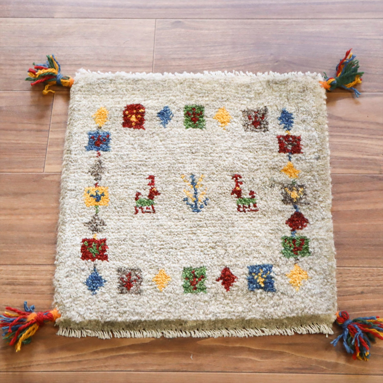 ギャッベ イラン産手織り 座布団サイズ 42x40cm ライトグレー カラフルなモチーフ