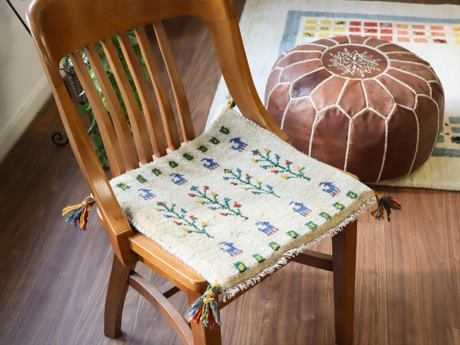 | 何枚も集めたくなる、40cm角の座布団サイズギャベ。四隅に大きなポンポンのついた、伝統的なスタイルでおられています。フローリングに並べて座布団がわりに使ったり、ベンチやダイニングチェアの座面など、使い方はいろいろ。壁にタペストリーのように飾るのもおすすめです。 |