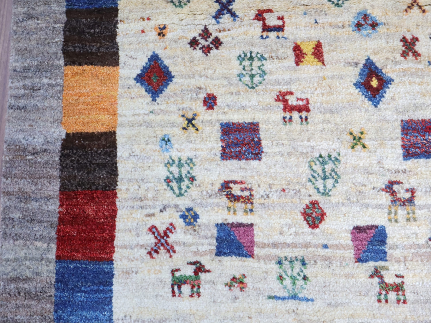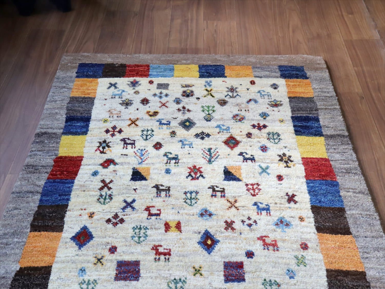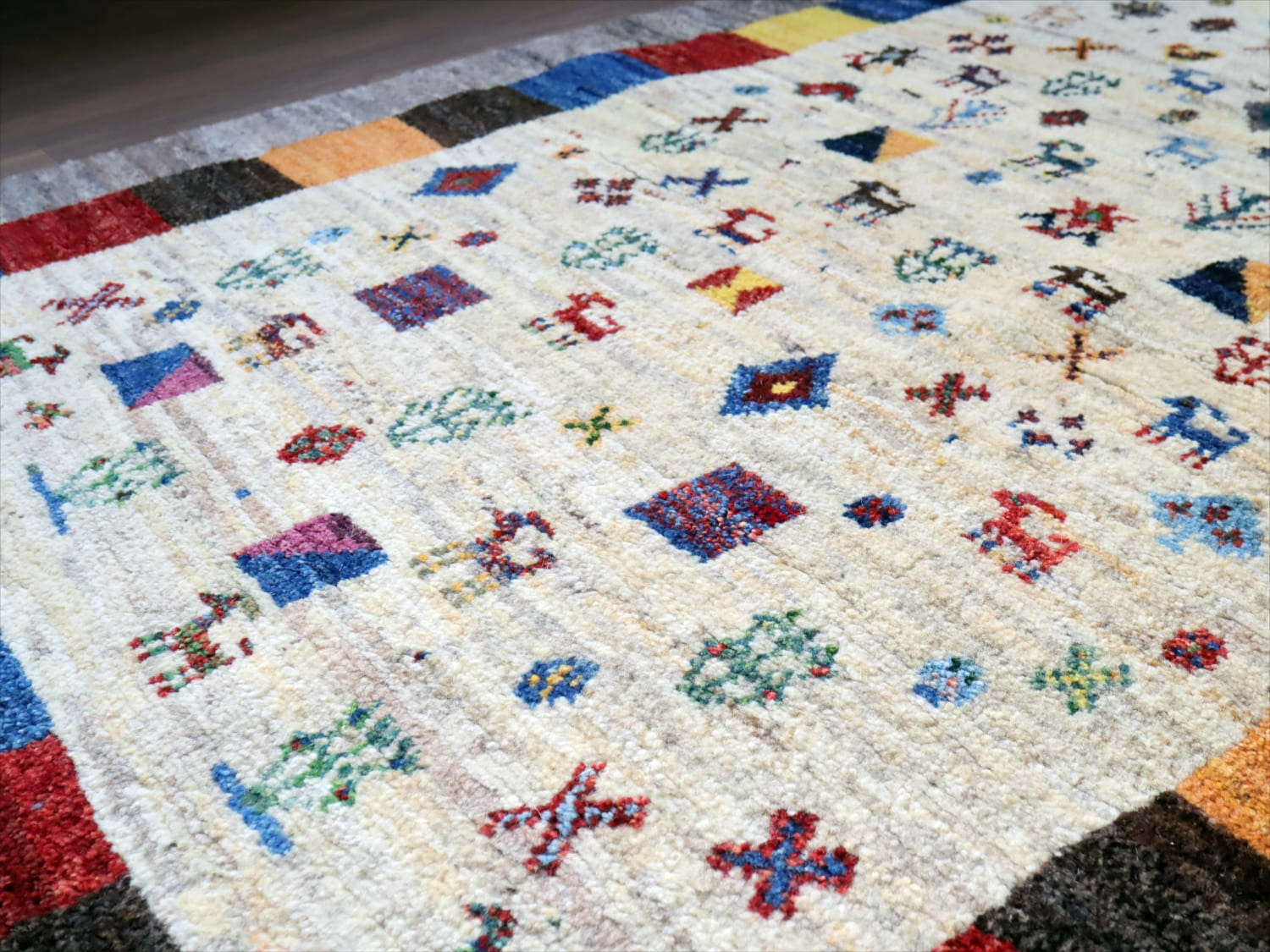 | 楽しいモチーフが全体に織り込まれた伝統的なデザインのギャッベ。中央部分のアイボリー色と、一番外側のグレーは、無染色の天然の羊毛の色を使って織られています。2020年代に入ってから、手織りギャッベでも整ったデザインが多く出てきている中、こちらのギャッベは遊牧民の本来の自由な感性で織った雰囲気が残っています。直線がゆらいでいたり、左右対象でなかったりするところも、このギャッベのチャームポイントです。 |
