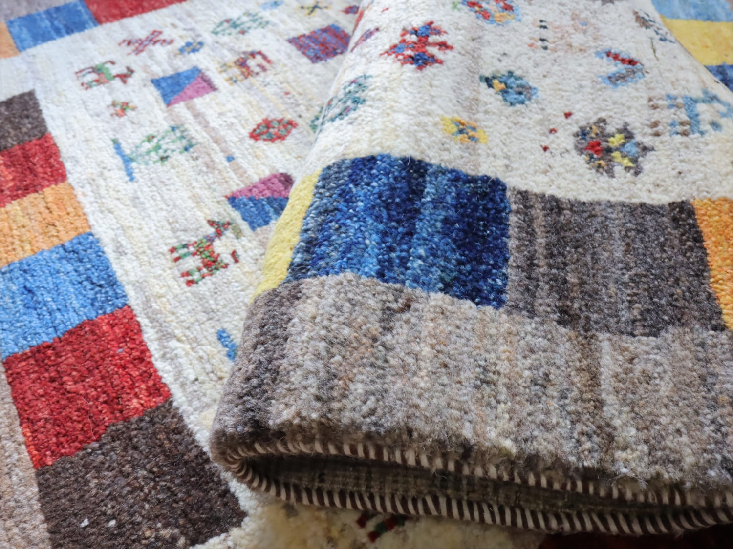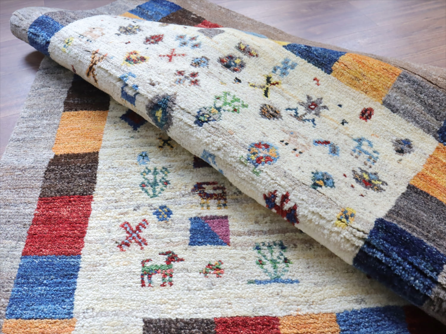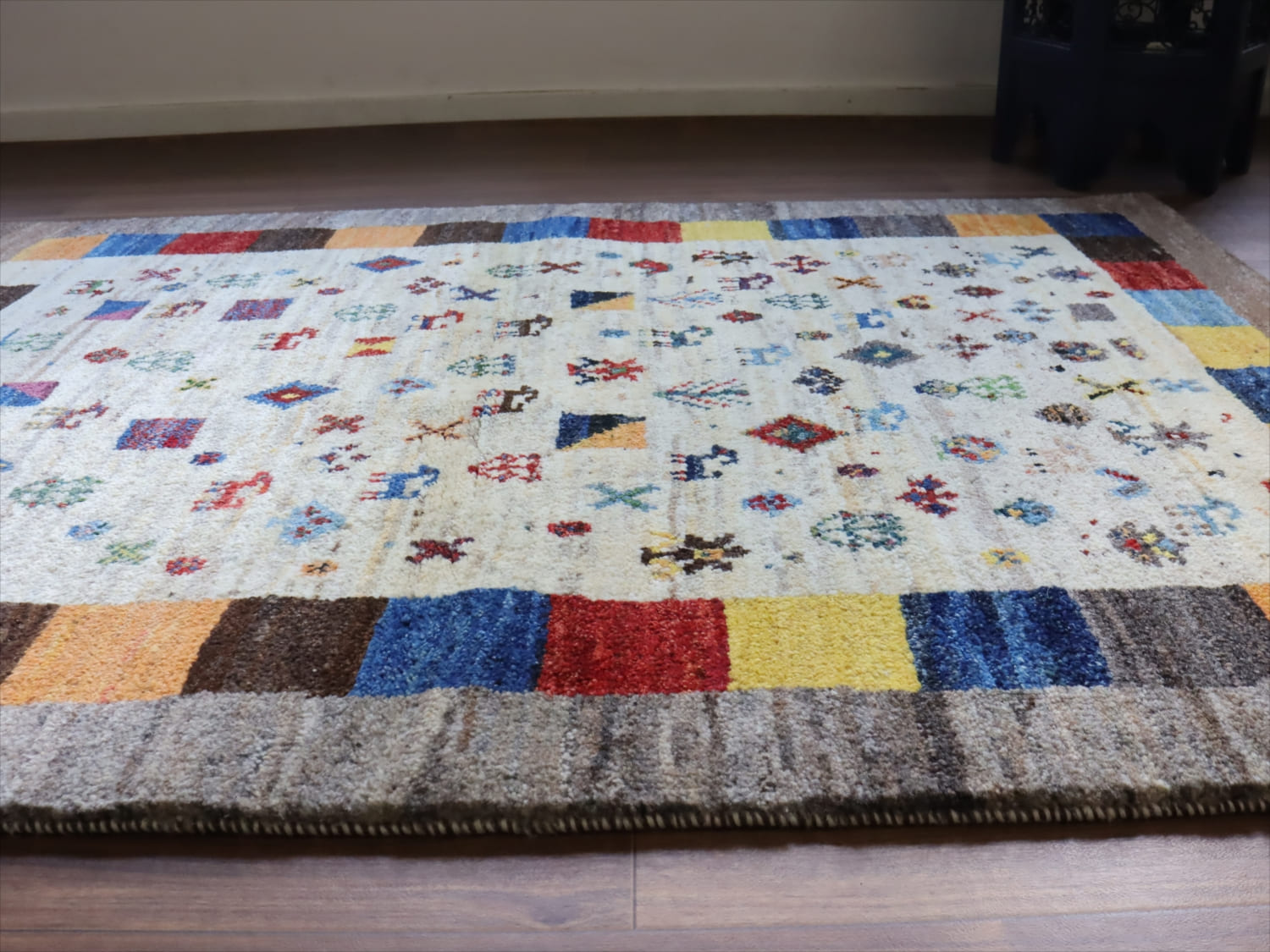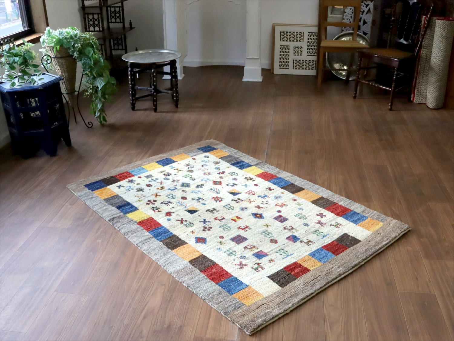 | 楽しいモチーフが全体に織り込まれた伝統的なデザインのギャッベ。中央部分のアイボリー色と、一番外側のグレーは、無染色の天然の羊毛の色を使って織られています。2020年代に入ってから、手織りギャッベでも整ったデザインが多く出てきている中、こちらのギャッベは遊牧民の本来の自由な感性で織った雰囲気が残っています。直線がゆらいでいたり、左右対象でなかったりするところも、このギャッベのチャームポイントです。 |