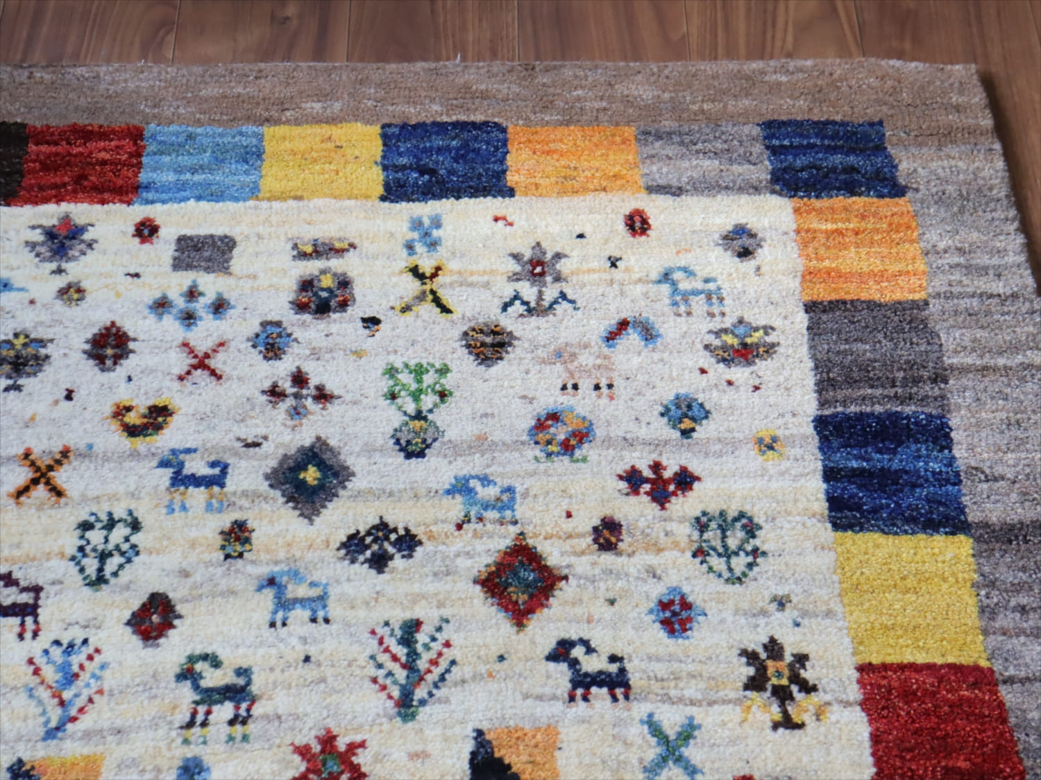 ギャッベ ノマド 156x107cm ナチュラル&グレー たくさんの動物や草花モチーフ イラン産手織り Gabbeh Nomad