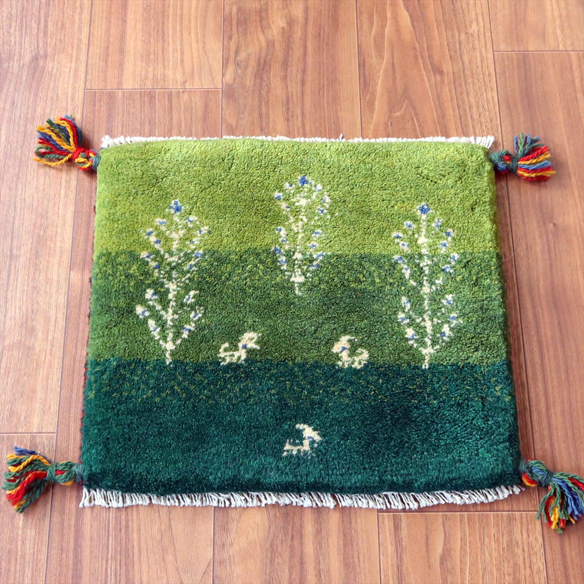 ギャッベ イラン産手織り 座布団サイズ37×42cm グリーン 動物と生命の樹