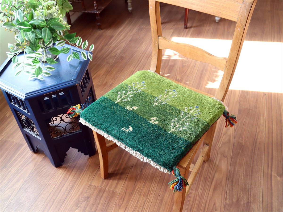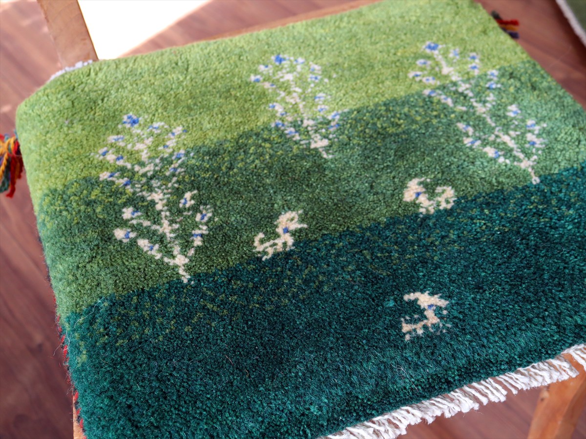 Key:イラン直輸入, GABBEH, ギャッベ, ギャベ, グリーン, 緑, 手織り, 手紡ぎ, ウール, 天然素材, ポンポン, 座布団, バザールギャッベ, ハンドメイド, 一点もの, 現品販売,ガラタバザール, 東京中野区