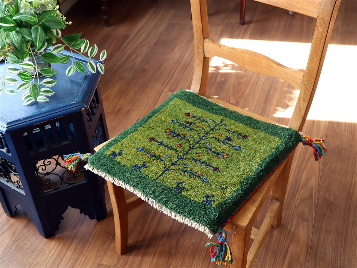 ギャッベ イラン産手織り 座布団サイズ38×38cm グリーン 動物と生命の樹