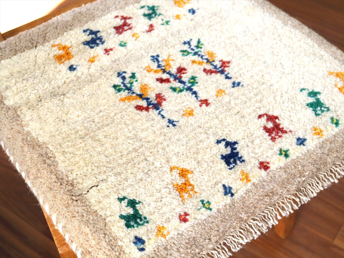 ギャッベ イラン産手織り 座布団サイズ42×43cm ナチュラルアイボリー カラフルな動物と生命の樹