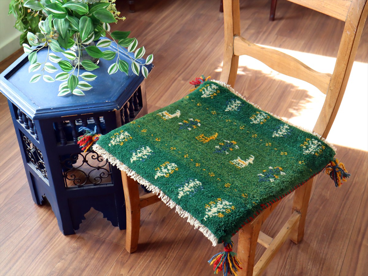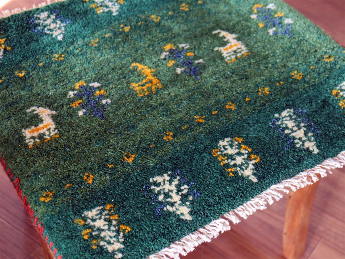 ギャッベ イラン産手織り 座布団サイズ40×44cm グリーン 動物と生命の樹