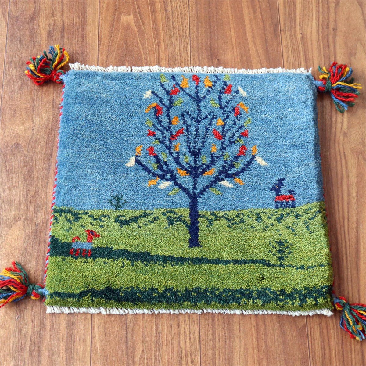 ギャッベ イラン産手織り 座布団サイズ38×41cm ブルー&グリーン 動物と生命の樹 風景画