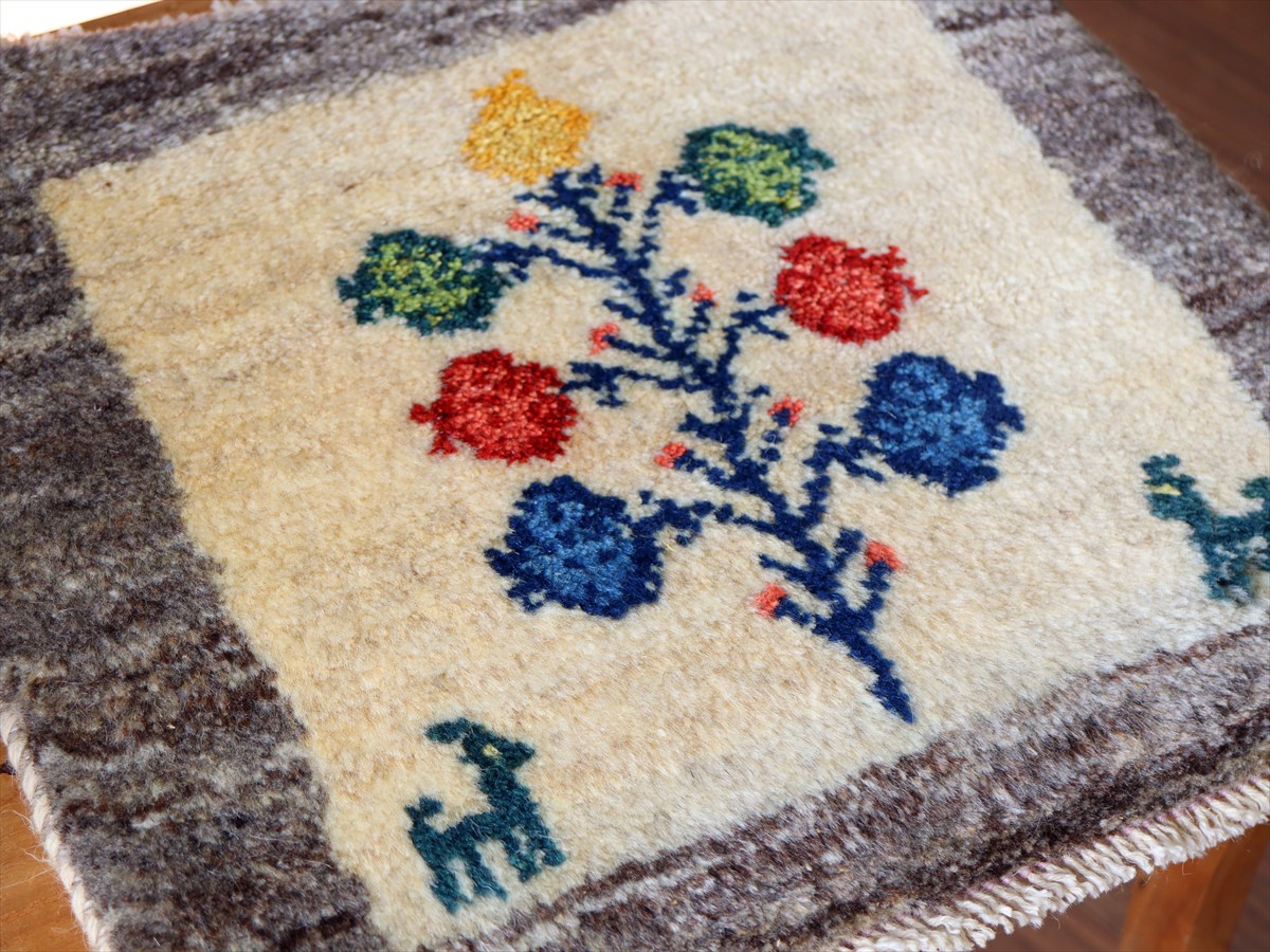 ギャッベ イラン産手織り 座布団サイズ39×41cm ナチュラルアイボリー 動物とカラフルなザクロの樹