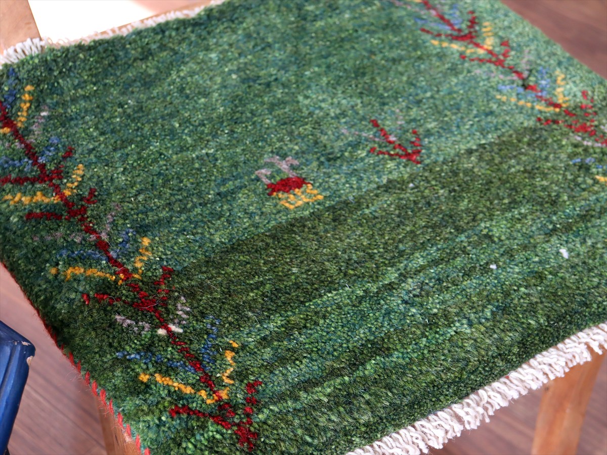Key:イラン直輸入, GABBEH, ギャッベ, ギャベ, グリーン, 緑, 手織り, 手紡ぎ, ウール, 天然素材, ポンポン, 座布団, バザールギャッベ, ハンドメイド, 一点もの, 現品販売,ガラタバザール, 東京中野区