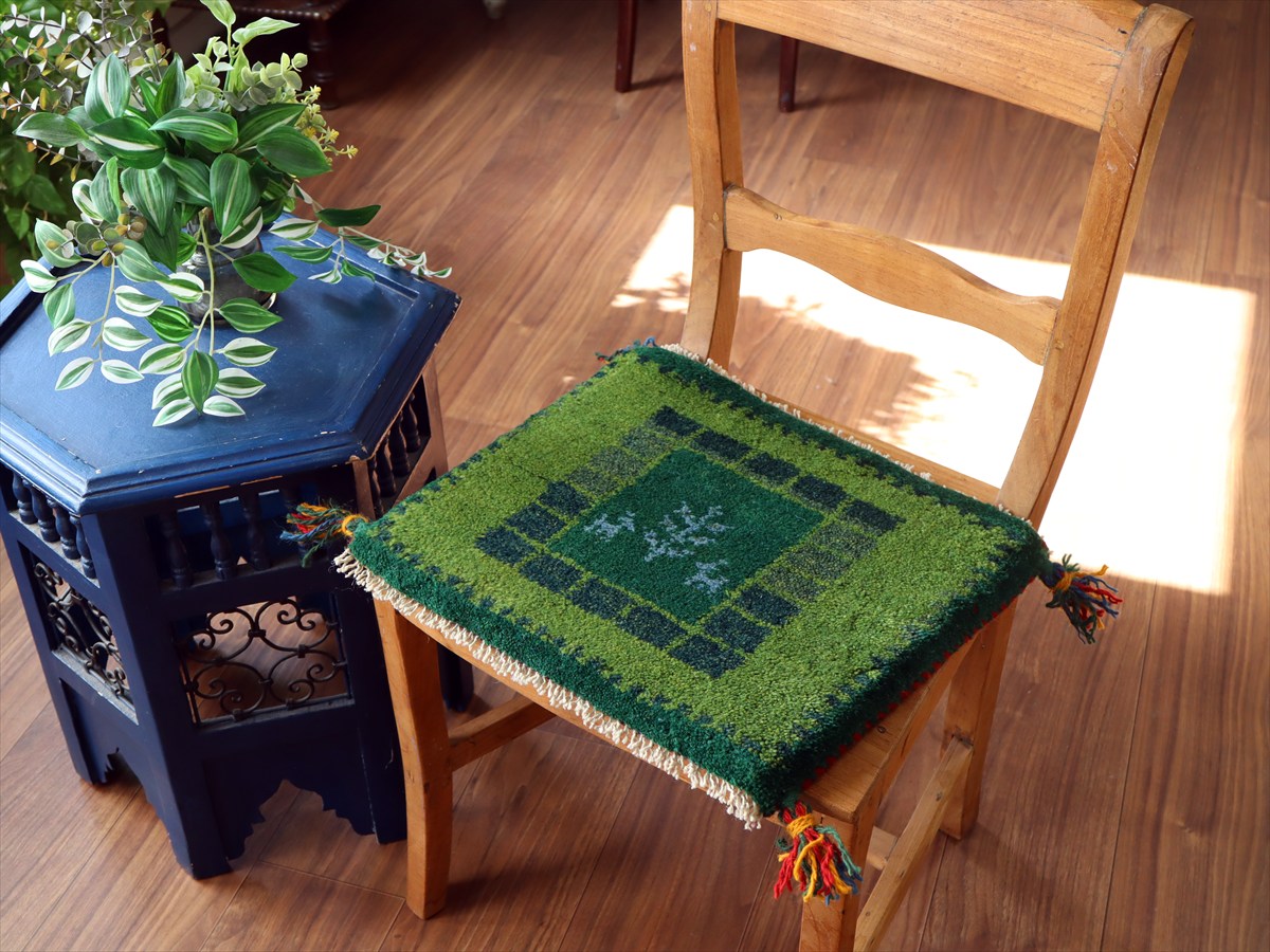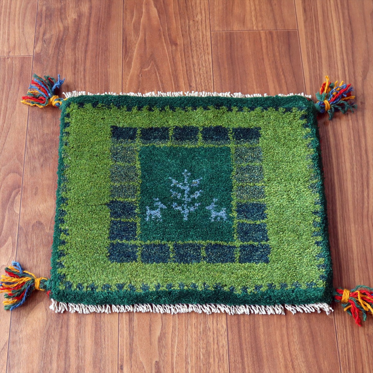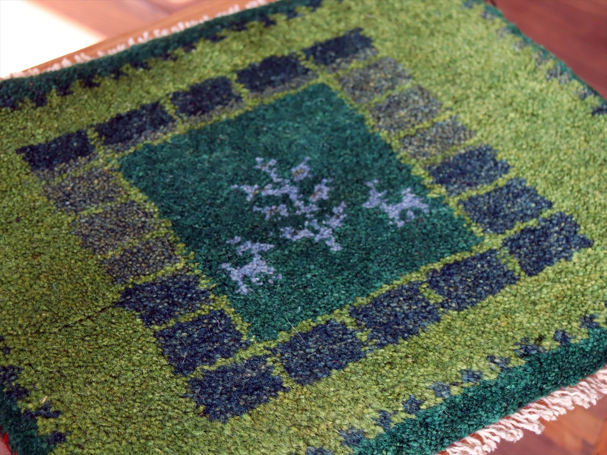 ギャッベ イラン産手織り 座布団サイズ36×41cm グリーン 動物と生命の樹