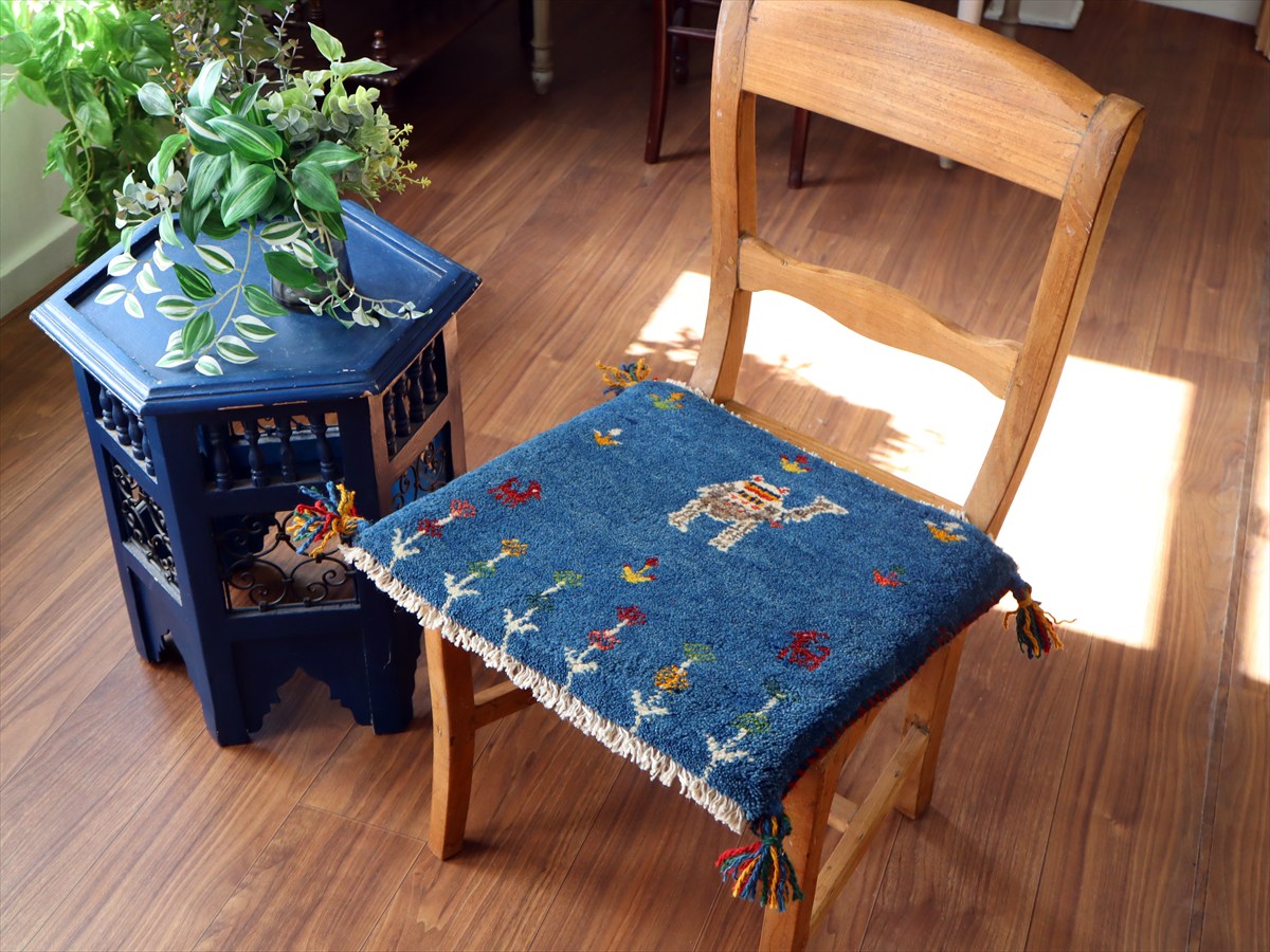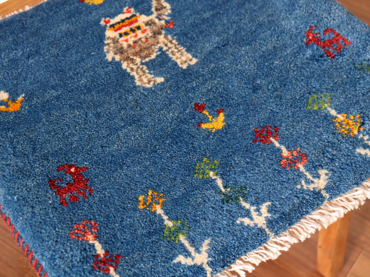 ギャッベ イラン産手織り 座布団サイズ40×44cm ブルー ラクダと動物とフラワーデザイン