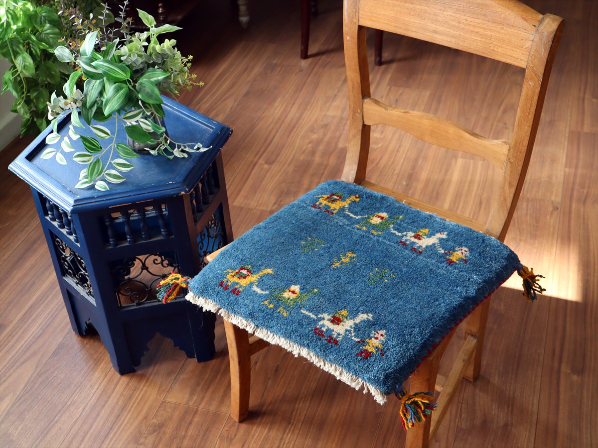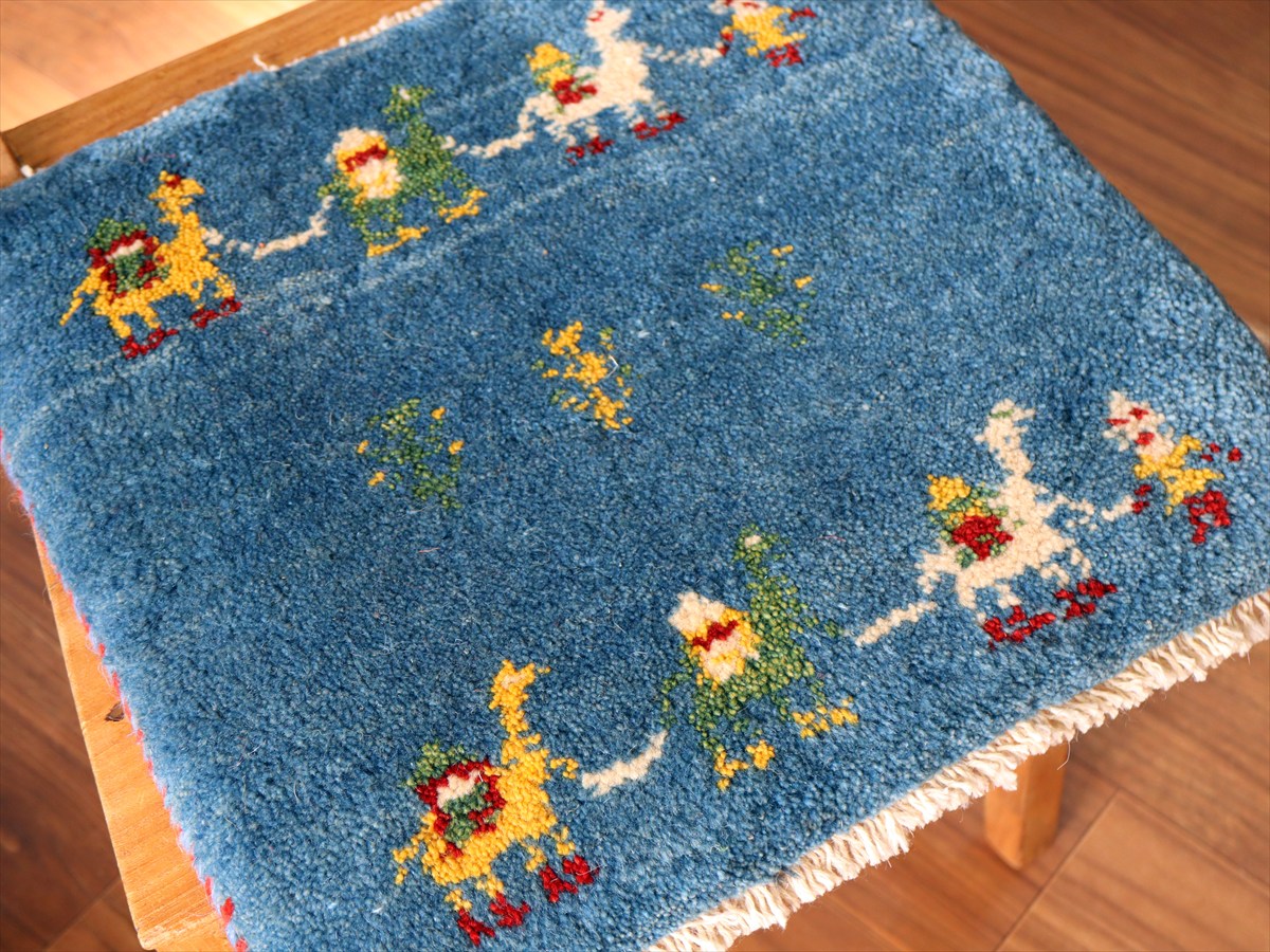 ギャッベ イラン産手織り 座布団サイズ41×42cm ブルー ラクダのキャラバン 生命の樹