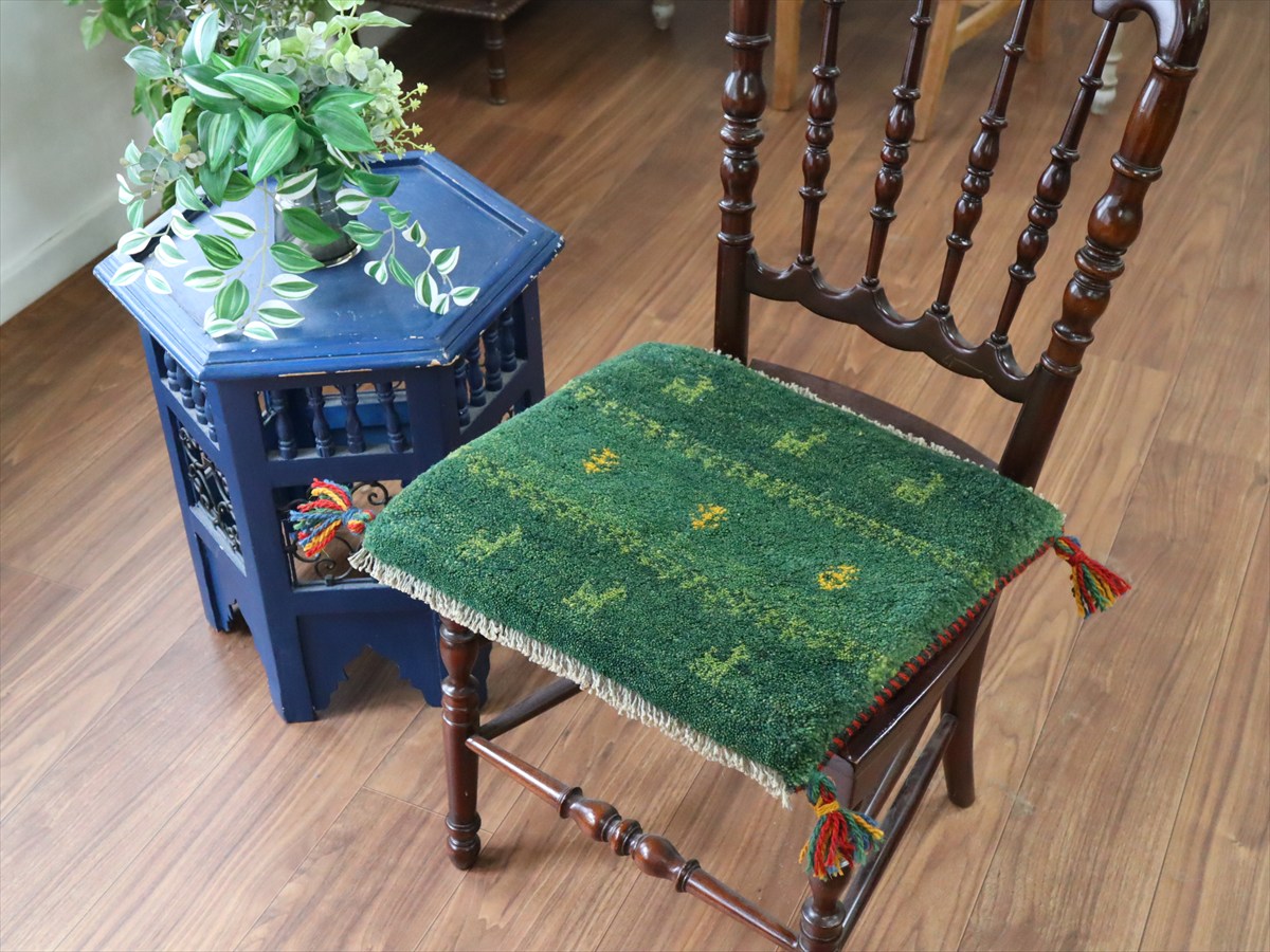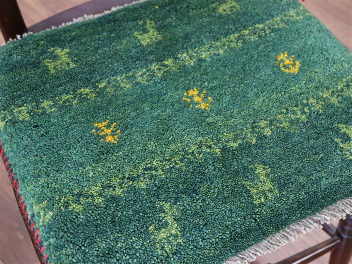 Key:イラン直輸入, GABBEH, ギャッベ, ギャベ, グリーン, 緑, 手織り, 手紡ぎ, ウール, 天然素材, ポンポン, 座布団, バザールギャッベ, ハンドメイド, 一点もの, 現品販売,ガラタバザール, 東京中野区