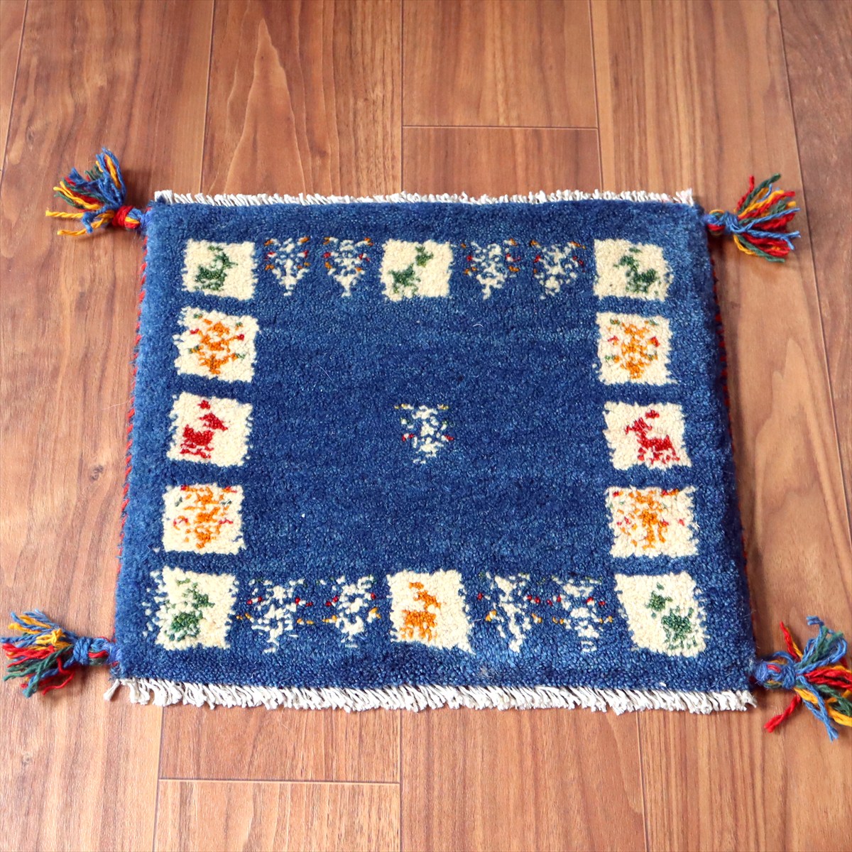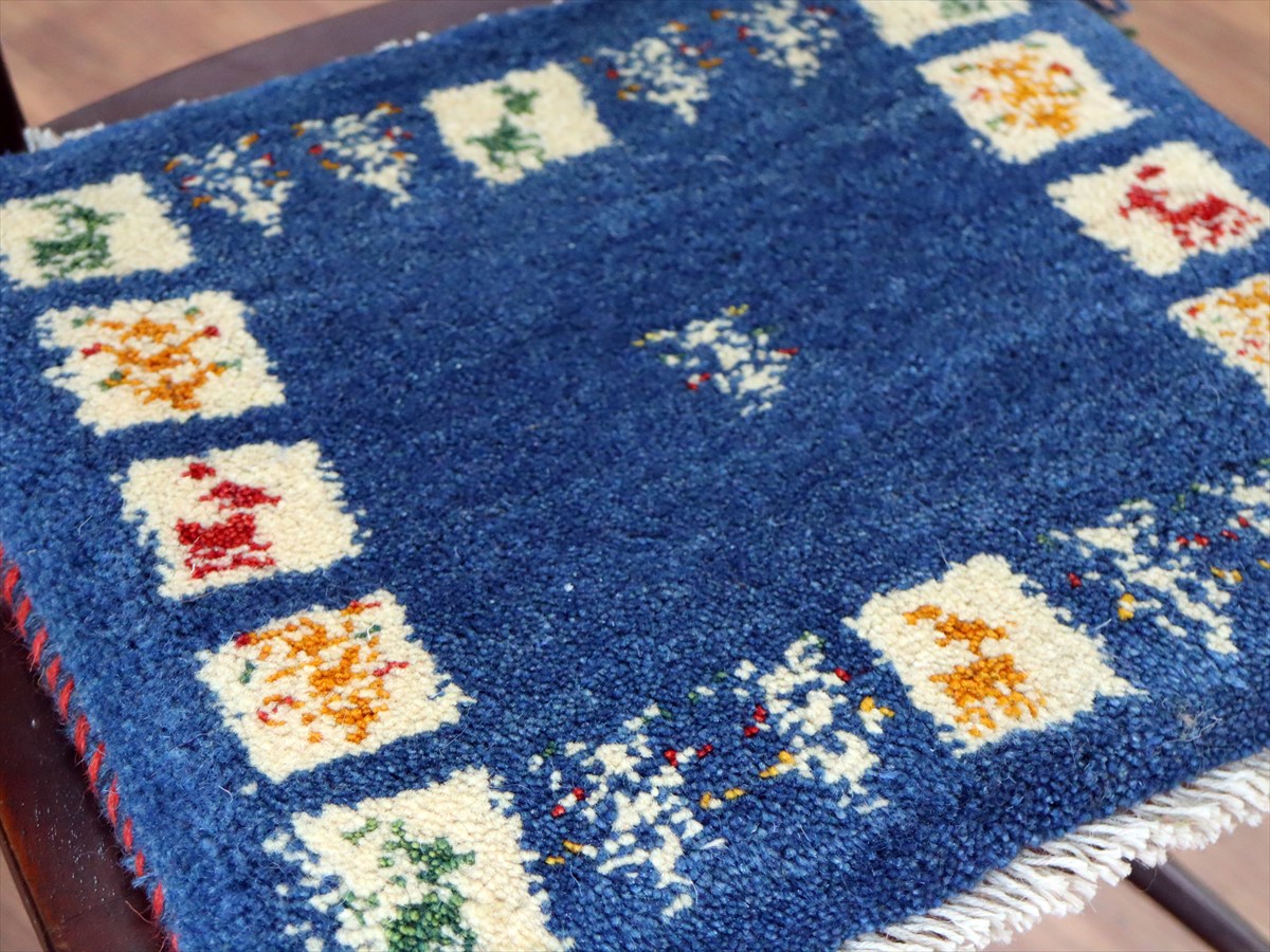 ギャッベ イラン産手織り 座布団サイズ37×42cm ブルー 動物と生命の樹
