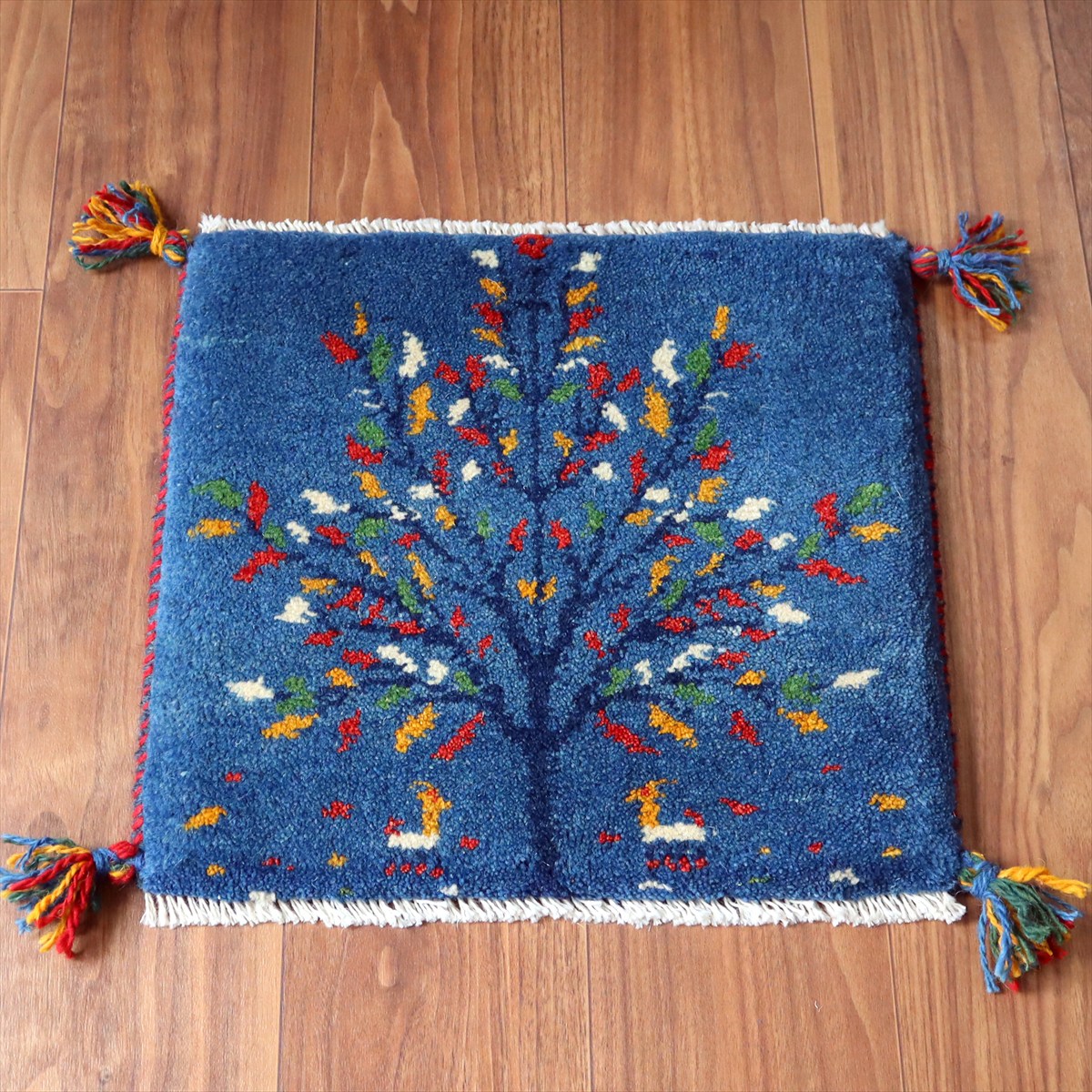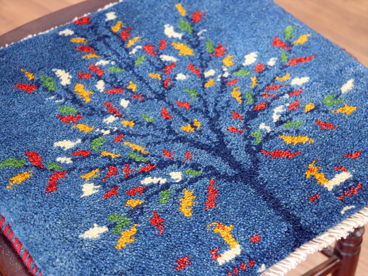 ギャッベ イラン産手織り 座布団サイズ40×43cm ブルー 動物とカラフルな生命の樹