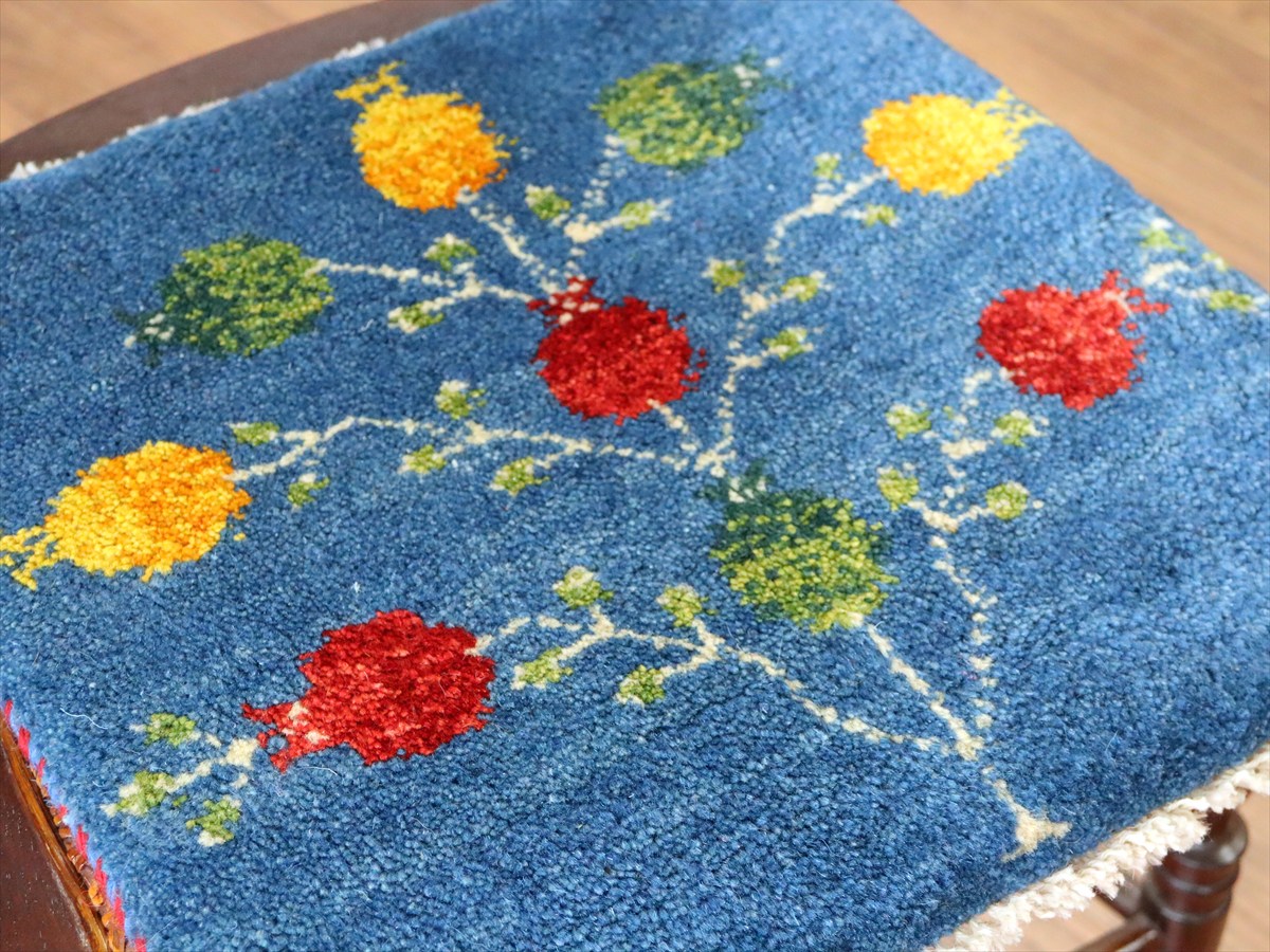 ギャッベ イラン産手織り 座布団サイズ39×40cm ブルー 動物とカラフルなザクロの樹