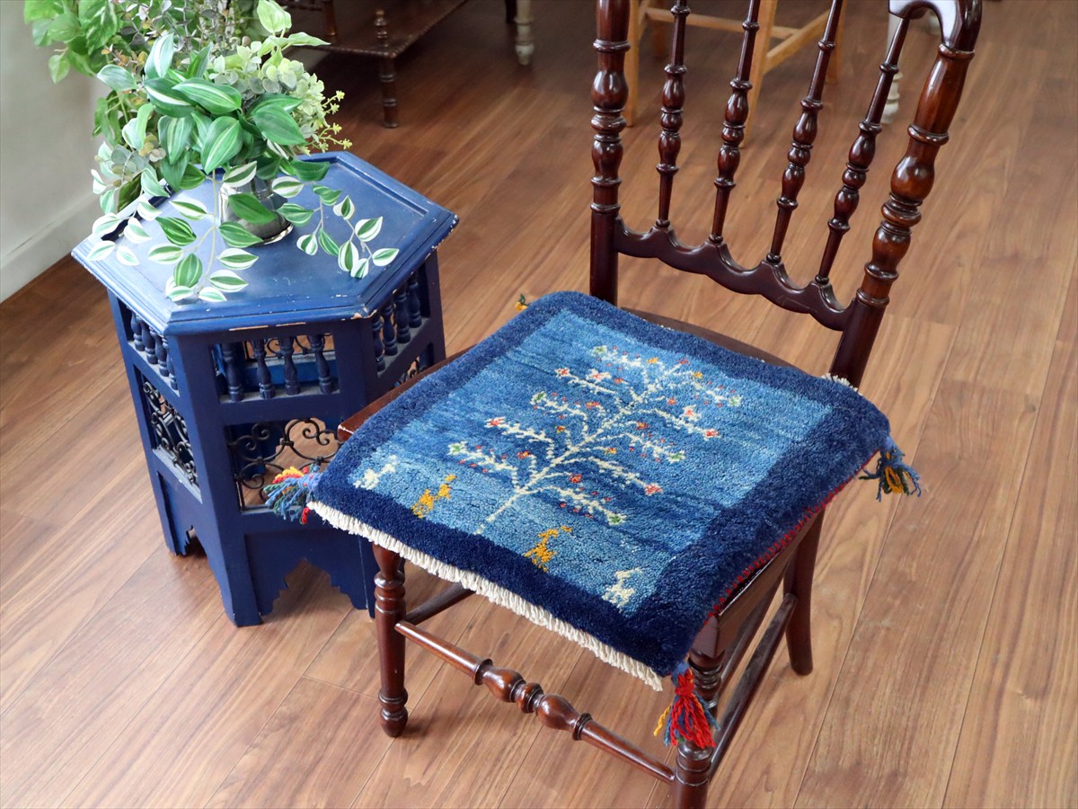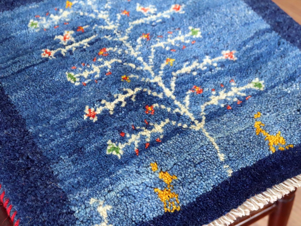 ギャッベ イラン産手織り 座布団サイズ42×42cm ブルー 動物と生命の樹