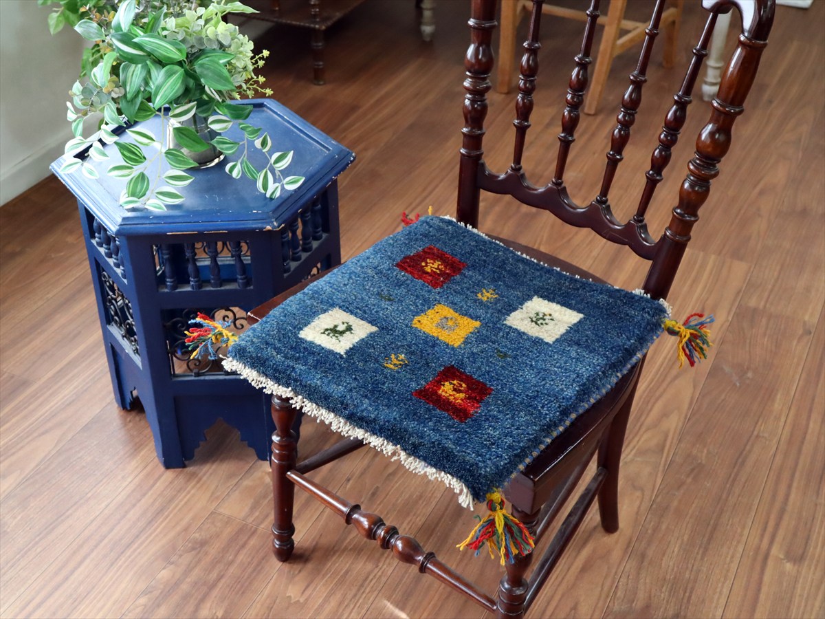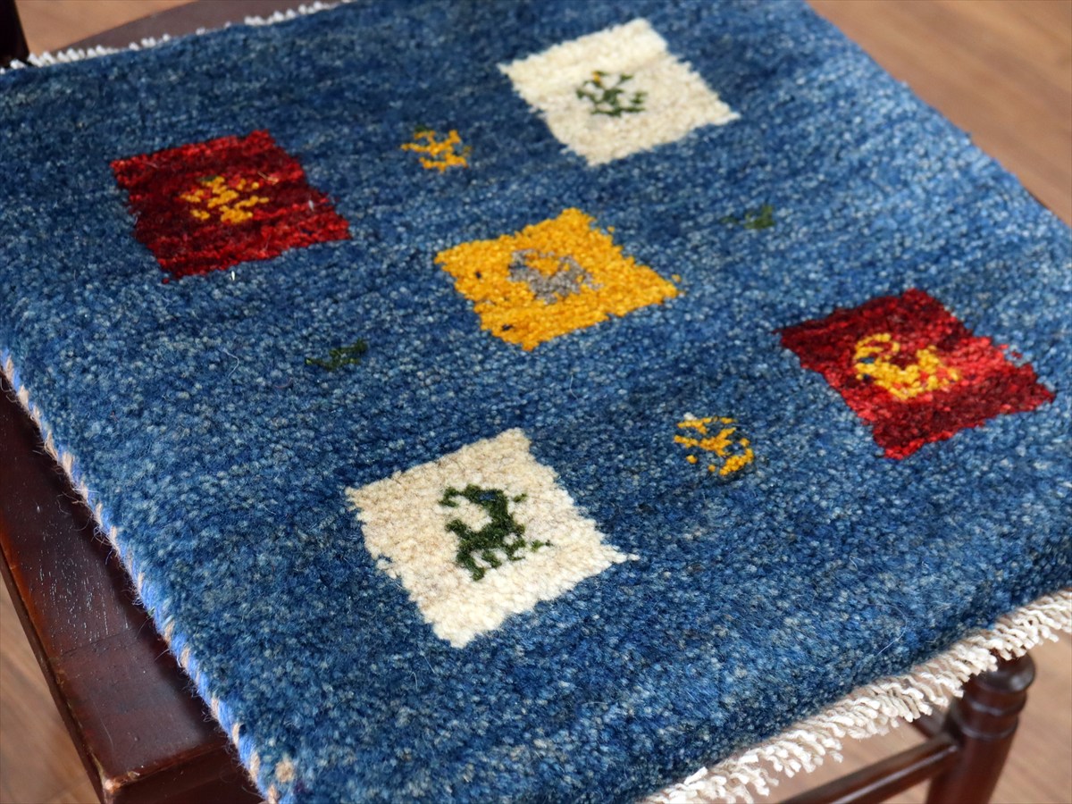 ギャッベ イラン産手織り 座布団サイズ41×40cm ブルー カラフルタイル 動物と生命の樹
