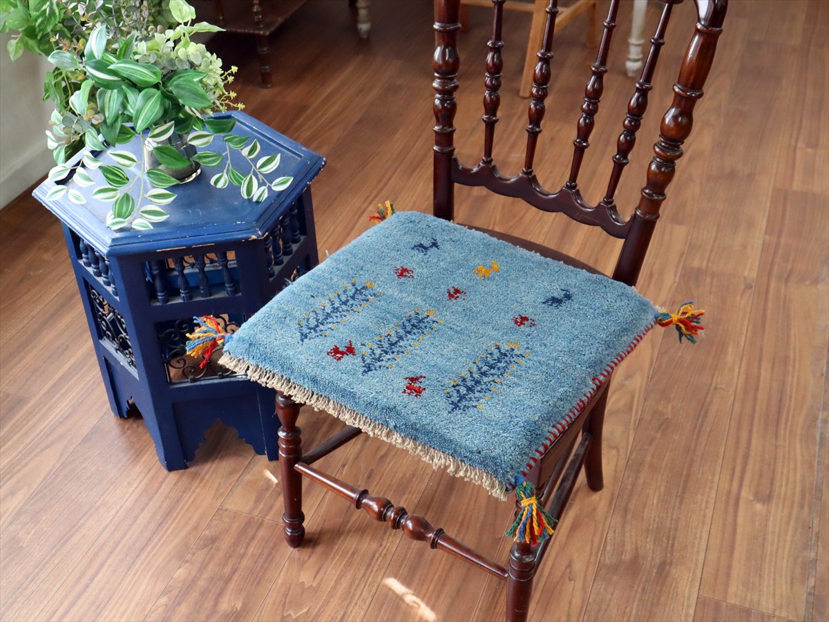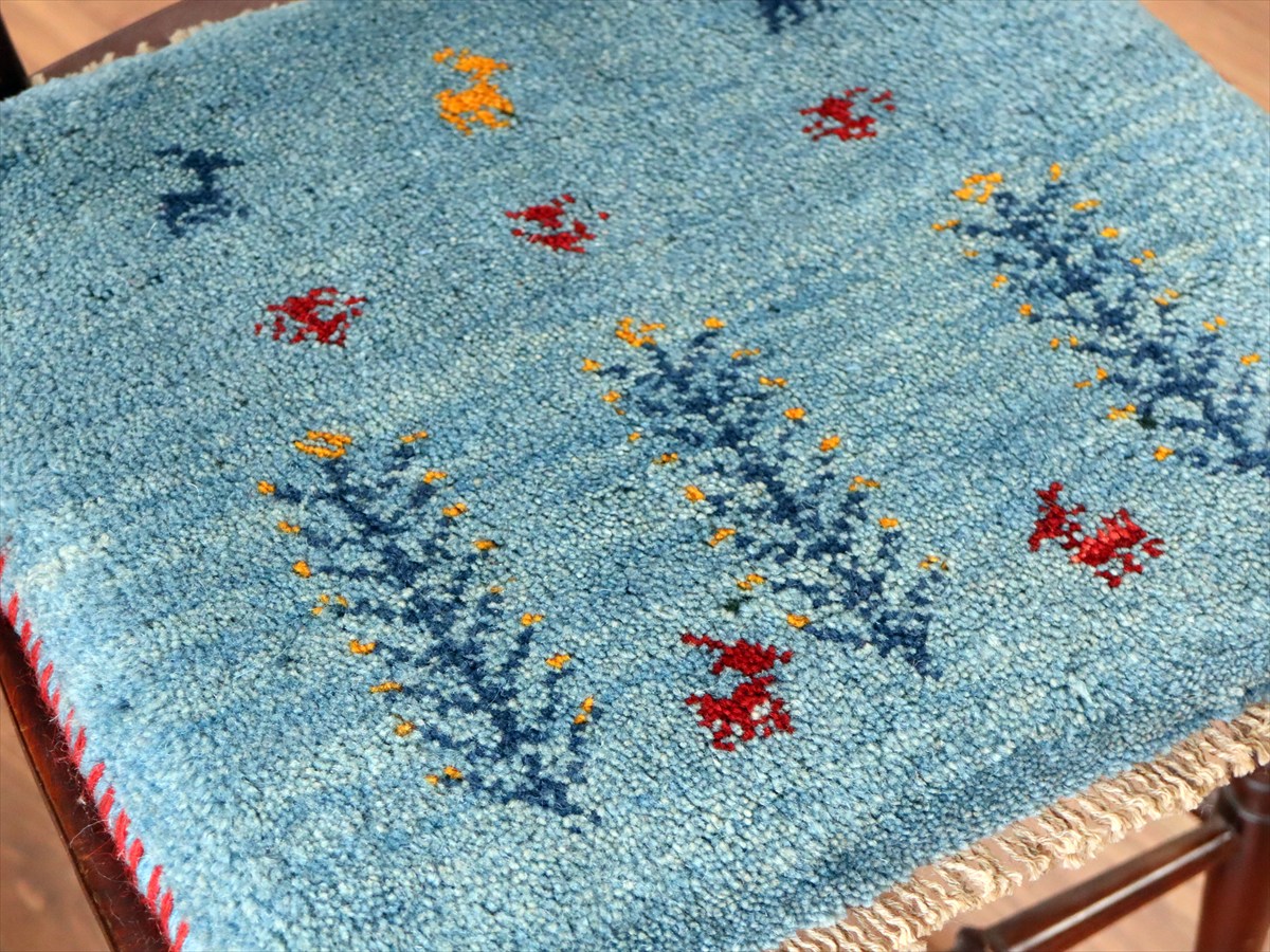 ギャッベ イラン産手織り 座布団サイズ40×44cm アクアブルー 動物と連なる生命の樹