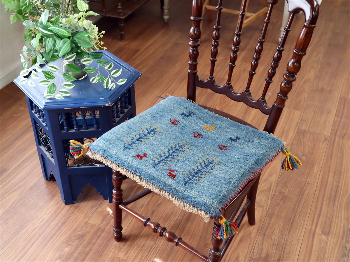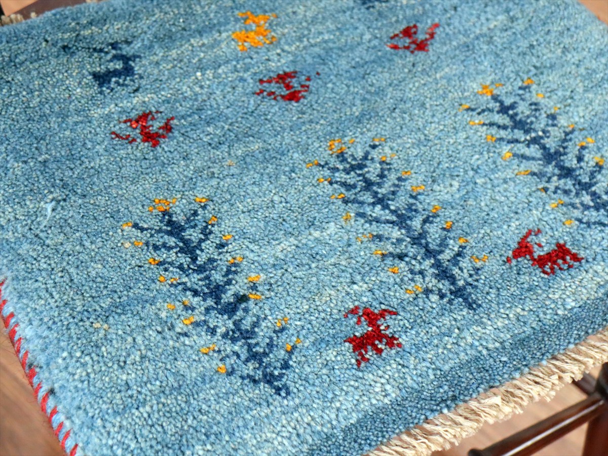 ギャッベ イラン産手織り 座布団サイズ39×45cm アクアブルー 動物と連なる生命の樹