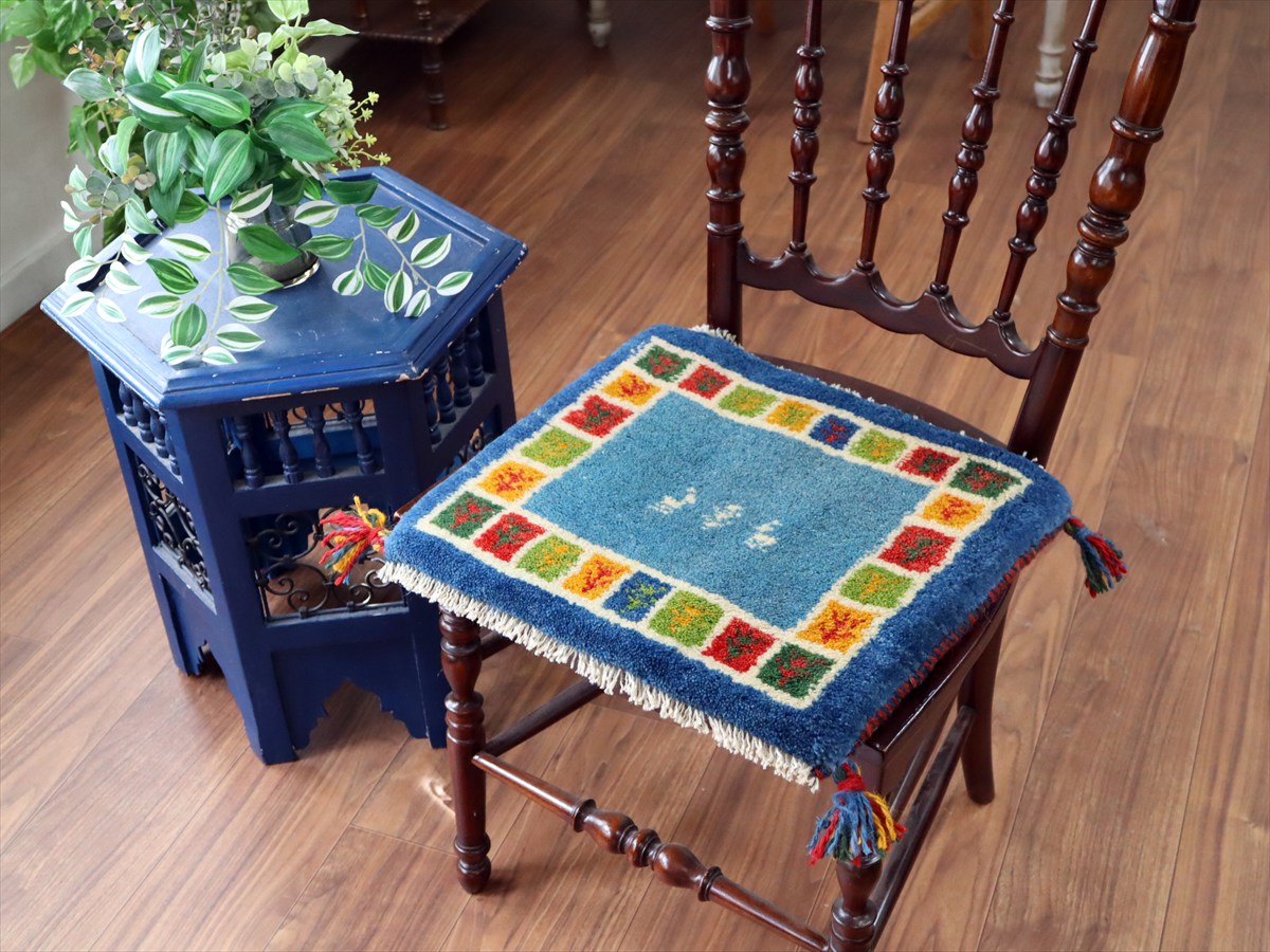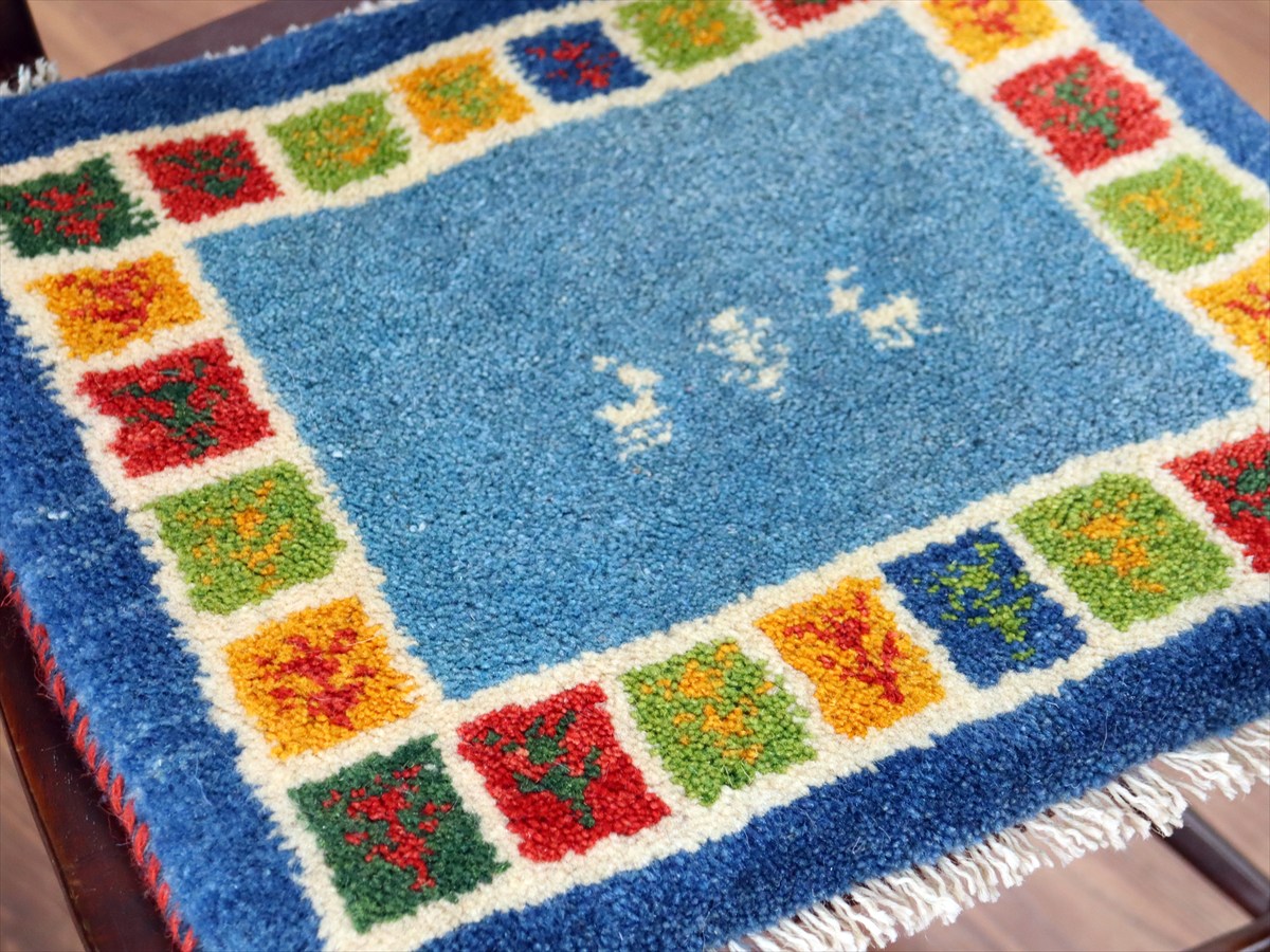 ギャッベ イラン産手織り 座布団サイズ38×43cm ブルー カラフルタイル 動物と生命の樹
