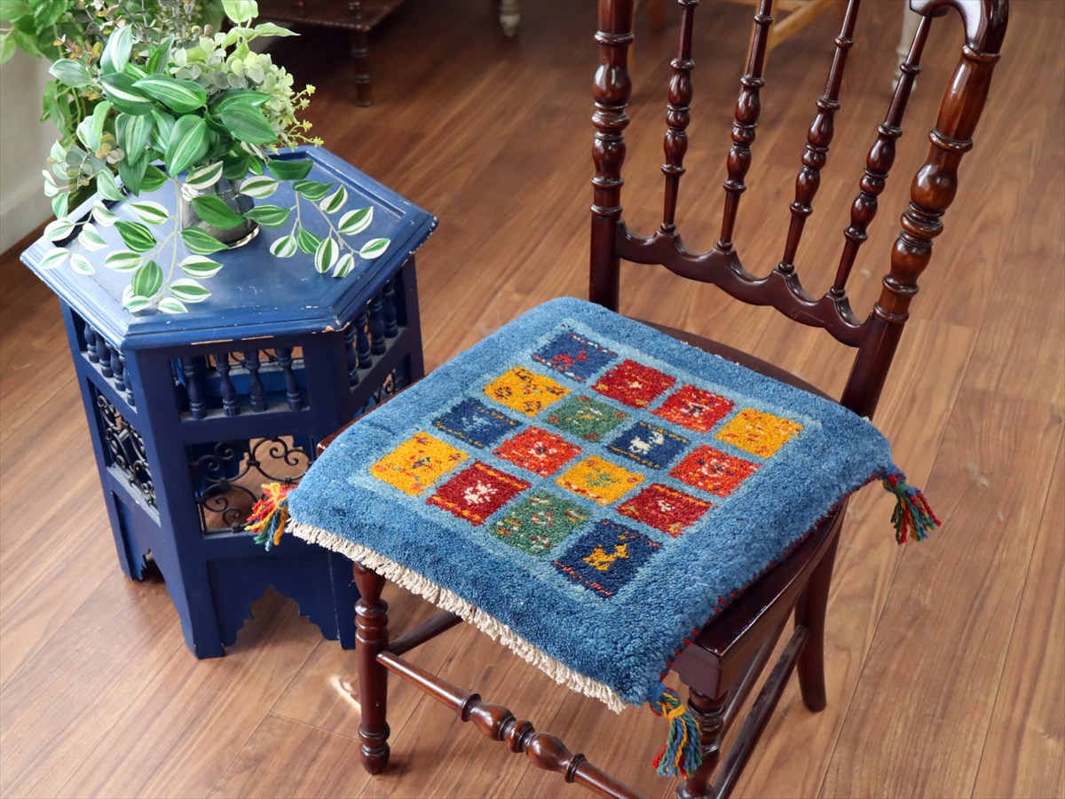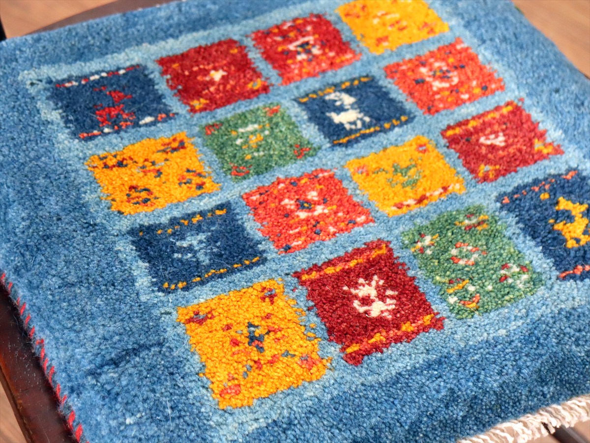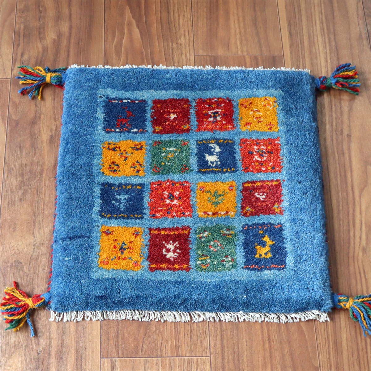 ギャッベ イラン産手織り 座布団サイズ41×47cm ブルー カラフルタイル 動物と生命の樹