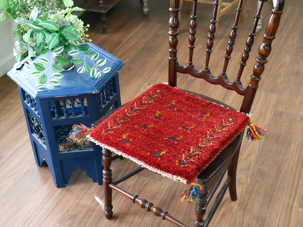 | 何枚も集めたくなる、40cm角の座布団サイズギャベ。四隅に大きなポンポンのついた、伝統的なスタイルでおられています。フローリングに並べて座布団がわりに使ったり、ベンチやダイニングチェアの座面など、使い方はいろいろ。壁にタペストリーのように飾るのもおすすめです。 |