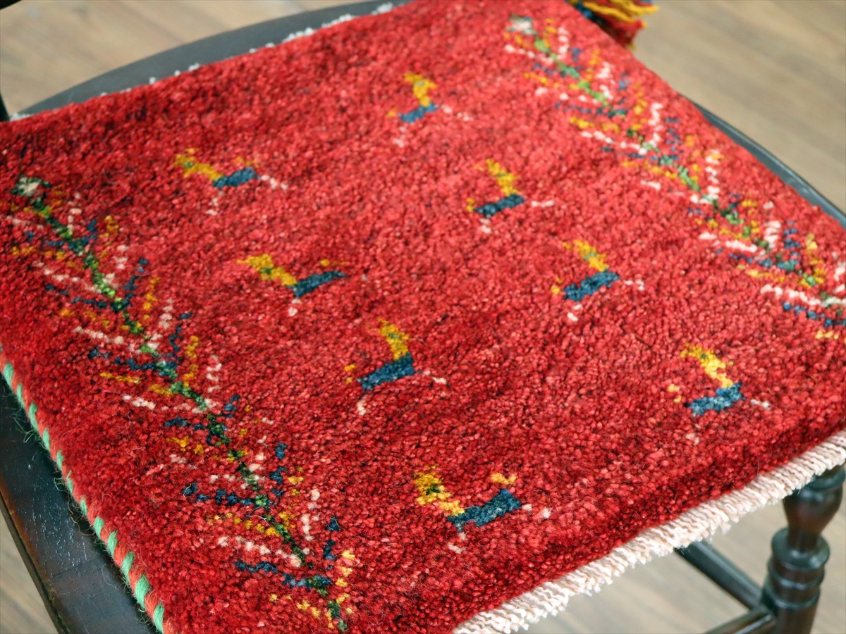 ギャッベ イラン産手織り 座布団サイズ39×39cm レッド 連なる生命の樹と動物