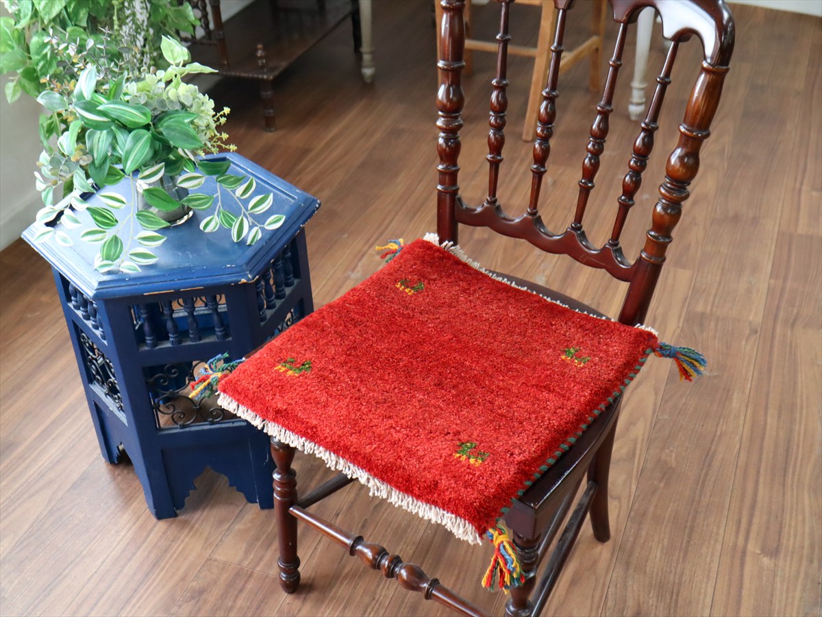| 何枚も集めたくなる、40cm角の座布団サイズギャベ。四隅に大きなポンポンのついた、伝統的なスタイルでおられています。フローリングに並べて座布団がわりに使ったり、ベンチやダイニングチェアの座面など、使い方はいろいろ。壁にタペストリーのように飾るのもおすすめです。 |