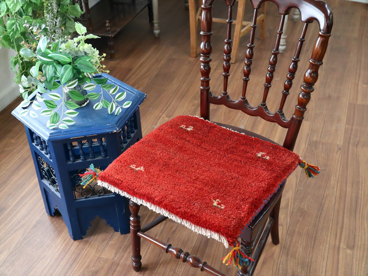| 何枚も集めたくなる、40cm角の座布団サイズギャベ。四隅に大きなポンポンのついた、伝統的なスタイルでおられています。フローリングに並べて座布団がわりに使ったり、ベンチやダイニングチェアの座面など、使い方はいろいろ。壁にタペストリーのように飾るのもおすすめです。 |