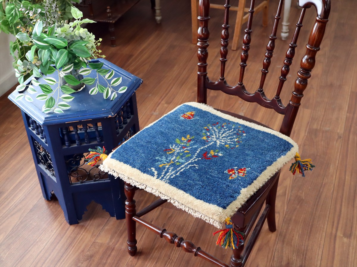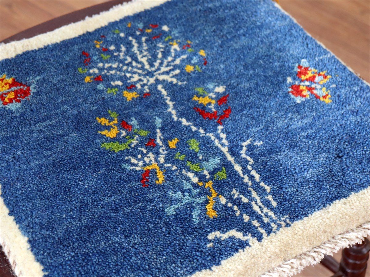 ギャッベ イラン産手織り 座布団サイズ40×42cm ブルー 蝶々とフラワーデザイン