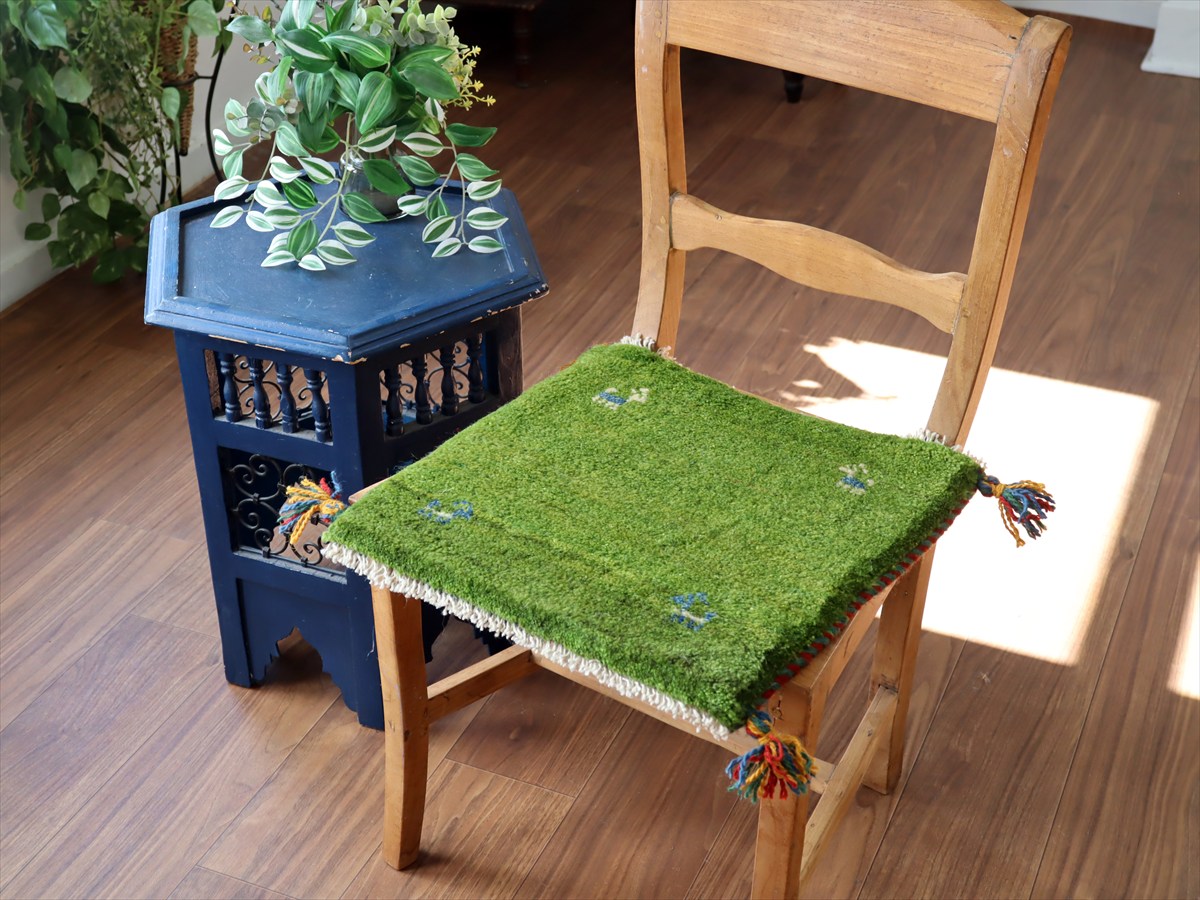 Key:イラン直輸入, GABBEH, ギャッベ, ギャベ, グリーン, 緑, 手織り, 手紡ぎ, ウール, 天然素材, ポンポン, 座布団, バザールギャッベ, ハンドメイド, 一点もの, 現品販売,ガラタバザール, 東京中野区