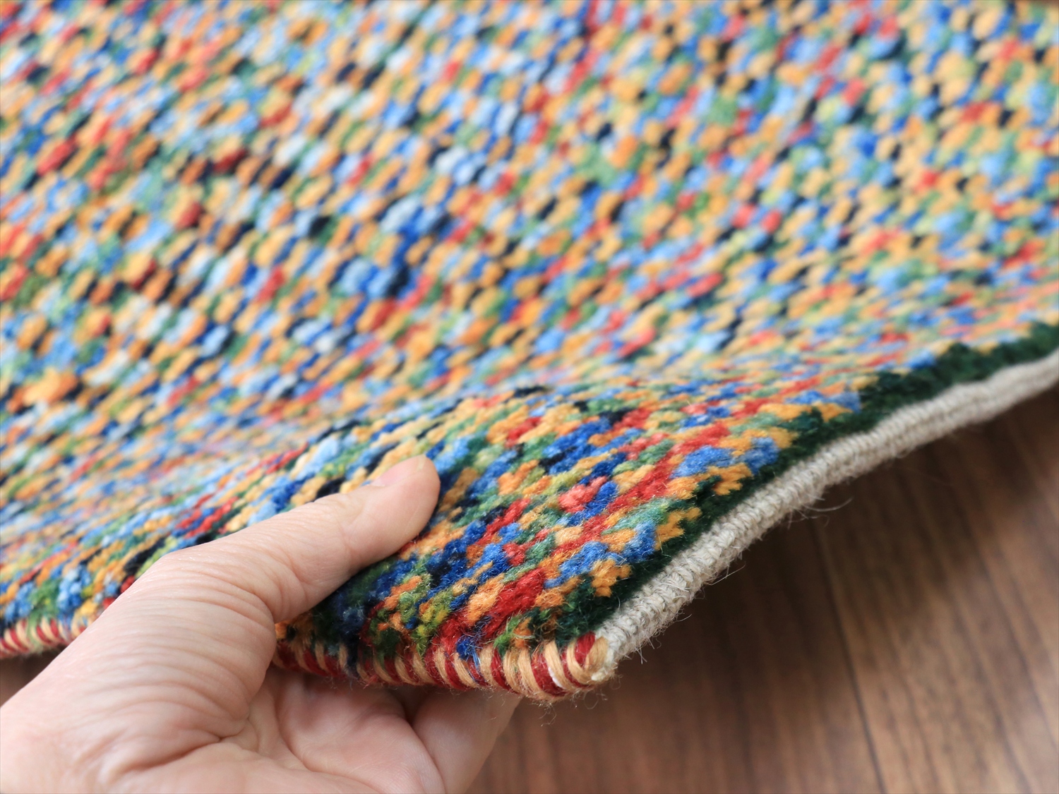 | 織り地はやわらかさがあり、厚みは1.3-1.4cm程度。 ・手紡ぎ、草木染(または無染色)、ウール100%、手織りのギャッベ。 ・余分なウール繊維を焼き飛ばして、水洗いとシャーリングを数回繰り返した丁寧な仕上げ。遊び毛はほとんどでません。 ・上下の房は、飾り糸をそえて裏面に巻き込む仕上げ。お掃除のときにも房がからまず機能的です。 |