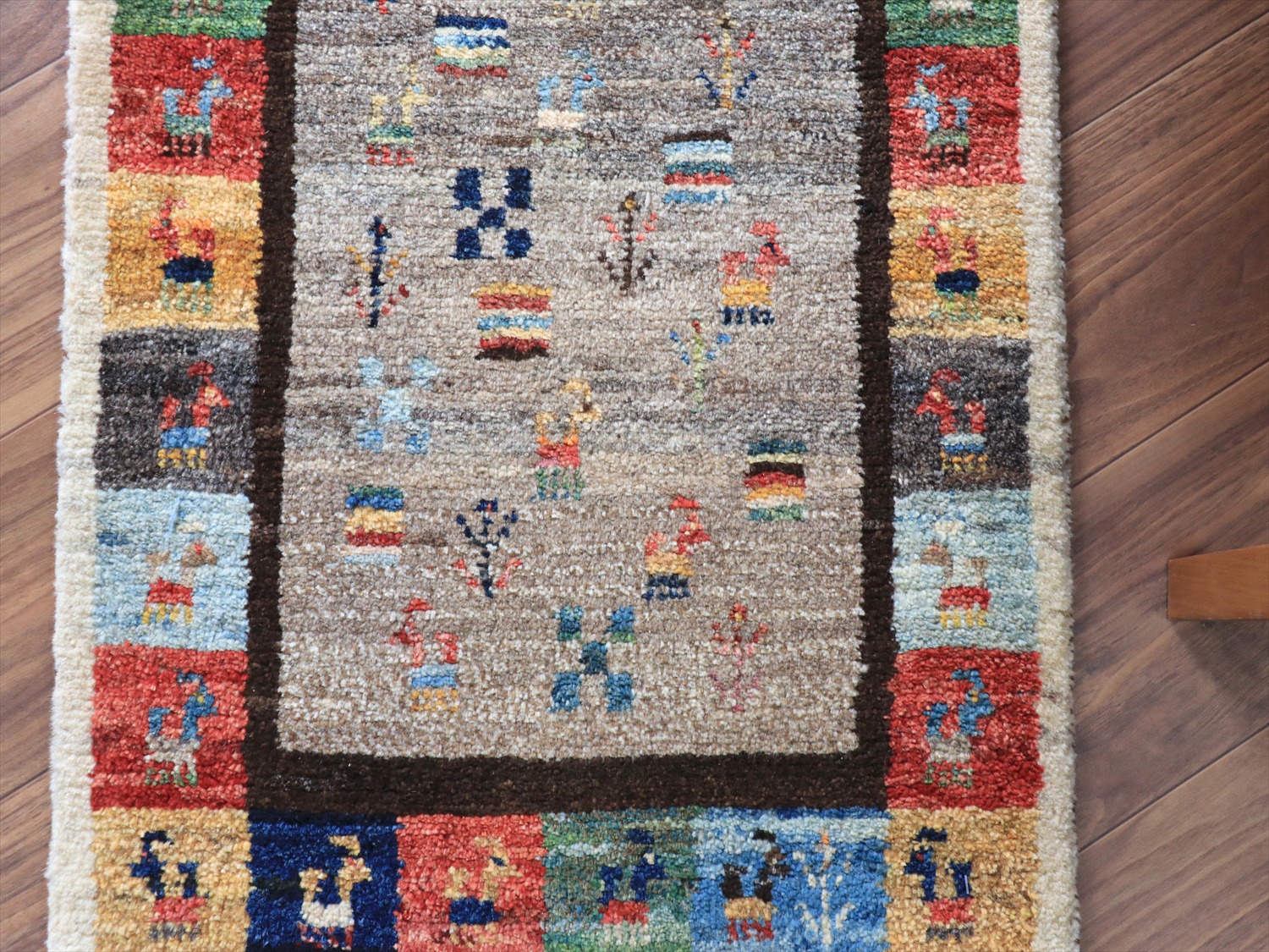 | 中央のベースの色は、染料を使わずに天然の羊毛の色をそのまま使ったグレー。ランダムは配置で、動物や草花のモチーフが並べられています。周囲のカラフルなタイルモチーフもひとつひとつがかわいらしく、素朴なギャッベのイメージそのままのデザインです。 |