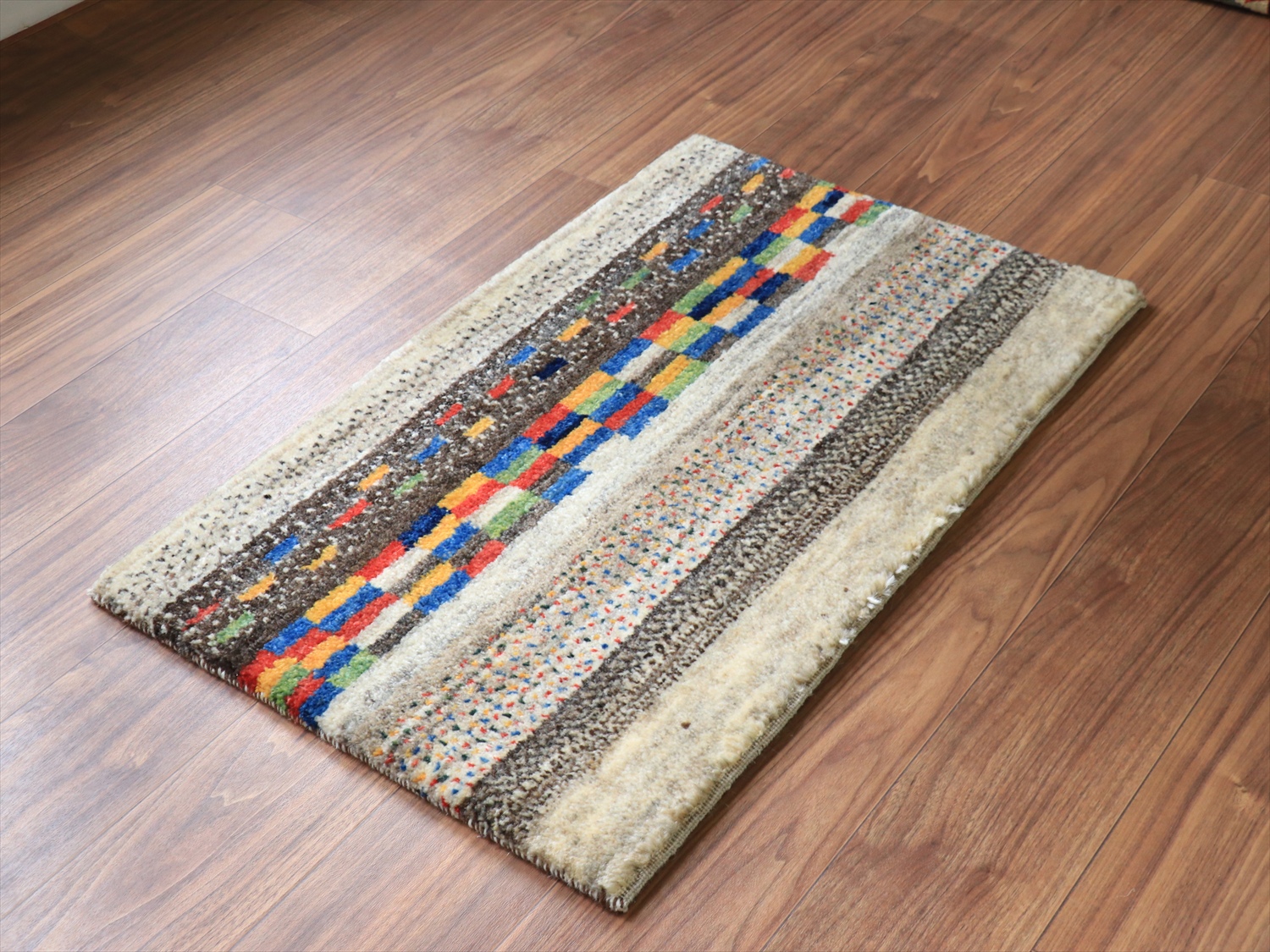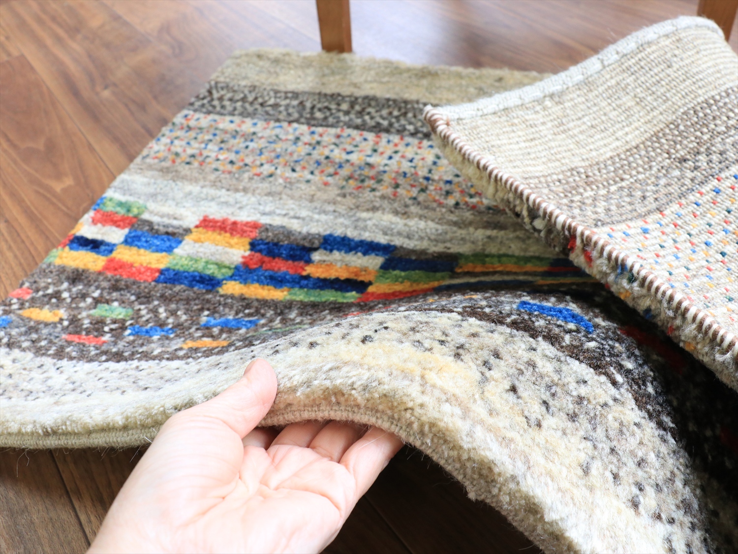 | 縦のストライプは珍しいと思われたかもしれませんが、このギャッベは経糸の方向からみると、横に長いサイズです。経糸の房は丁寧に巻き込んであるので、お使いになるときには縦横どちらの方向でも気にせずにおいてください! モダンな幾何学モチーフで、動物や草花のモチーフがはいっていないのもいいですね。 |