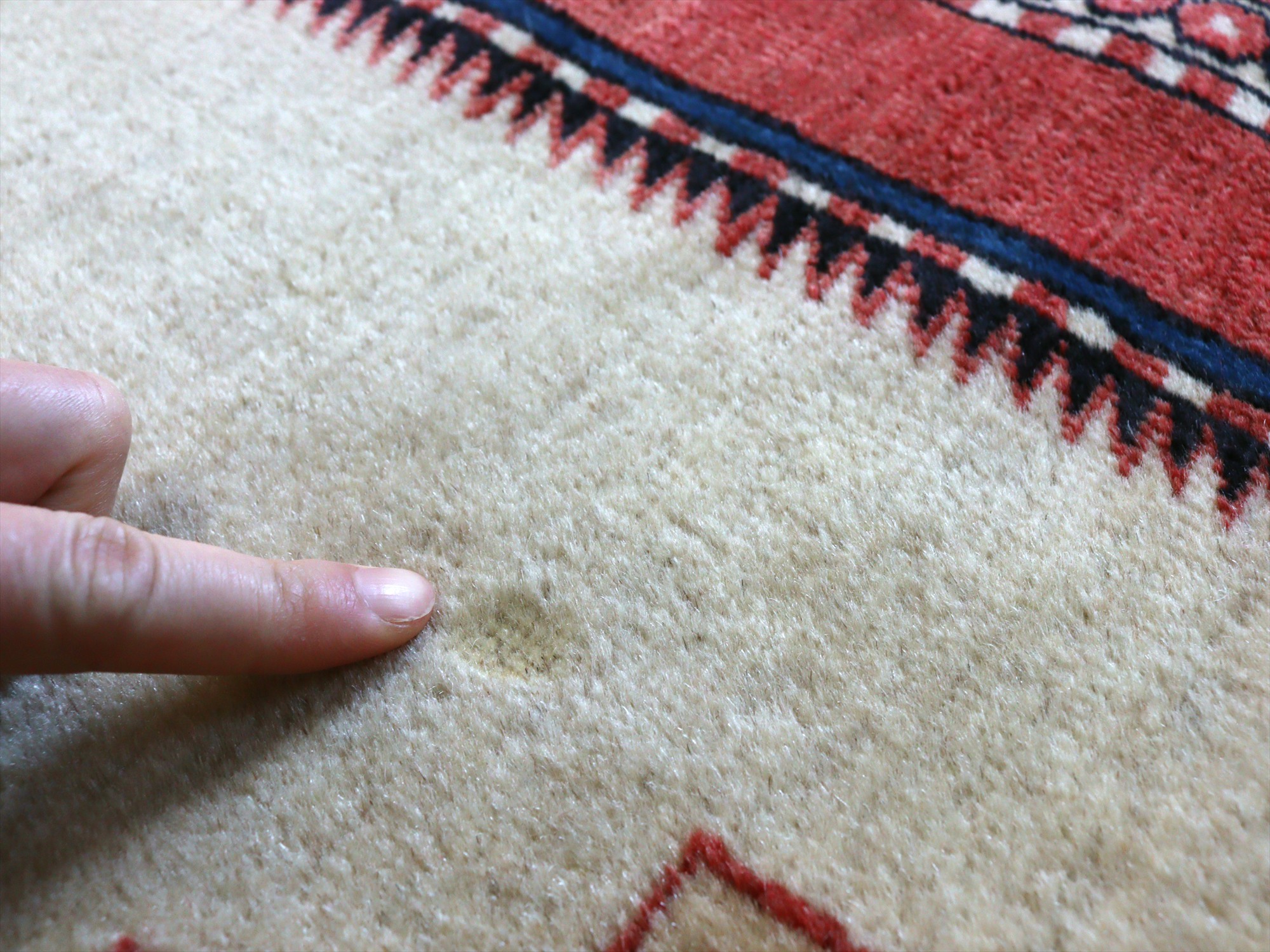 | べーズを含めたラグの厚みは5mm程で、パイルは短くすっきりとしています。一部パイルに削れている箇所があります(写真をご参照ください)。そのほかは大きいダメージもなくきれいな状態です。 |