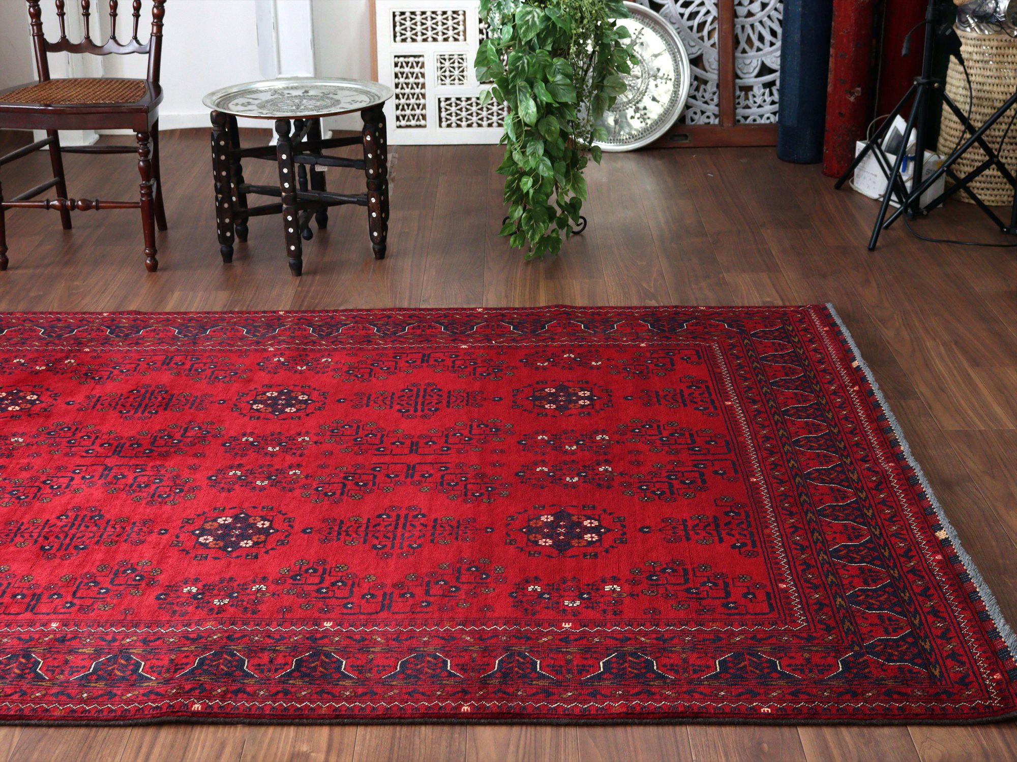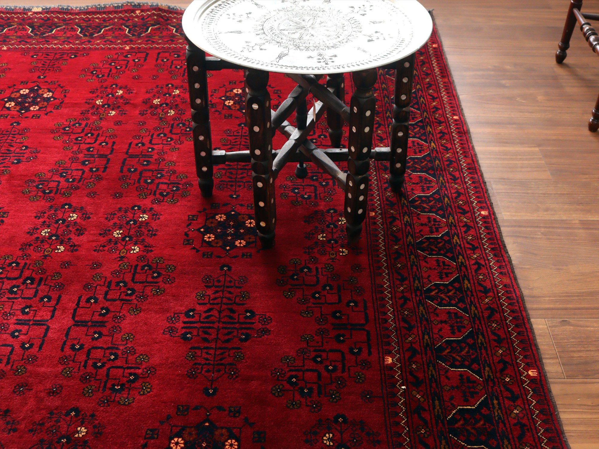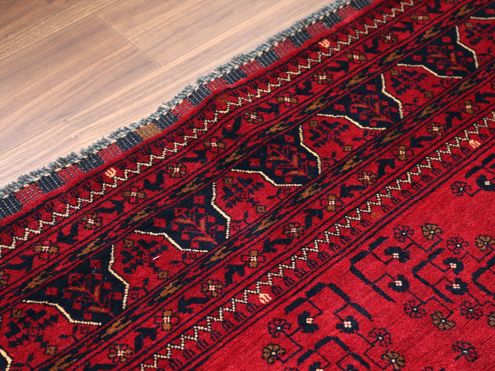 | 深い赤がどっしりとした重厚感を演出するアフガニスタン北部のクンドゥズ地方で織られた高級絨毯です。モチーフが細かいところまできれいに表現されていて、まさに洗練された1枚と言えるでしょう。 |