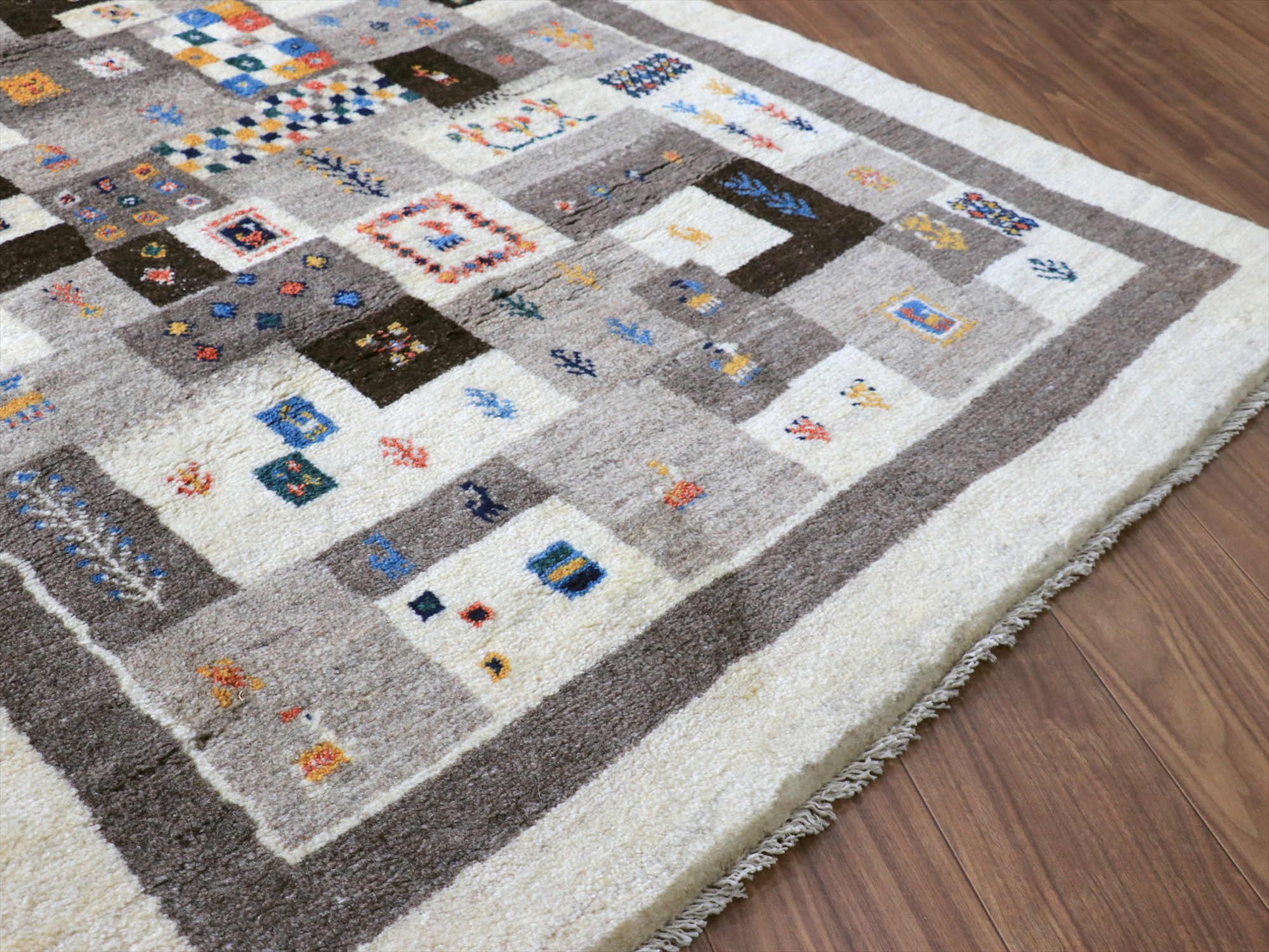 Key:ギャベ, ラグ, 手織り絨毯, 部族絨毯, 草木染, カシュカイ族, ウール製, リビングサイズ, アイボリー, グレー, 東京,中野区, ガラタバザール, Gabbeh, Tribal Rug, Hand knotted, wool, Natural dye, Shiraz, Fars, Quashkai