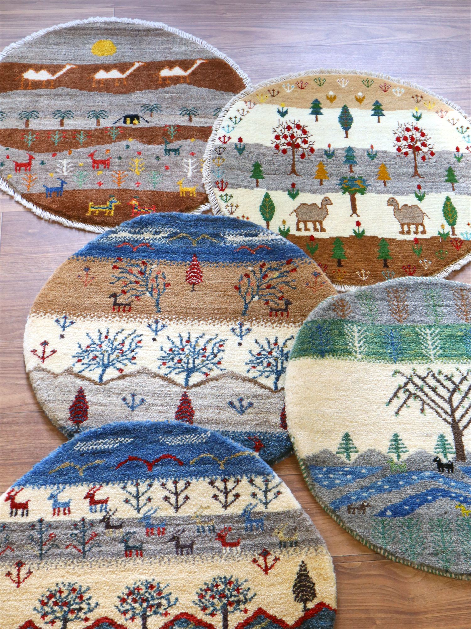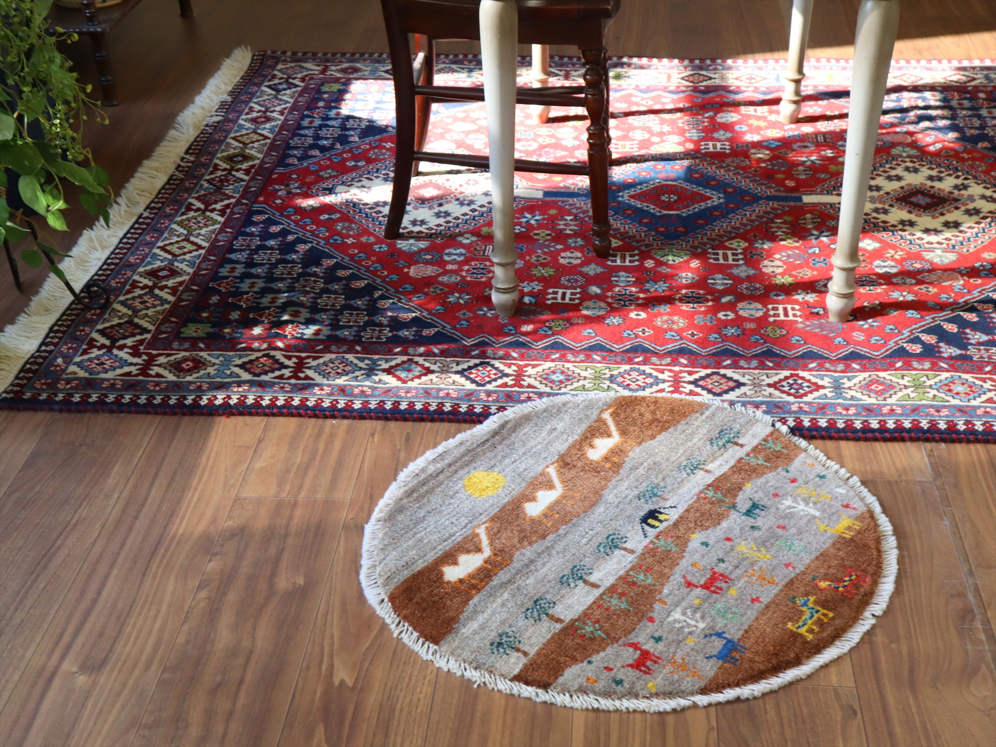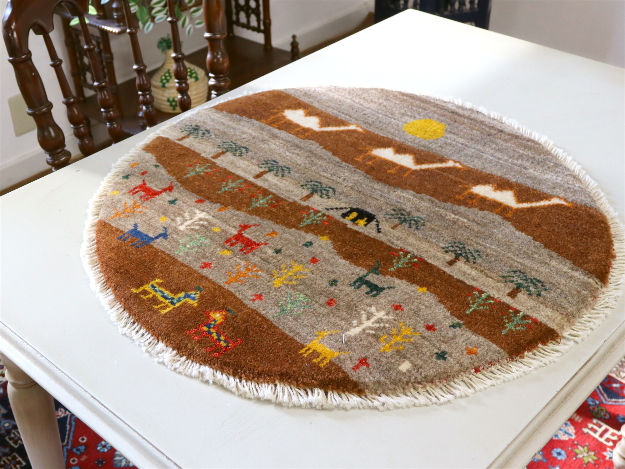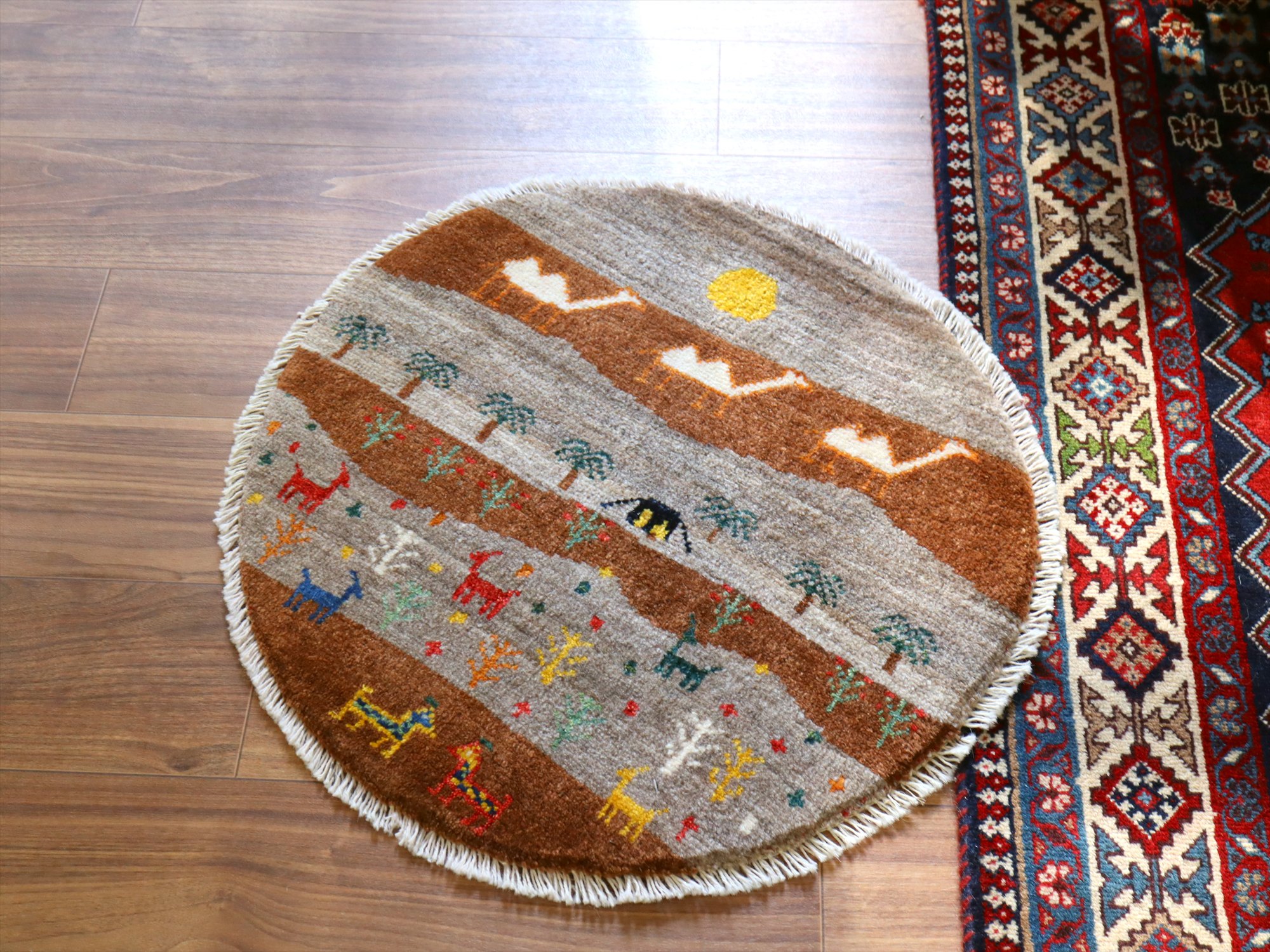 Key:Gabbeh, Shiraz, Carpet, Handmade, Hand weaven, Hand knotted, wool, Natural dye, Shiraz, Quashkai, ギャッベ, ギャベ, ラグ, まるい, 丸, 60cm, カシュカイ族, 細かい, 手織り絨毯, 草木染め, 玄関マット, ベッドサイド,