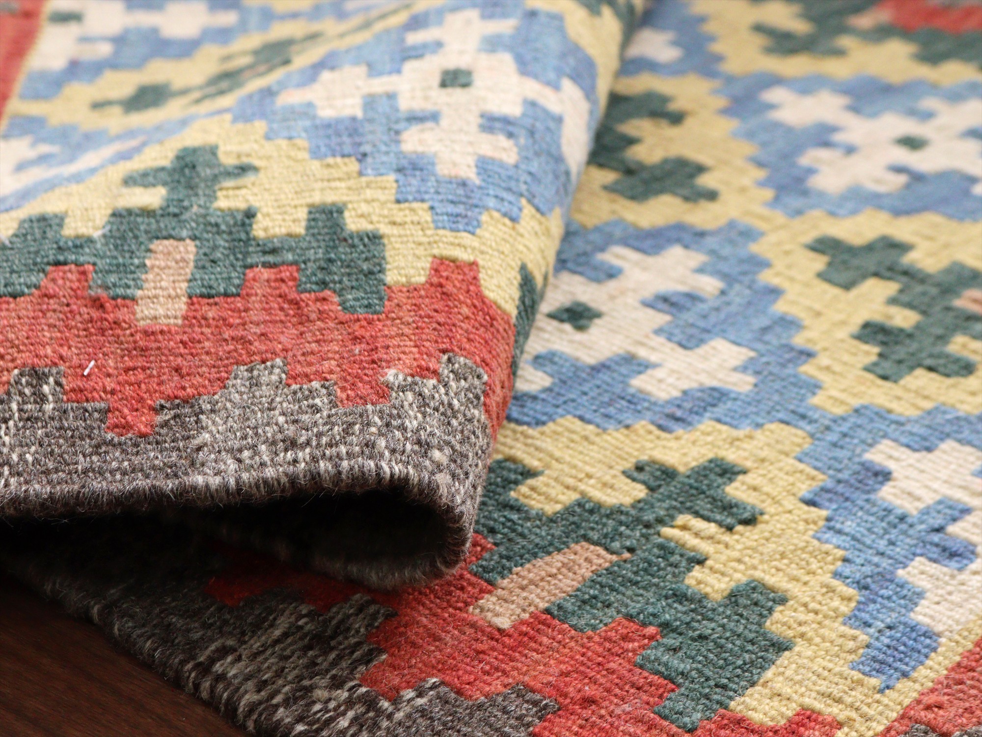 | カラフルで華やかな色使いのカシュカイ族のキリム。イラン南西部、ザクロス山脈の麓で、現在も遊牧生活を続けるカシュカイ族は、トルコ語に近い言葉を話す部族で、キリムの織りの文化も比較的トルコに近いテイストで、ユニークな幾何学模様がたくさん登場します。 |