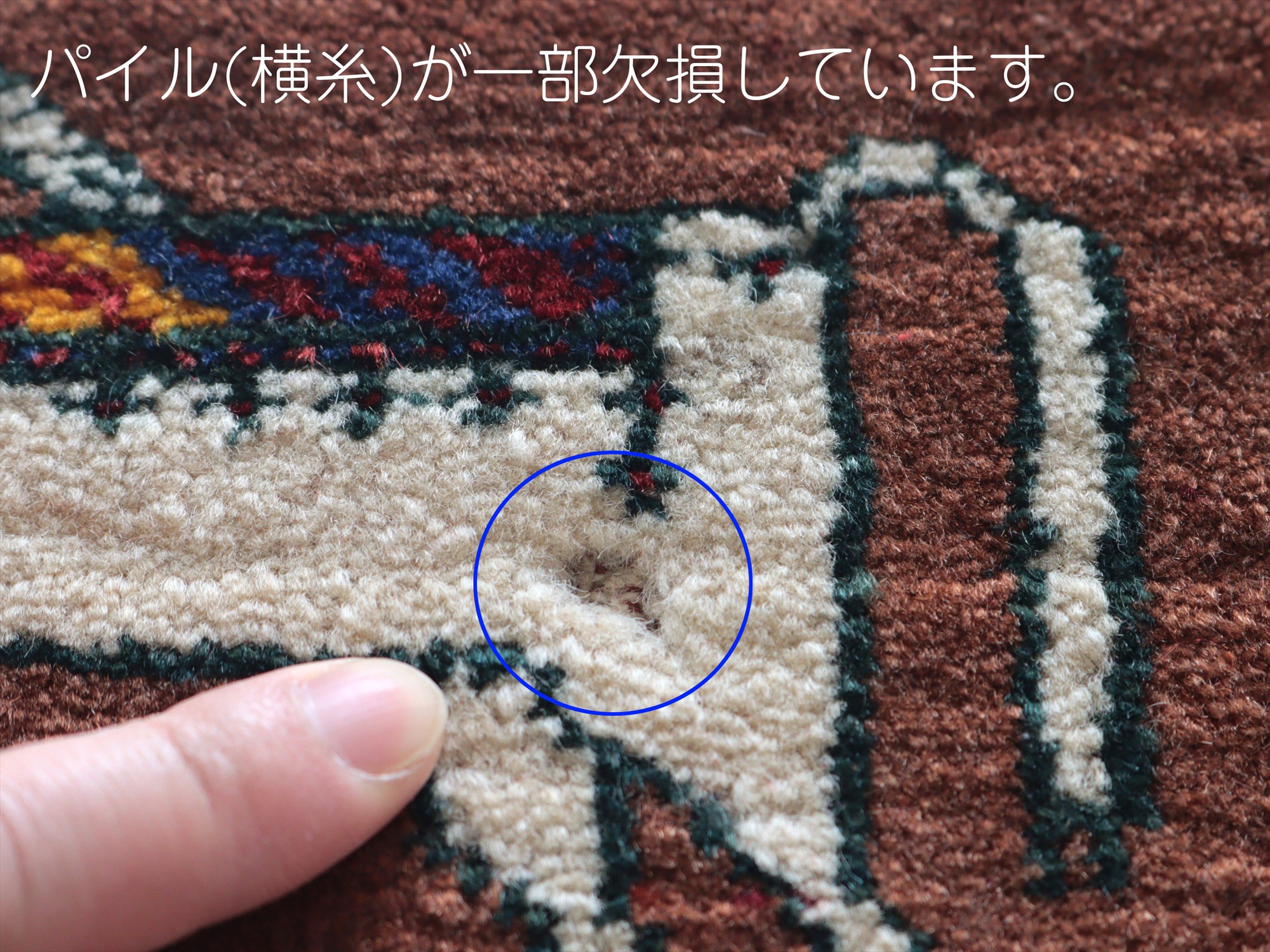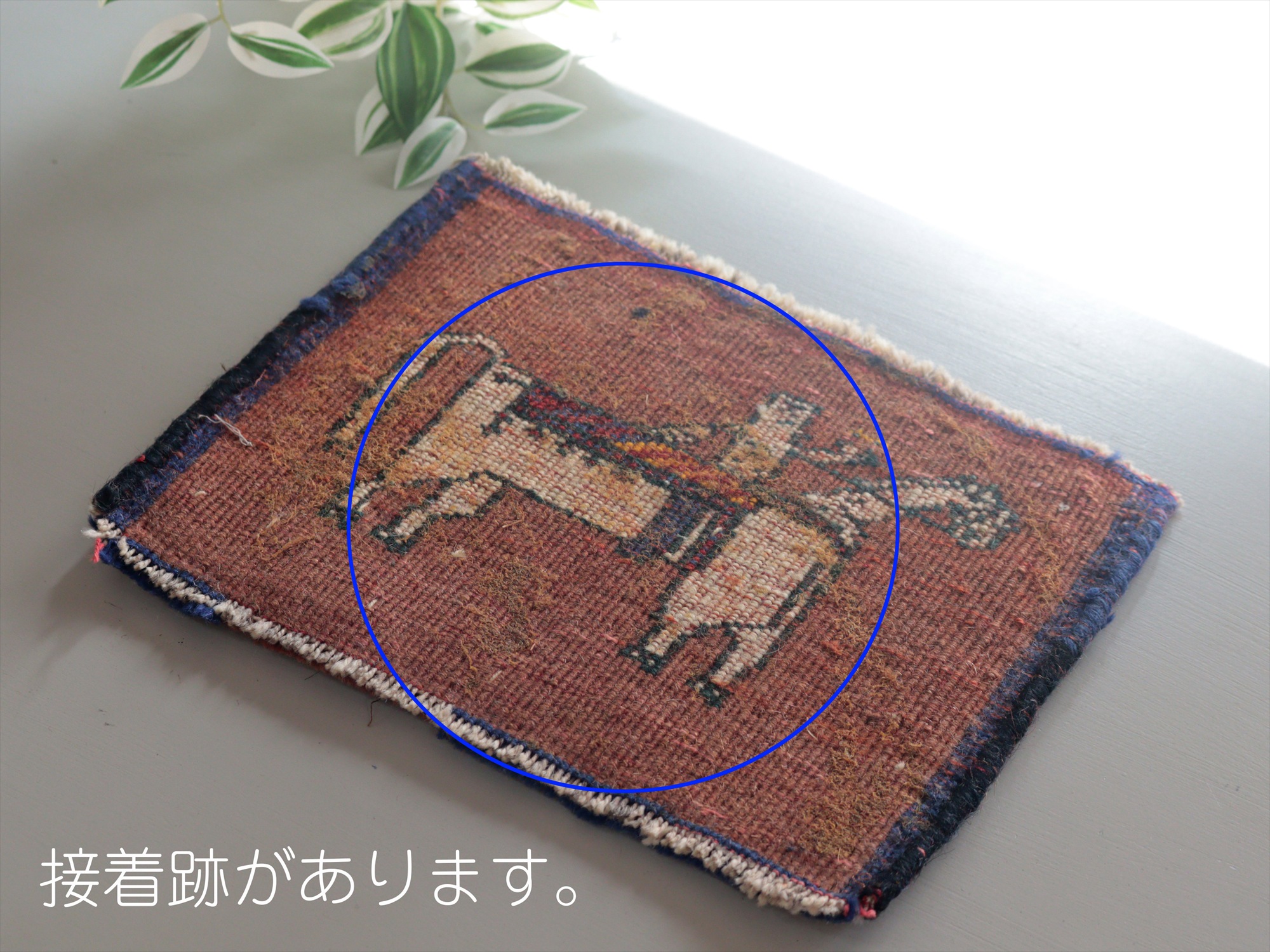 | 目の細かい織りでパイルは短め、織り地にはハリがあります。パイルに削れてしまっている箇所があります。また、裏面に接着跡が残っています(写真をご参照ください)。 |