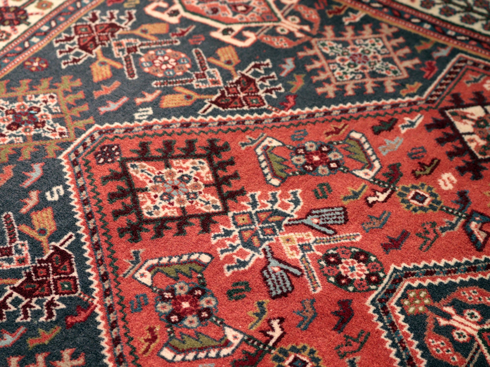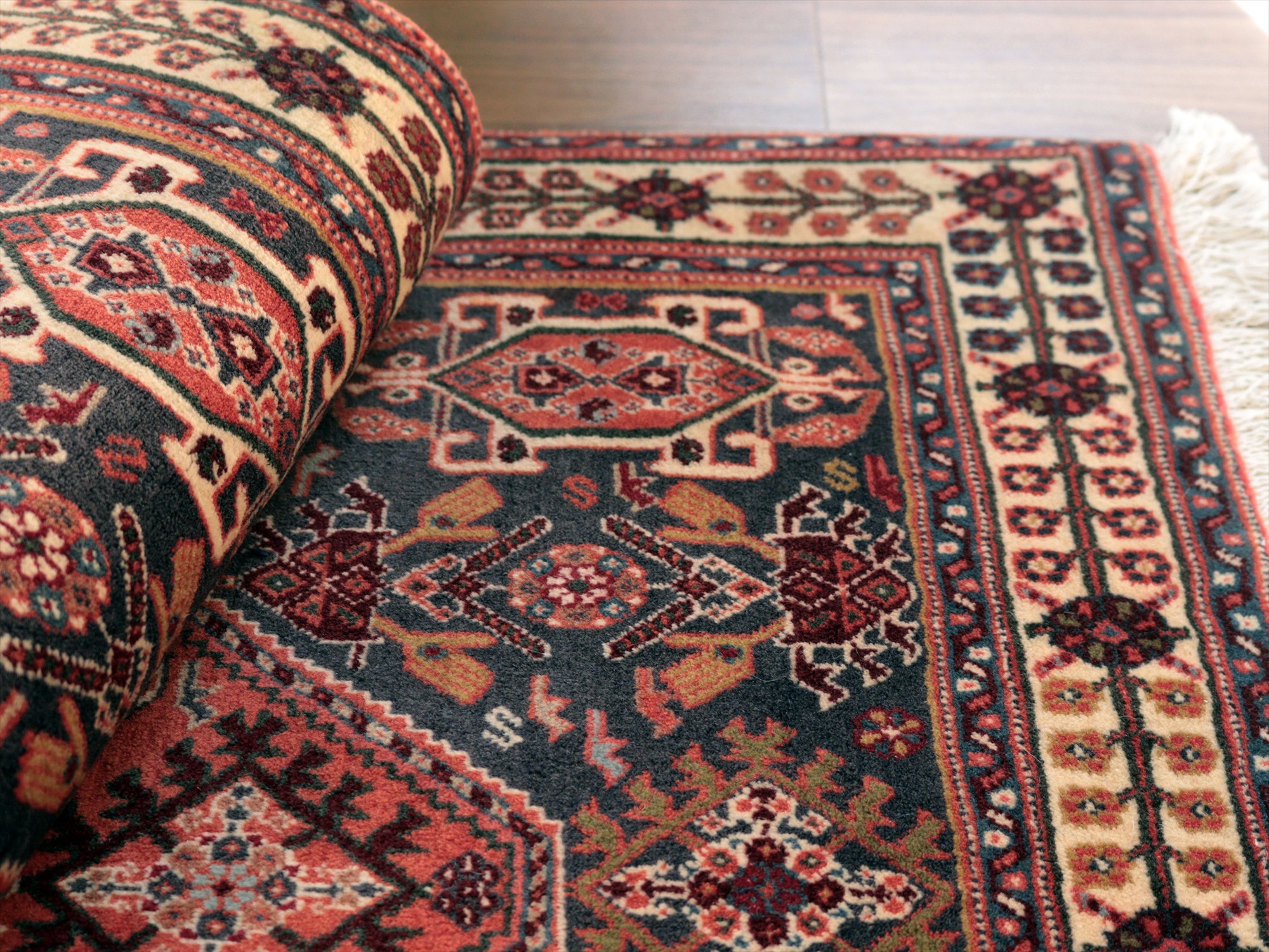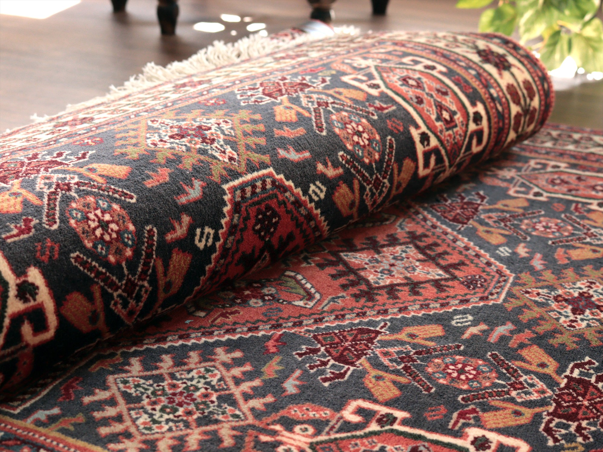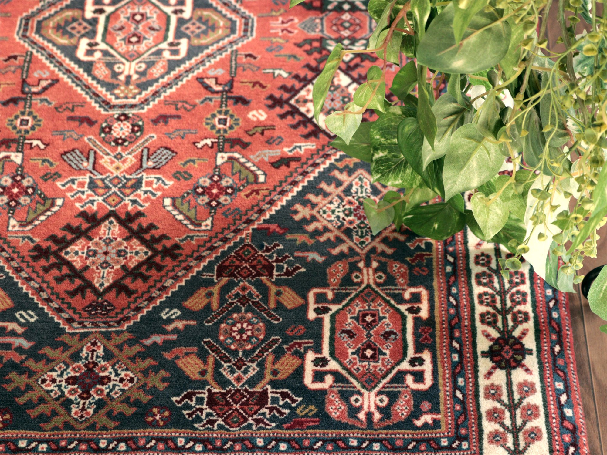 | 朱色に近いレッドと、グレーがかったネイビーの色使いで中央にメダリオンがおかれたカシュカイ族の手織り絨毯。幾何学模様や小花など、一面にモチーフがしっかりと織り込まれています。存在感を感じられる1枚ですが、発色はやや淡い色合いに抑えられているのでお部屋に程よく馴染みそうです。 |