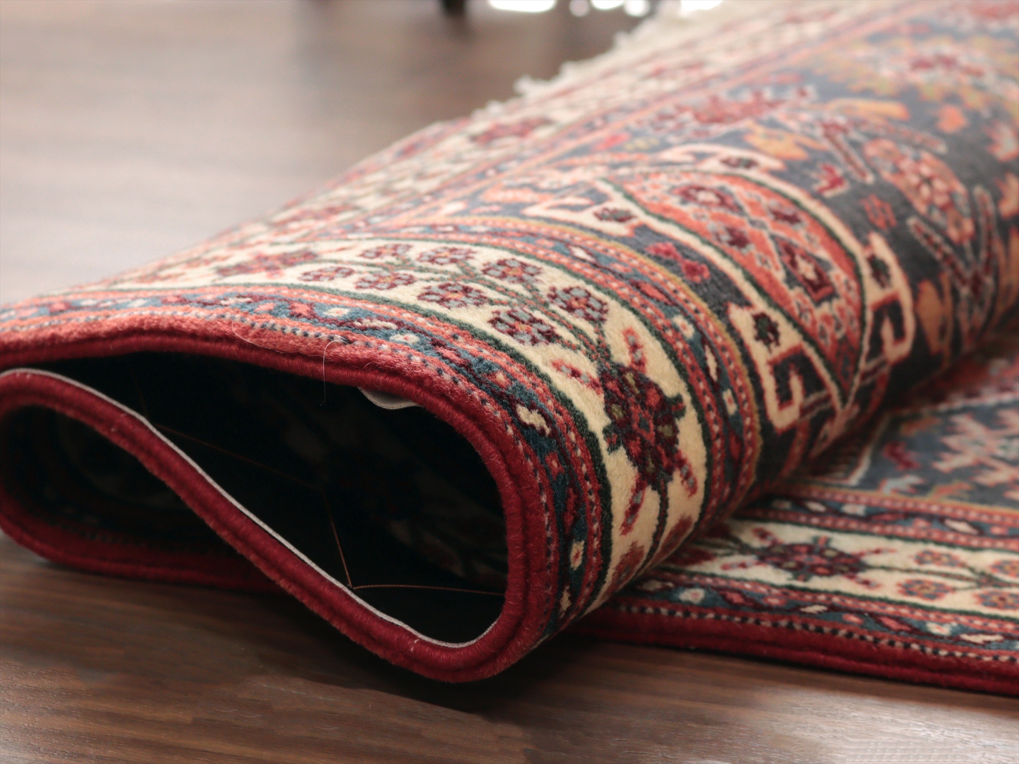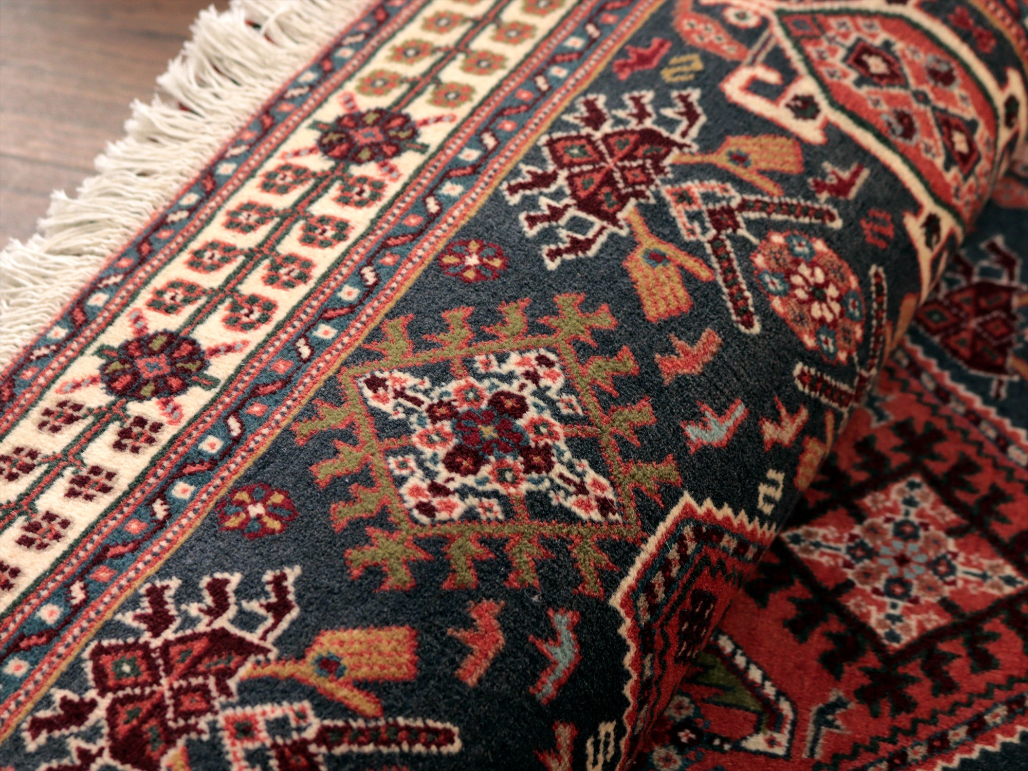 | 縦糸にコットンを使用しています。非常に細かく緻密な織りで目が詰まっていて、モチーフが精細に表現されています。パイルはふっくらとしていて、ハリのある織り地です。 【カシュクーリ】 ギャッベを織ることで知られる遊牧民・カシュカイ族のカーペット。カシュクーリは、カシュカイ族の中のさらにちいさな部族グループの名前です。 |