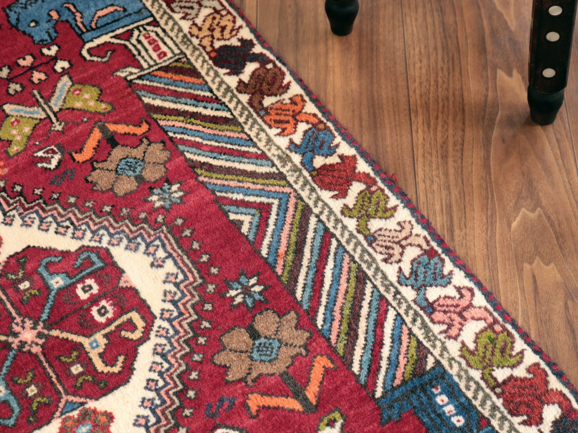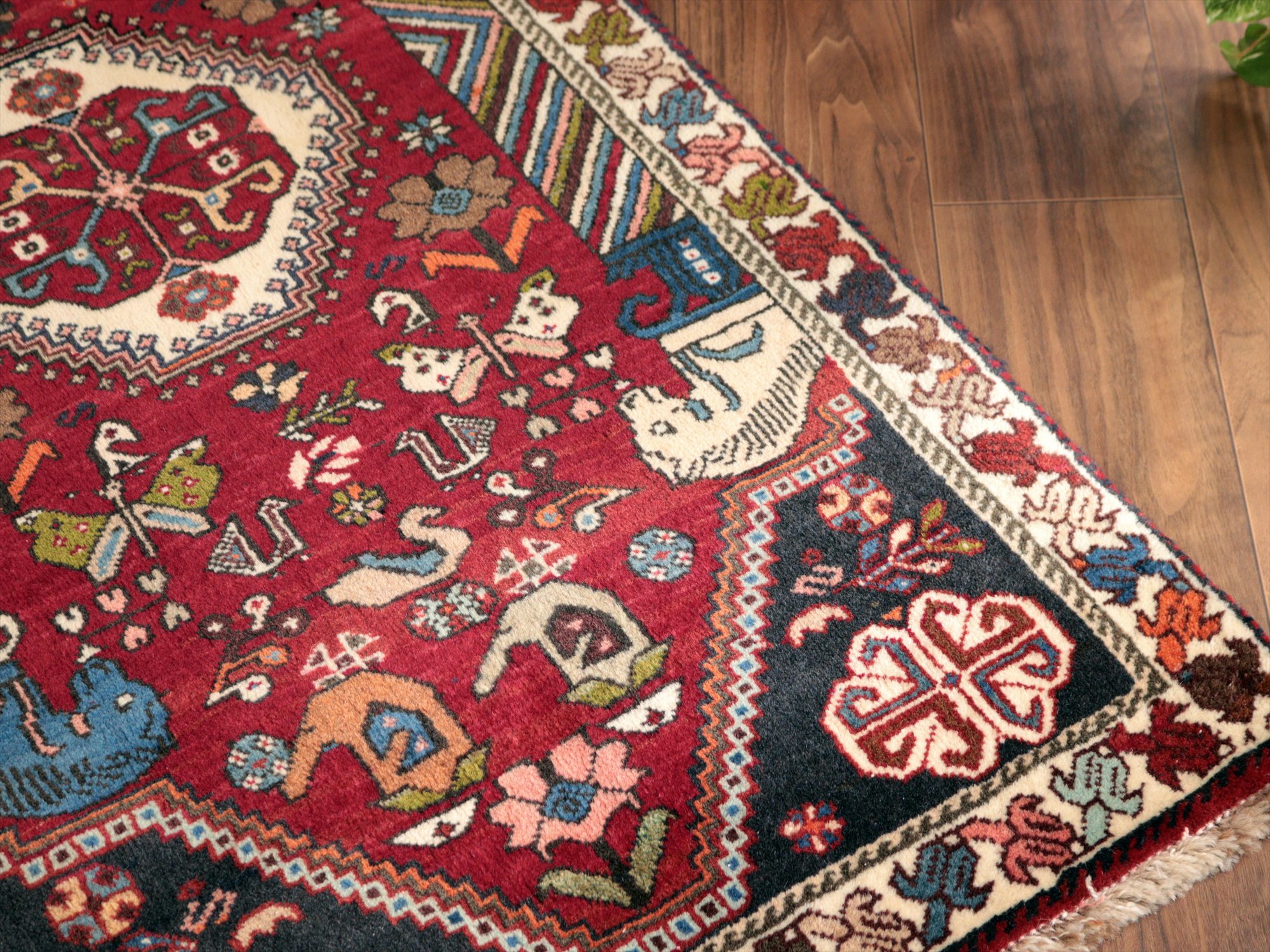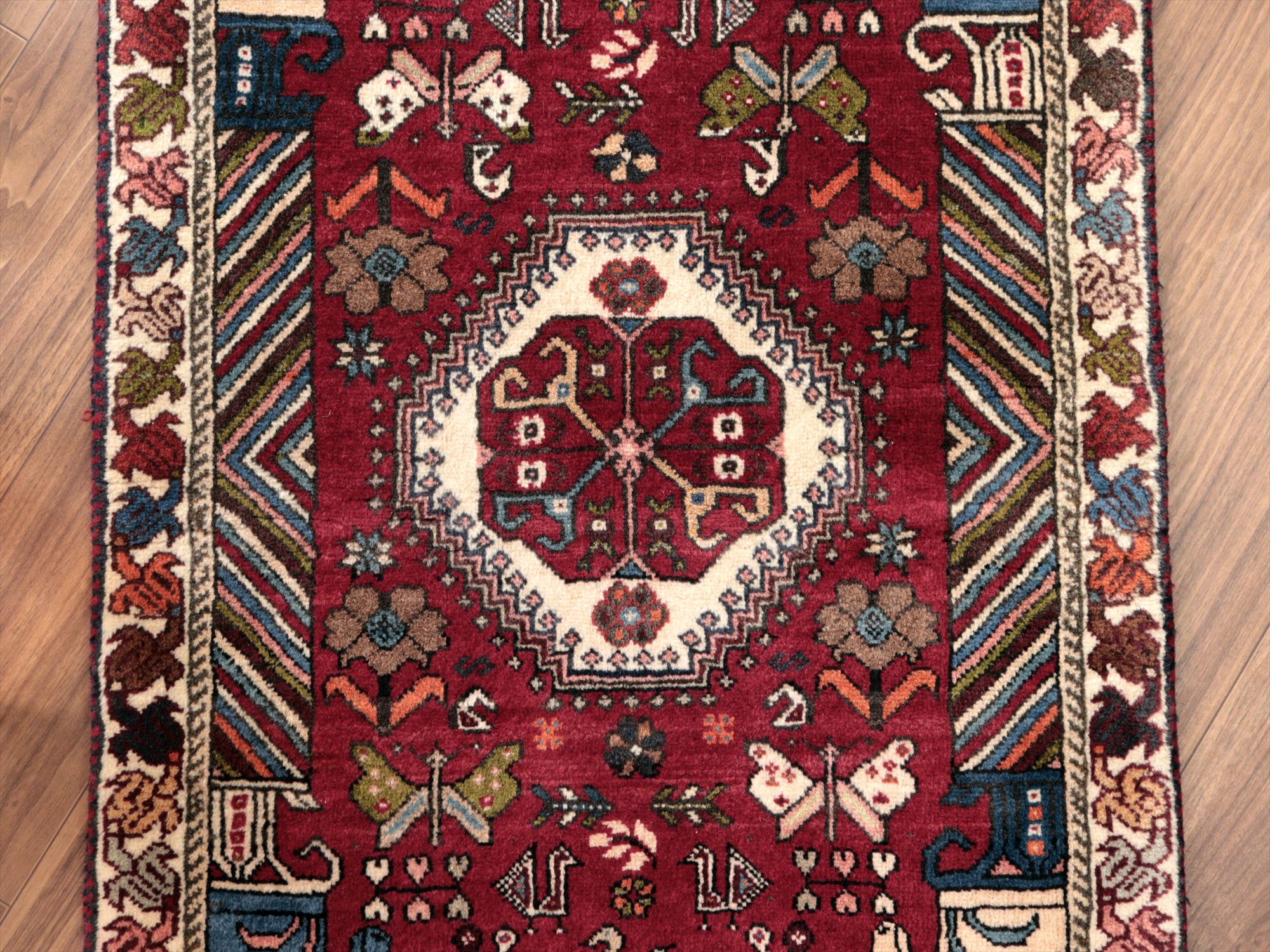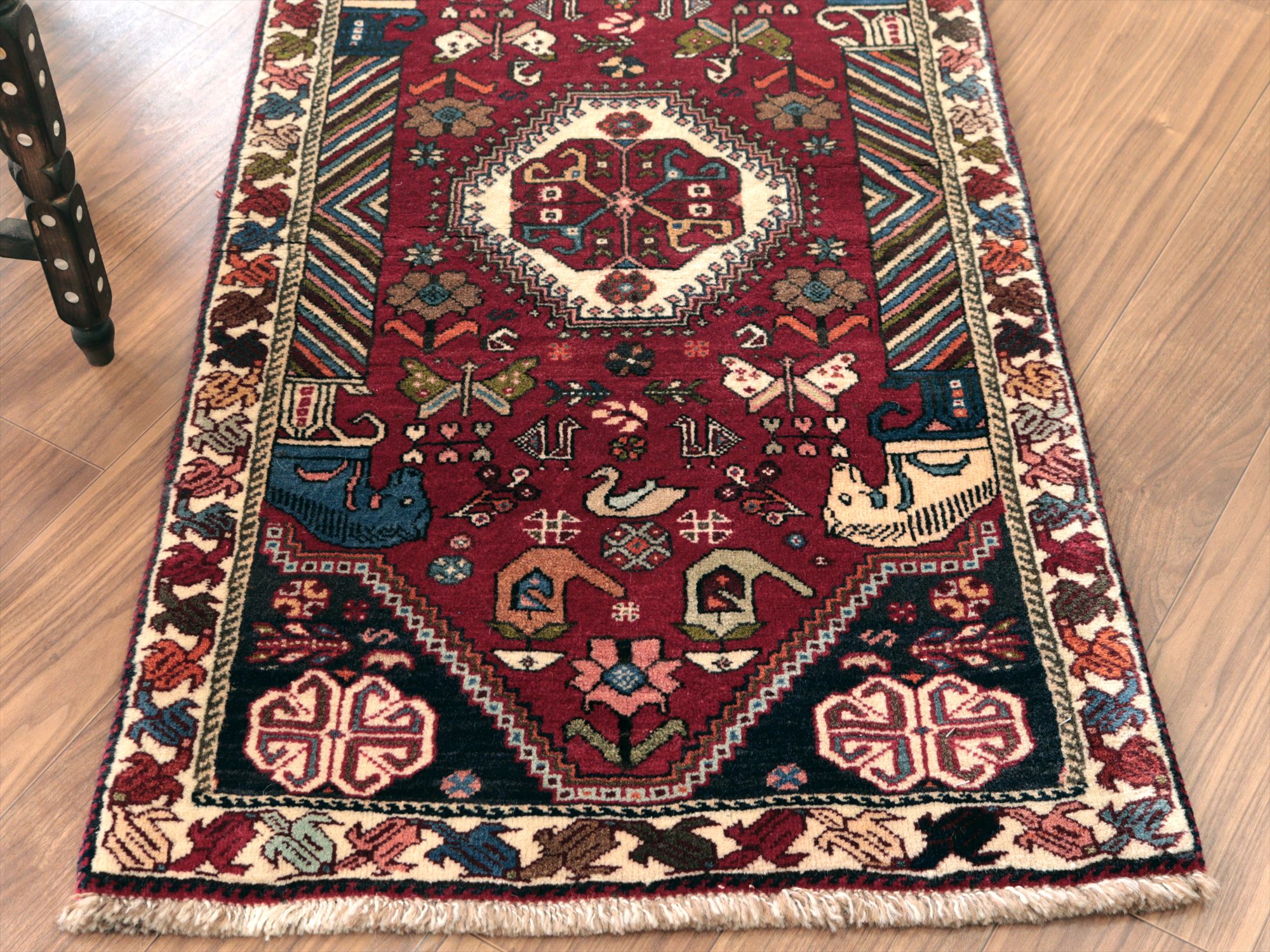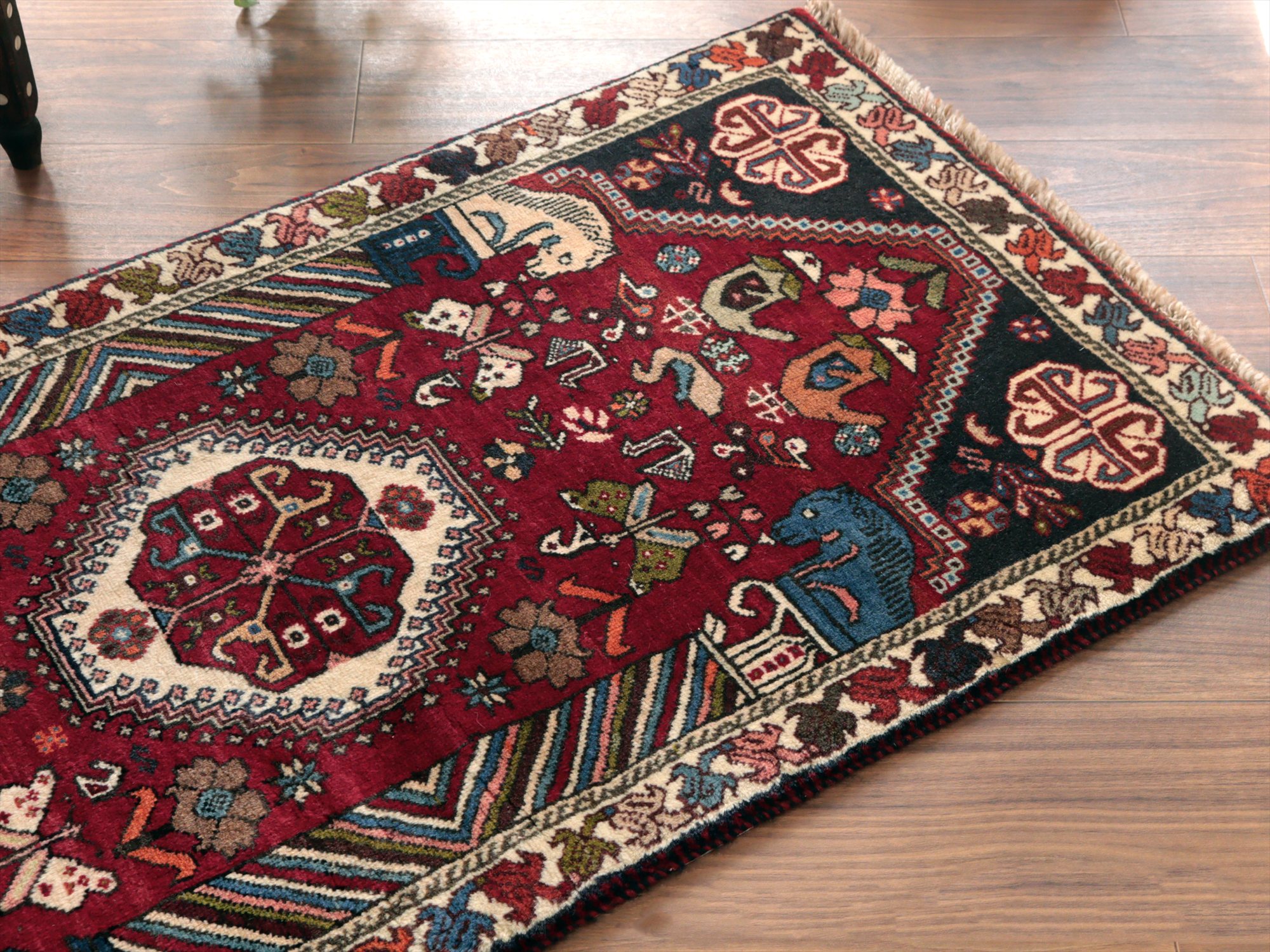 | イラン南部ファルス州で織られた伝統的なデザインの絨毯。蝶や鳥、花など様々なモチーフが織られていますが、中でも特徴的なのは、左右にあるカラフルな柱から馬の頭が出ているデザインで、これは世界遺産のペルセポリスの石柱を模したとされるものです。ボーダー(額縁)部分の花模様も、明るい色で織られていて華やかです。 |