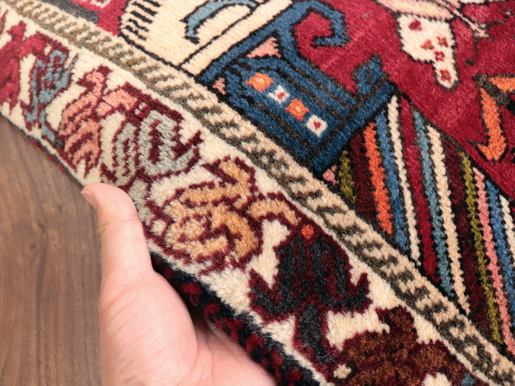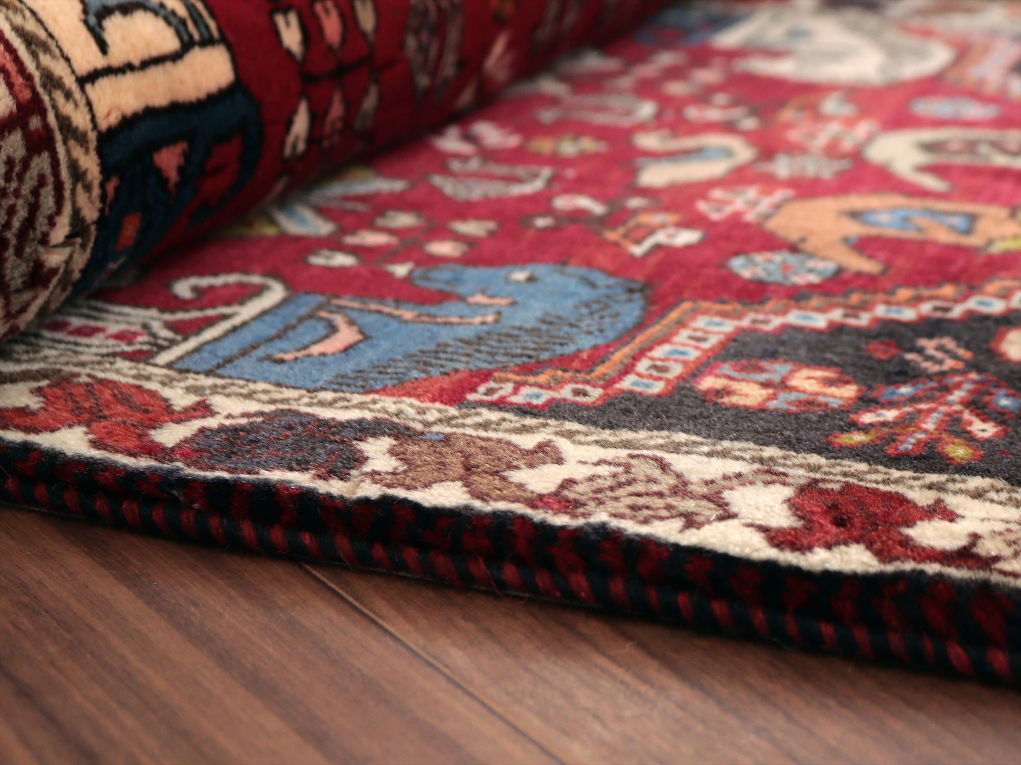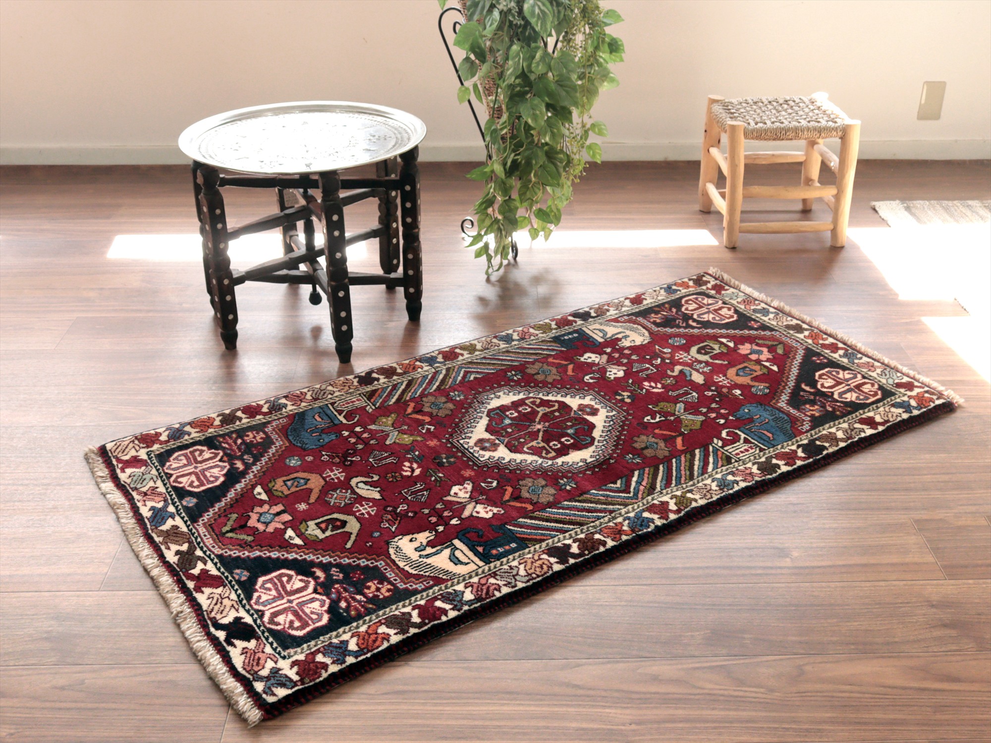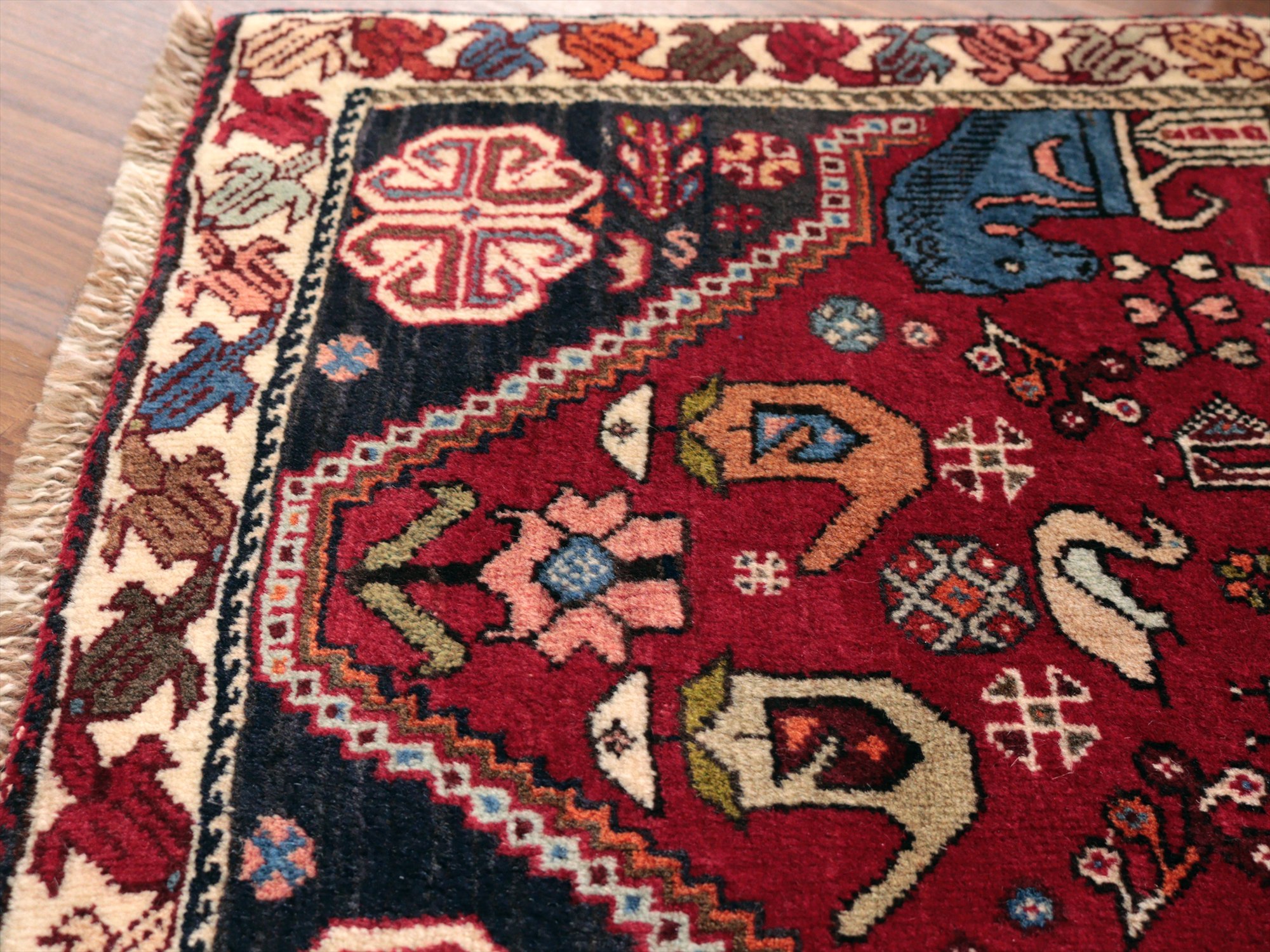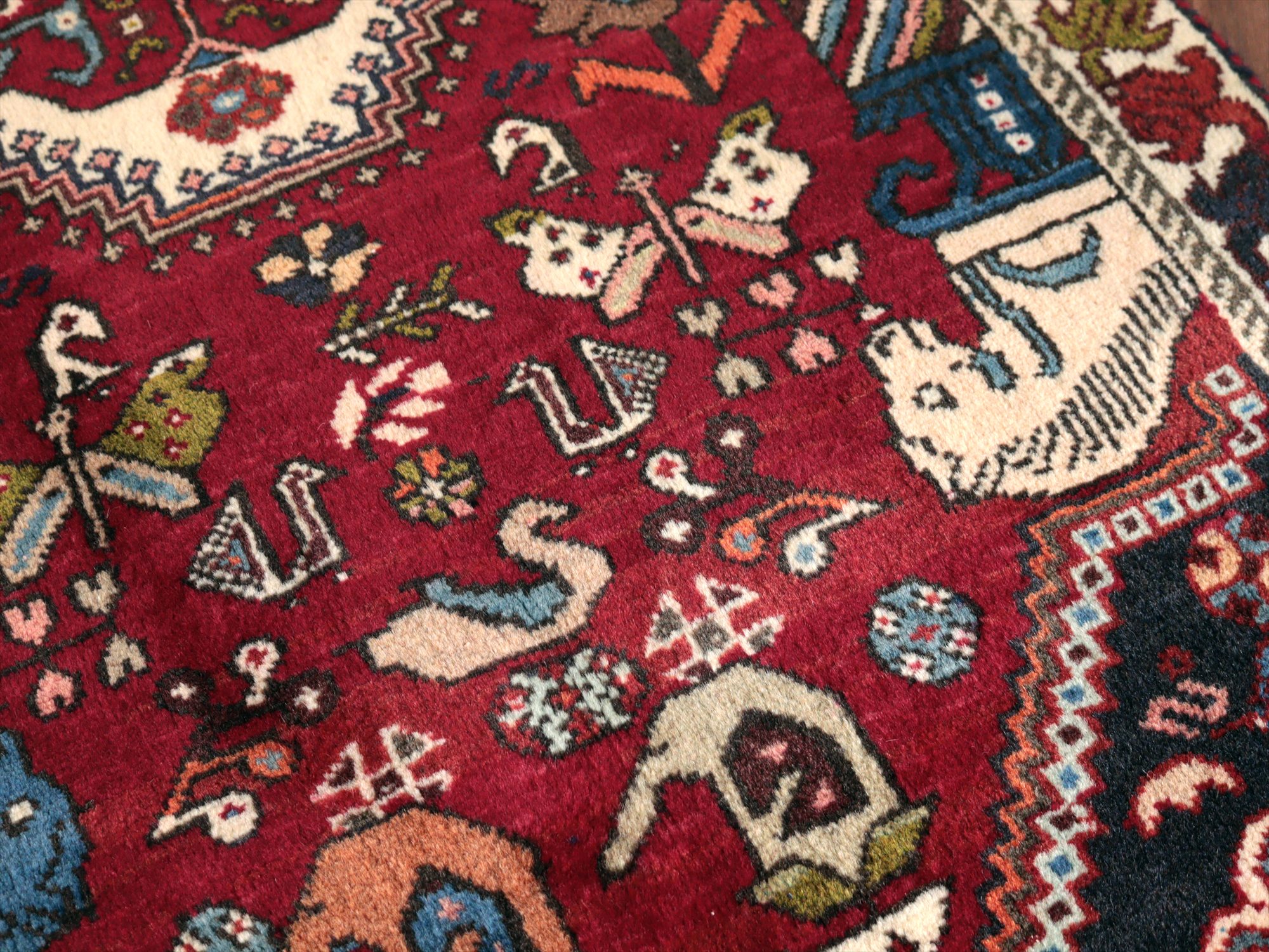 | イラン南部ファルス州で織られた伝統的なデザインの絨毯。蝶や鳥、花など様々なモチーフが織られていますが、中でも特徴的なのは、左右にあるカラフルな柱から馬の頭が出ているデザインで、これは世界遺産のペルセポリスの石柱を模したとされるものです。ボーダー(額縁)部分の花模様も、明るい色で織られていて華やかです。 |